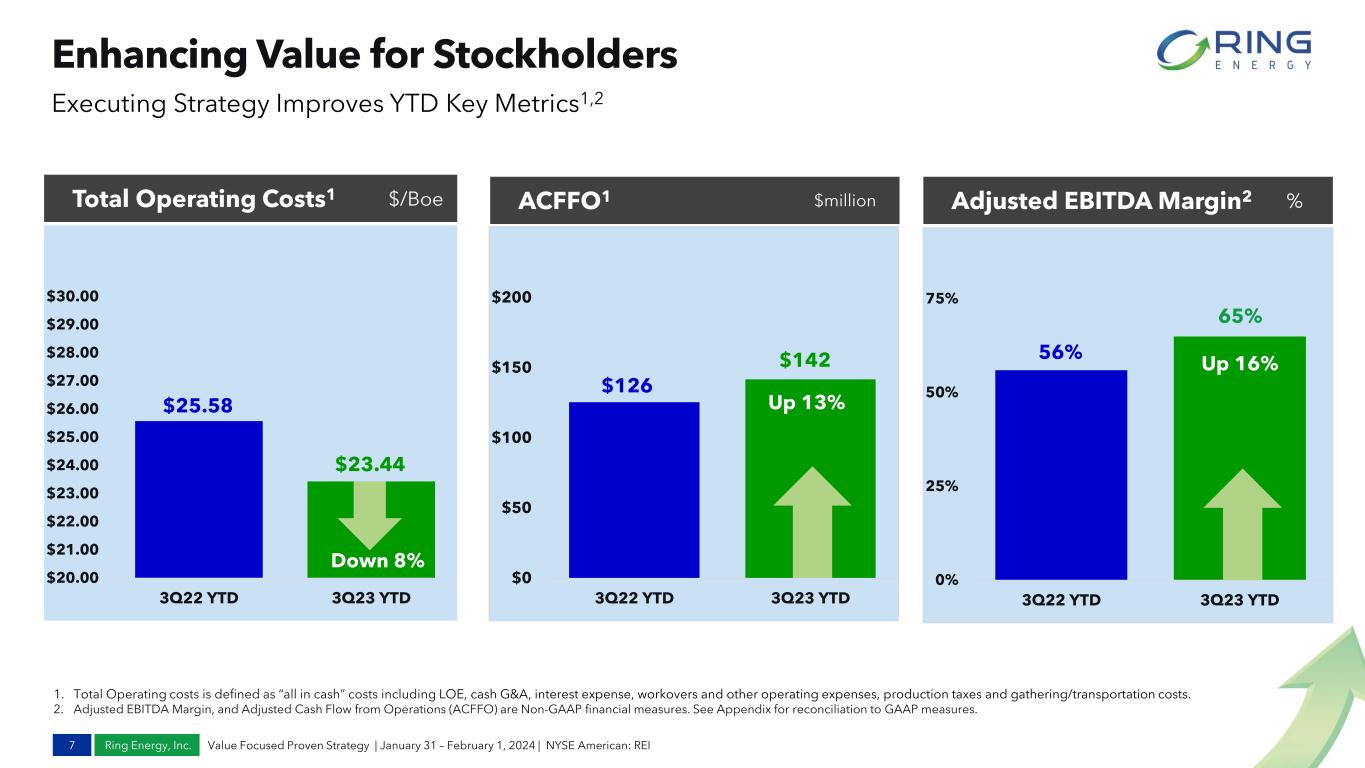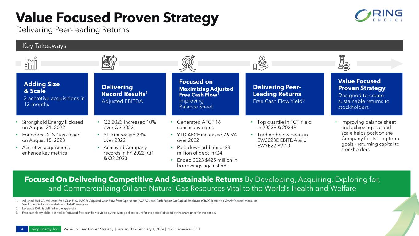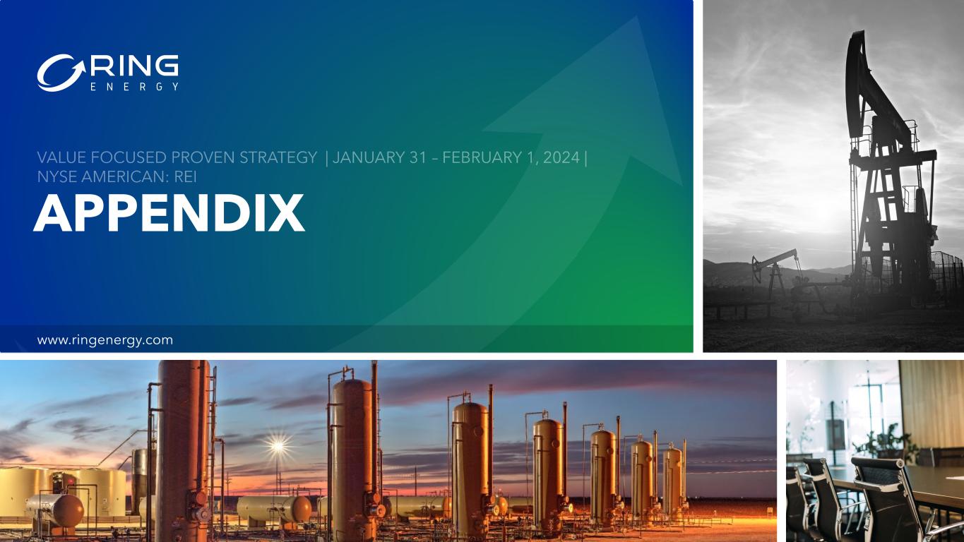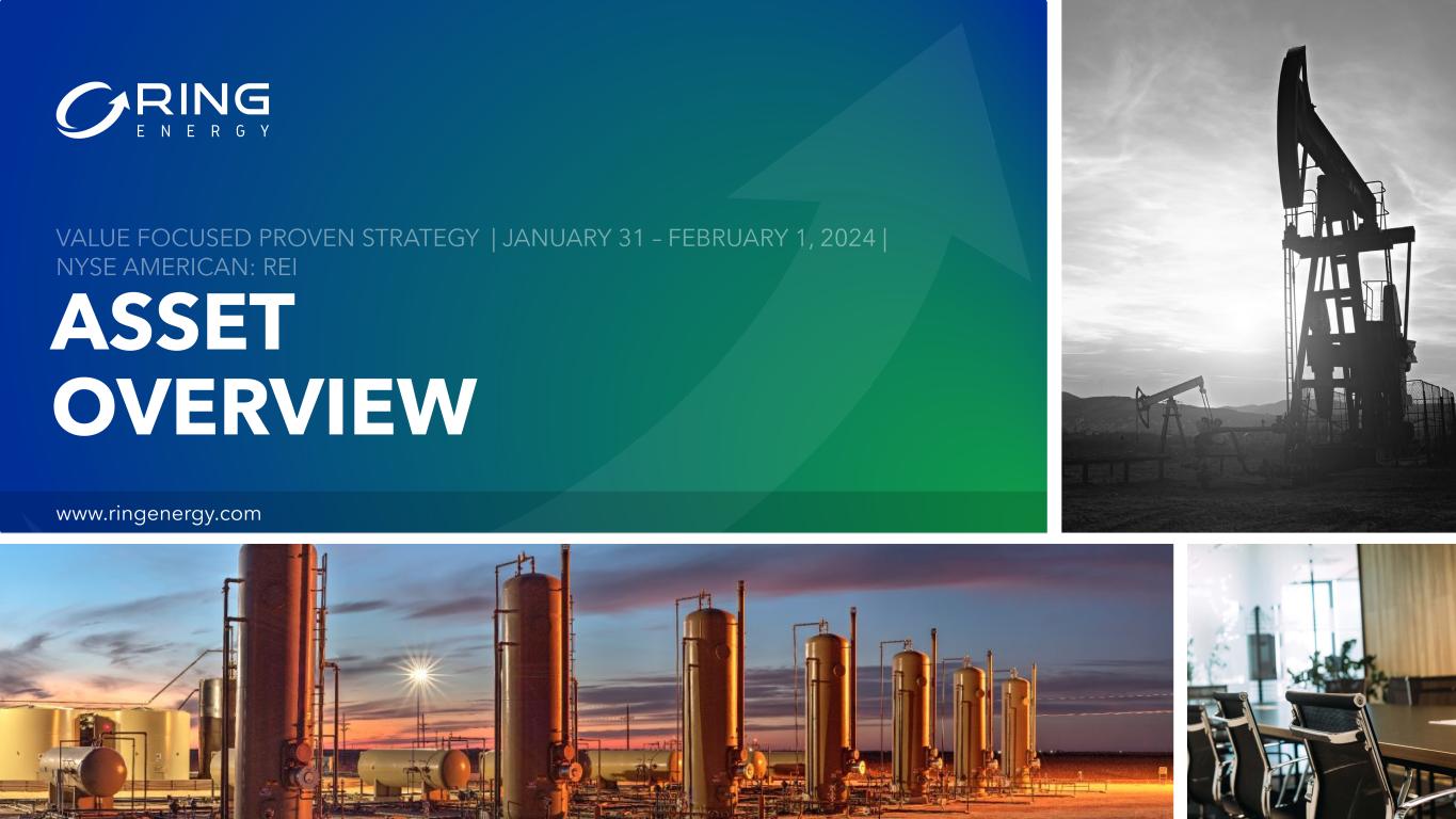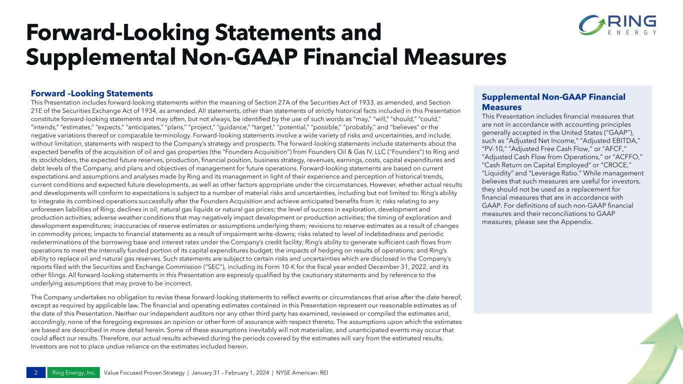 Ring Energy, Inc. Forward –Looking Statements This Presentation includes forward-looking statements within the meaning of Section 27A of the Securities Act of 1933, as amended, and Section 21E of the Securities Exchange Act of 1934, as amended. All statements, other than statements of strictly historical facts included in this Presentation constitute forward-looking statements and may often, but not always, be identified by the use of such words as “may,” “will,” “should,” “could,” “intends,” “estimates,” “expects,” “anticipates,” “plans,” “project,” “guidance,” “target,” “potential,” “possible,” “probably,” and “believes” or the negative variations thereof or comparable terminology. Forward-looking statements involve a wide variety of risks and uncertainties, and include, without limitation, statements with respect to the Company’s strategy and prospects. The forward-looking statements include statements about the expected benefits of the acquisition of oil and gas properties (the “Founders Acquisition”) from Founders Oil & Gas IV, LLC (“Founders”) to Ring and its stockholders, the expected future reserves, production, financial position, business strategy, revenues, earnings, costs, capital expenditures and debt levels of the Company, and plans and objectives of management for future operations. Forward-looking statements are based on current expectations and assumptions and analyses made by Ring and its management in light of their experience and perception of historical trends, current conditions and expected future developments, as well as other factors appropriate under the circumstances. However, whether actual results and developments will conform to expectations is subject to a number of material risks and uncertainties, including but not limited to: Ring’s ability to integrate its combined operations successfully after the Founders Acquisition and achieve anticipated benefits from it; risks relating to any unforeseen liabilities of Ring; declines in oil, natural gas liquids or natural gas prices; the level of success in exploration, development and production activities; adverse weather conditions that may negatively impact development or production activities; the timing of exploration and development expenditures; inaccuracies of reserve estimates or assumptions underlying them; revisions to reserve estimates as a result of changes in commodity prices; impacts to financial statements as a result of impairment write-downs; risks related to level of indebtedness and periodic redeterminations of the borrowing base and interest rates under the Company’s credit facility; Ring’s ability to generate sufficient cash flows from operations to meet the internally funded portion of its capital expenditures budget; the impacts of hedging on results of operations; and Ring’s ability to replace oil and natural gas reserves. Such statements are subject to certain risks and uncertainties which are disclosed in the Company’s reports filed with the Securities and Exchange Commission (“SEC”), including its Form 10-K for the fiscal year ended December 31, 2022, and its other filings. All forward-looking statements in this Presentation are expressly qualified by the cautionary statements and by reference to the underlying assumptions that may prove to be incorrect. The Company undertakes no obligation to revise these forward-looking statements to reflect events or circumstances that arise after the date hereof, except as required by applicable law. The financial and operating estimates contained in this Presentation represent our reasonable estimates as of the date of this Presentation. Neither our independent auditors nor any other third party has examined, reviewed or compiled the estimates and, accordingly, none of the foregoing expresses an opinion or other form of assurance with respect thereto. The assumptions upon which the estimates are based are described in more detail herein. Some of these assumptions inevitably will not materialize, and unanticipated events may occur that could affect our results. Therefore, our actual results achieved during the periods covered by the estimates will vary from the estimated results. Investors are not to place undue reliance on the estimates included herein. Forward-Looking Statements and Supplemental Non-GAAP Financial Measures 2 Value Focused Proven Strategy | January 31 – February 1, 2024 | NYSE American: REI Supplemental Non-GAAP Financial Measures This Presentation includes financial measures that are not in accordance with accounting principles generally accepted in the United States (“GAAP”), such as “Adjusted Net Income,” “Adjusted EBITDA,” “PV-10,” “Adjusted Free Cash Flow,” or “AFCF,” “Adjusted Cash Flow from Operations,” or “ACFFO,” “Cash Return on Capital Employed” or “CROCE,” “Liquidity” and “Leverage Ratio.” While management believes that such measures are useful for investors, they should not be used as a replacement for financial measures that are in accordance with GAAP. For definitions of such non-GAAP financial measures and their reconciliations to GAAP measures, please see the Appendix.