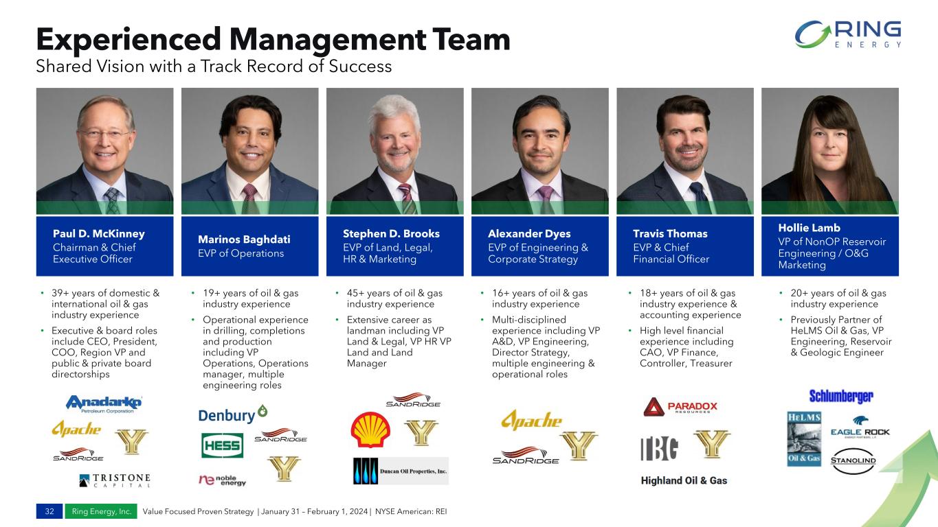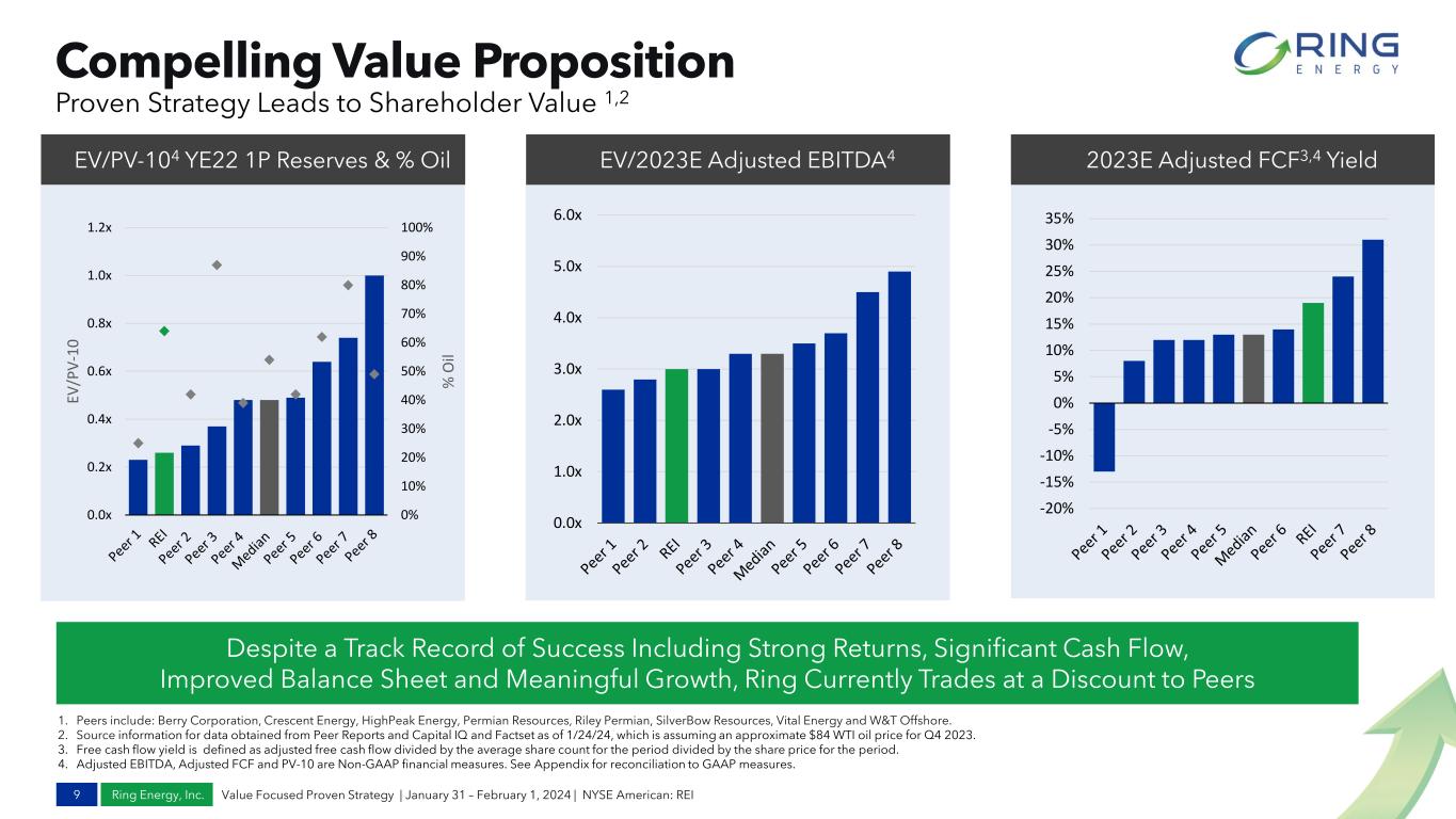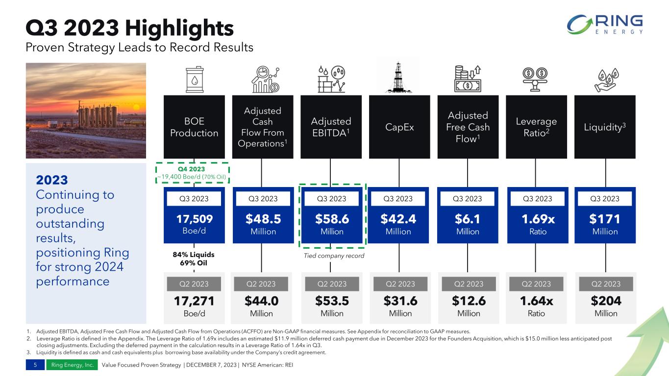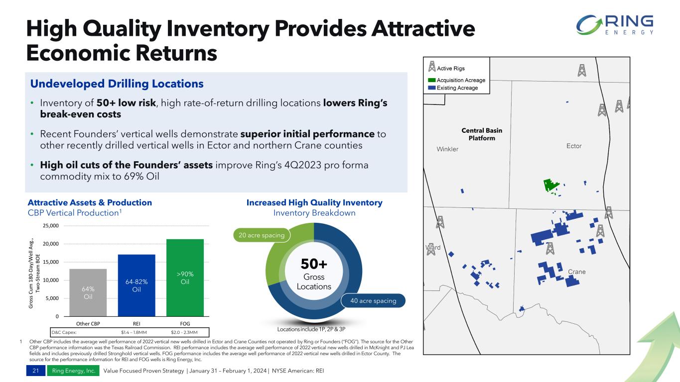 Ring Energy, Inc. Forward –Looking Statements This Presentation includes forward-looking statements within the meaning of Section 27A of the Securities Act of 1933, as amended, and Section 21E of the Securities Exchange Act of 1934, as amended. All statements, other than statements of strictly historical facts included in this Presentation constitute forward-looking statements and may often, but not always, be identified by the use of such words as “may,” “will,” “should,” “could,” “intends,” “estimates,” “expects,” “anticipates,” “plans,” “project,” “guidance,” “target,” “potential,” “possible,” “probably,” and “believes” or the negative variations thereof or comparable terminology. Forward-looking statements involve a wide variety of risks and uncertainties, and include, without limitation, statements with respect to the Company’s strategy and prospects. The forward-looking statements include statements about the expected benefits of the acquisition of oil and gas properties (the “Founders Acquisition”) from Founders Oil & Gas IV, LLC (“Founders”) to Ring and its stockholders, the expected future reserves, production, financial position, business strategy, revenues, earnings, costs, capital expenditures and debt levels of the Company, and plans and objectives of management for future operations. Forward-looking statements are based on current expectations and assumptions and analyses made by Ring and its management in light of their experience and perception of historical trends, current conditions and expected future developments, as well as other factors appropriate under the circumstances. However, whether actual results and developments will conform to expectations is subject to a number of material risks and uncertainties, including but not limited to: Ring’s ability to integrate its combined operations successfully after the Founders Acquisition and achieve anticipated benefits from it; risks relating to any unforeseen liabilities of Ring; declines in oil, natural gas liquids or natural gas prices; the level of success in exploration, development and production activities; adverse weather conditions that may negatively impact development or production activities; the timing of exploration and development expenditures; inaccuracies of reserve estimates or assumptions underlying them; revisions to reserve estimates as a result of changes in commodity prices; impacts to financial statements as a result of impairment write-downs; risks related to level of indebtedness and periodic redeterminations of the borrowing base and interest rates under the Company’s credit facility; Ring’s ability to generate sufficient cash flows from operations to meet the internally funded portion of its capital expenditures budget; the impacts of hedging on results of operations; and Ring’s ability to replace oil and natural gas reserves. Such statements are subject to certain risks and uncertainties which are disclosed in the Company’s reports filed with the Securities and Exchange Commission (“SEC”), including its Form 10-K for the fiscal year ended December 31, 2022, and its other filings. All forward-looking statements in this Presentation are expressly qualified by the cautionary statements and by reference to the underlying assumptions that may prove to be incorrect. The Company undertakes no obligation to revise these forward-looking statements to reflect events or circumstances that arise after the date hereof, except as required by applicable law. The financial and operating estimates contained in this Presentation represent our reasonable estimates as of the date of this Presentation. Neither our independent auditors nor any other third party has examined, reviewed or compiled the estimates and, accordingly, none of the foregoing expresses an opinion or other form of assurance with respect thereto. The assumptions upon which the estimates are based are described in more detail herein. Some of these assumptions inevitably will not materialize, and unanticipated events may occur that could affect our results. Therefore, our actual results achieved during the periods covered by the estimates will vary from the estimated results. Investors are not to place undue reliance on the estimates included herein. Forward-Looking Statements and Supplemental Non-GAAP Financial Measures 2 Value Focused Proven Strategy | January 31 – February 1, 2024 | NYSE American: REI Supplemental Non-GAAP Financial Measures This Presentation includes financial measures that are not in accordance with accounting principles generally accepted in the United States (“GAAP”), such as “Adjusted Net Income,” “Adjusted EBITDA,” “PV-10,” “Adjusted Free Cash Flow,” or “AFCF,” “Adjusted Cash Flow from Operations,” or “ACFFO,” “Cash Return on Capital Employed” or “CROCE,” “Liquidity” and “Leverage Ratio.” While management believes that such measures are useful for investors, they should not be used as a replacement for financial measures that are in accordance with GAAP. For definitions of such non-GAAP financial measures and their reconciliations to GAAP measures, please see the Appendix.