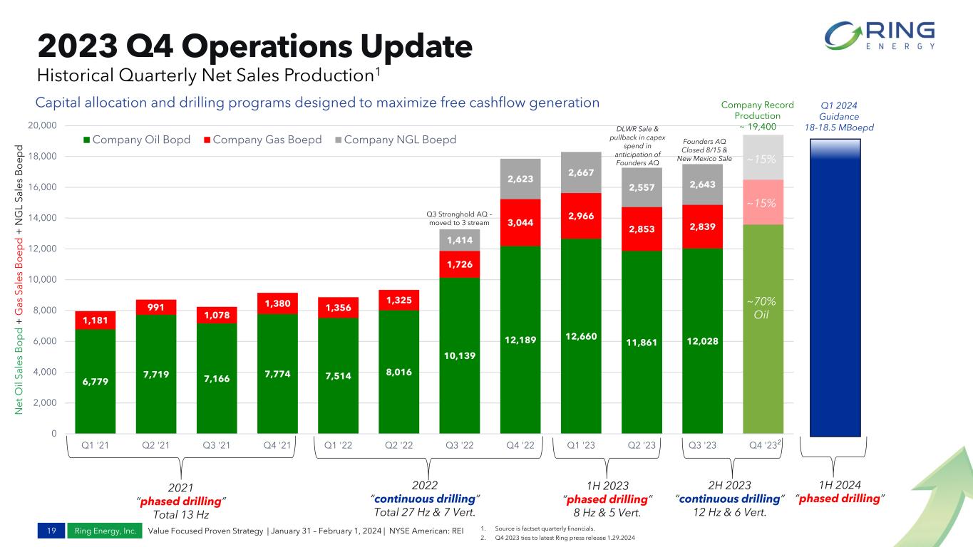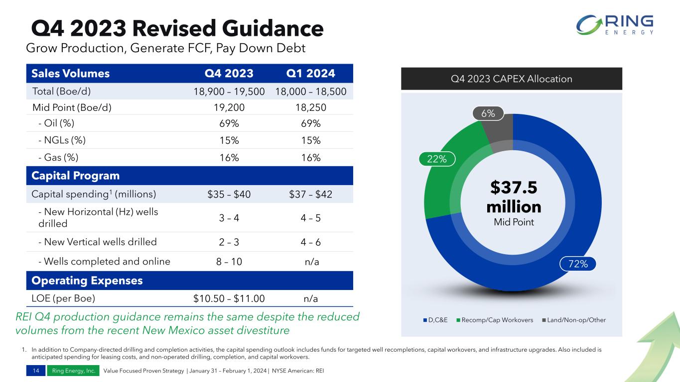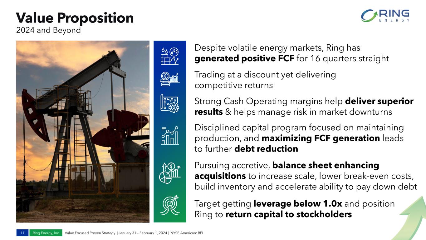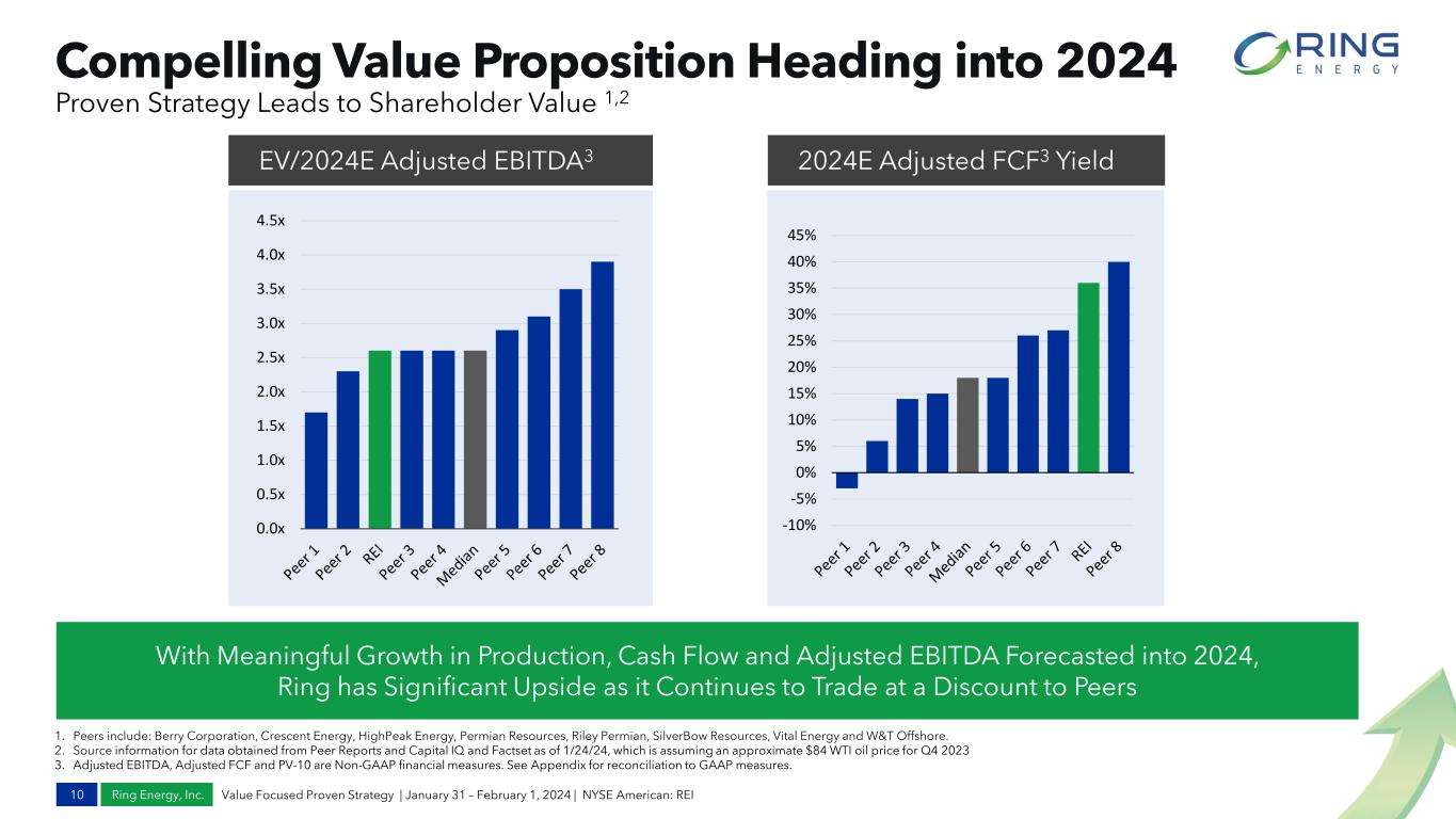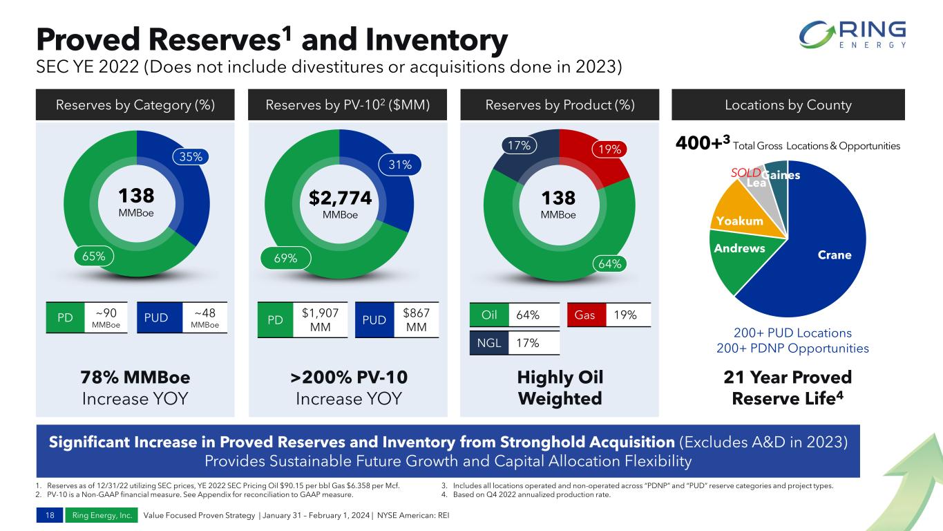 Ring Energy, Inc. Forward –Looking Statements This Presentation includes forward-looking statements within the meaning of Section 27A of the Securities Act of 1933, as amended, and Section 21E of the Securities Exchange Act of 1934, as amended. All statements, other than statements of strictly historical facts included in this Presentation constitute forward-looking statements and may often, but not always, be identified by the use of such words as “may,” “will,” “should,” “could,” “intends,” “estimates,” “expects,” “anticipates,” “plans,” “project,” “guidance,” “target,” “potential,” “possible,” “probably,” and “believes” or the negative variations thereof or comparable terminology. Forward-looking statements involve a wide variety of risks and uncertainties, and include, without limitation, statements with respect to the Company’s strategy and prospects. The forward-looking statements include statements about the expected benefits of the acquisition of oil and gas properties (the “Founders Acquisition”) from Founders Oil & Gas IV, LLC (“Founders”) to Ring and its stockholders, the expected future reserves, production, financial position, business strategy, revenues, earnings, costs, capital expenditures and debt levels of the Company, and plans and objectives of management for future operations. Forward-looking statements are based on current expectations and assumptions and analyses made by Ring and its management in light of their experience and perception of historical trends, current conditions and expected future developments, as well as other factors appropriate under the circumstances. However, whether actual results and developments will conform to expectations is subject to a number of material risks and uncertainties, including but not limited to: Ring’s ability to integrate its combined operations successfully after the Founders Acquisition and achieve anticipated benefits from it; risks relating to any unforeseen liabilities of Ring; declines in oil, natural gas liquids or natural gas prices; the level of success in exploration, development and production activities; adverse weather conditions that may negatively impact development or production activities; the timing of exploration and development expenditures; inaccuracies of reserve estimates or assumptions underlying them; revisions to reserve estimates as a result of changes in commodity prices; impacts to financial statements as a result of impairment write-downs; risks related to level of indebtedness and periodic redeterminations of the borrowing base and interest rates under the Company’s credit facility; Ring’s ability to generate sufficient cash flows from operations to meet the internally funded portion of its capital expenditures budget; the impacts of hedging on results of operations; and Ring’s ability to replace oil and natural gas reserves. Such statements are subject to certain risks and uncertainties which are disclosed in the Company’s reports filed with the Securities and Exchange Commission (“SEC”), including its Form 10-K for the fiscal year ended December 31, 2022, and its other filings. All forward-looking statements in this Presentation are expressly qualified by the cautionary statements and by reference to the underlying assumptions that may prove to be incorrect. The Company undertakes no obligation to revise these forward-looking statements to reflect events or circumstances that arise after the date hereof, except as required by applicable law. The financial and operating estimates contained in this Presentation represent our reasonable estimates as of the date of this Presentation. Neither our independent auditors nor any other third party has examined, reviewed or compiled the estimates and, accordingly, none of the foregoing expresses an opinion or other form of assurance with respect thereto. The assumptions upon which the estimates are based are described in more detail herein. Some of these assumptions inevitably will not materialize, and unanticipated events may occur that could affect our results. Therefore, our actual results achieved during the periods covered by the estimates will vary from the estimated results. Investors are not to place undue reliance on the estimates included herein. Forward-Looking Statements and Supplemental Non-GAAP Financial Measures 2 Value Focused Proven Strategy | January 31 – February 1, 2024 | NYSE American: REI Supplemental Non-GAAP Financial Measures This Presentation includes financial measures that are not in accordance with accounting principles generally accepted in the United States (“GAAP”), such as “Adjusted Net Income,” “Adjusted EBITDA,” “PV-10,” “Adjusted Free Cash Flow,” or “AFCF,” “Adjusted Cash Flow from Operations,” or “ACFFO,” “Cash Return on Capital Employed” or “CROCE,” “Liquidity” and “Leverage Ratio.” While management believes that such measures are useful for investors, they should not be used as a replacement for financial measures that are in accordance with GAAP. For definitions of such non-GAAP financial measures and their reconciliations to GAAP measures, please see the Appendix.