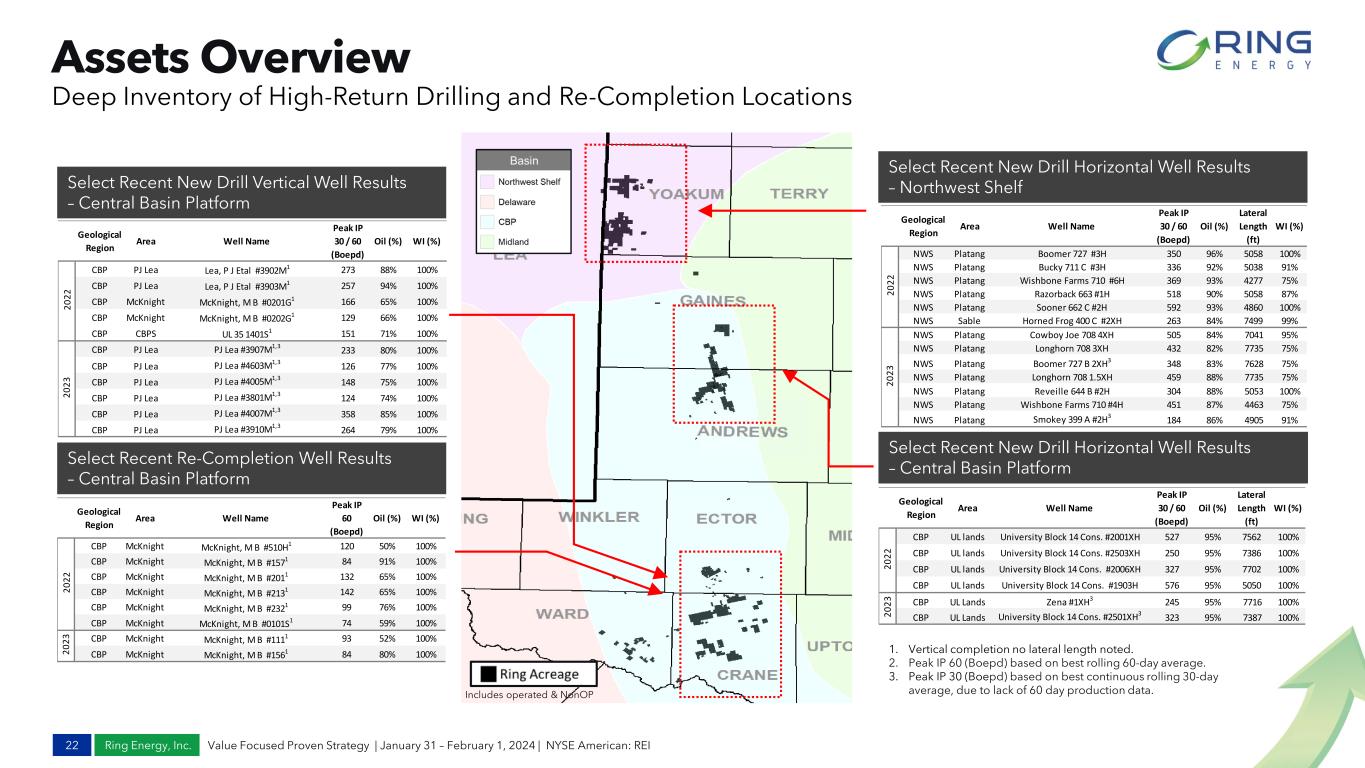 Ring Energy, Inc. Assets Overview 22 Value Focused Proven Strategy | January 31 – February 1, 2024 | NYSE American: REI Deep Inventory of High-Return Drilling and Re-Completion Locations Select Recent New Drill Vertical Well Results – Central Basin Platform 1. Vertical completion no lateral length noted. 2. Peak IP 60 (Boepd) based on best rolling 60-day average. 3. Peak IP 30 (Boepd) based on best continuous rolling 30-day average, due to lack of 60 day production data. Select Recent Re-Completion Well Results – Central Basin Platform Select Recent New Drill Horizontal Well Results – Northwest Shelf Select Recent New Drill Horizontal Well Results – Central Basin Platform Geological Region Area Well Name Peak IP 60 (Boepd) Oil (%) WI (%) CBP McKnight McKnight, M B #510H1 120 50% 100% CBP McKnight McKnight, M B #1571 84 91% 100% CBP McKnight McKnight, M B #2011 132 65% 100% CBP McKnight McKnight, M B #2131 142 65% 100% CBP McKnight McKnight, M B #2321 99 76% 100% CBP McKnight McKnight, M B #0101S1 74 59% 100% CBP McKnight McKnight, M B #1111 93 52% 100% CBP McKnight McKnight, M B #1561 84 80% 100%20 23 20 22 Geological Region Area Well Name Peak IP 30 / 60 (Boepd) Oil (%) Lateral Length (ft) WI (%) CBP UL lands University Block 14 Cons. #2001XH 527 95% 7562 100% CBP UL lands University Block 14 Cons. #2503XH 250 95% 7386 100% CBP UL lands University Block 14 Cons. #2006XH 327 95% 7702 100% CBP UL lands University Block 14 Cons. #1903H 576 95% 5050 100% CBP UL Lands Zena #1XH3 245 95% 7716 100% CBP UL Lands University Block 14 Cons. #2501XH3 323 95% 7387 100% 20 22 20 23 Includes operated & NonOP Geological Region Area Well Name Peak IP 30 / 60 (Boepd) Oil (%) WI (%) CBP PJ Lea Lea, P J Etal #3902M1 273 88% 100% CBP PJ Lea Lea, P J Etal #3903M1 257 94% 100% CBP McKnight McKnight, M B #0201G1 166 65% 100% CBP McKnight McKnight, M B #0202G1 129 66% 100% CBP CBPS UL 35 1401S1 151 71% 100% CBP PJ Lea PJ Lea #3907M1,3 233 80% 100% CBP PJ Lea PJ Lea #4603M1,3 126 77% 100% CBP PJ Lea PJ Lea #4005M1,3 148 75% 100% CBP PJ Lea PJ Lea #3801M1,3 124 74% 100% CBP PJ Lea PJ Lea #4007M1,3 358 85% 100% CBP PJ Lea PJ Lea #3910M1,3 264 79% 100% 20 23 20 22 Geological Region Area Well Name Peak IP 30 / 60 (Boepd) Oil (%) Lateral Length (ft) WI (%) NWS Platang Boomer 727 #3H 350 96% 5058 100% NWS Platang Bucky 711 C #3H 336 92% 5038 91% NWS Platang Wishbone Farms 710 #6H 369 93% 4277 75% NWS Platang Razorback 663 #1H 518 90% 5058 87% NWS Platang Sooner 662 C #2H 592 93% 4860 100% NWS Sable Horned Frog 400 C #2XH 263 84% 7499 99% NWS Platang Cowboy Joe 708 4XH 505 84% 7041 95% NWS Platang Longhorn 708 3XH 432 82% 7735 75% NWS Platang Boomer 727 B 2XH3 348 83% 7628 75% NWS Platang Longhorn 708 1.5XH 459 88% 7735 75% NWS Platang Reveille 644 B #2H 304 88% 5053 100% NWS Platang Wishbone Farms 710 #4H 451 87% 4463 75% NWS Platang Smokey 399 A #2H3 184 86% 4905 91% 20 23 20 22