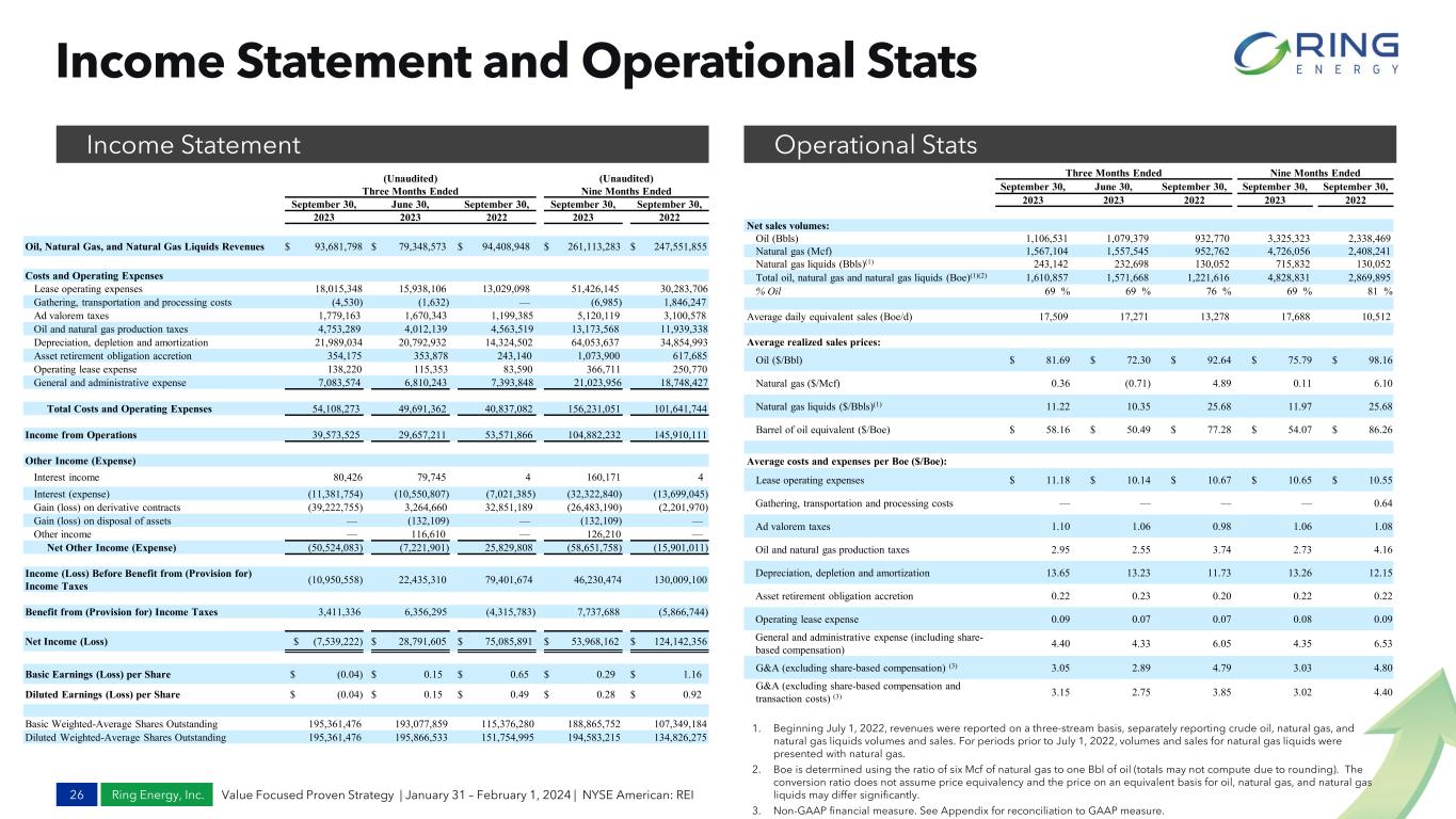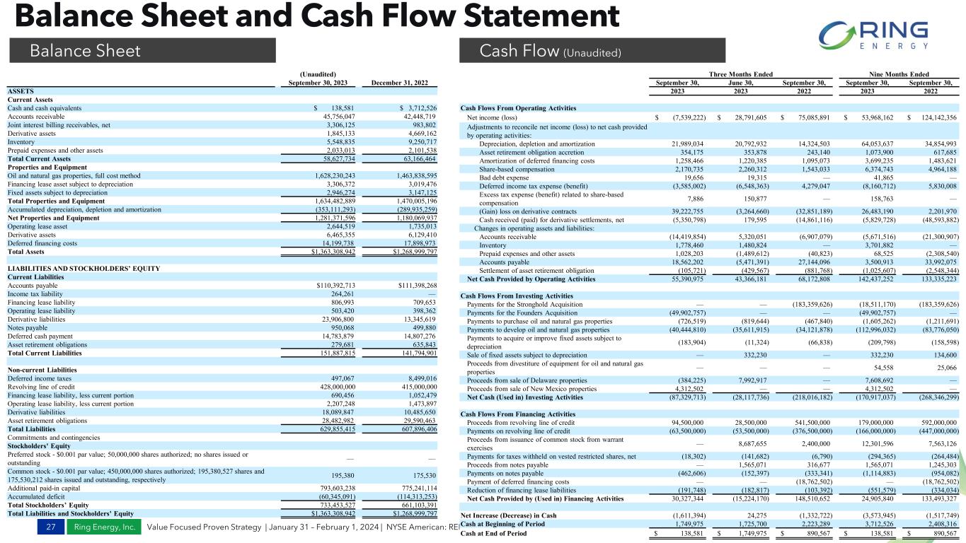 Ring Energy, Inc. Balance Sheet and Cash Flow Statement 27 Value Focused Proven Strategy | January 31 – February 1, 2024 | NYSE American: REI Balance Sheet Cash Flow (Unaudited) (Unaudited) September 30, 2023 December 31, 2022 ASSETS Current Assets Cash and cash equivalents $ 138,581 $ 3,712,526 Accounts receivable 45,756,047 42,448,719 Joint interest billing receivables, net 3,306,125 983,802 Derivative assets 1,845,133 4,669,162 Inventory 5,548,835 9,250,717 Prepaid expenses and other assets 2,033,013 2,101,538 Total Current Assets 58,627,734 63,166,464 Properties and Equipment Oil and natural gas properties, full cost method 1,628,230,243 1,463,838,595 Financing lease asset subject to depreciation 3,306,372 3,019,476 Fixed assets subject to depreciation 2,946,274 3,147,125 Total Properties and Equipment 1,634,482,889 1,470,005,196 Accumulated depreciation, depletion and amortization (353,111,293) (289,935,259) Net Properties and Equipment 1,281,371,596 1,180,069,937 Operating lease asset 2,644,519 1,735,013 Derivative assets 6,465,355 6,129,410 Deferred financing costs 14,199,738 17,898,973 Total Assets $1,363,308,942 $1,268,999,797 LIABILITIES AND STOCKHOLDERS’ EQUITY Current Liabilities Accounts payable $110,392,713 $111,398,268 Income tax liability 264,261 — Financing lease liability 806,993 709,653 Operating lease liability 503,420 398,362 Derivative liabilities 23,906,800 13,345,619 Notes payable 950,068 499,880 Deferred cash payment 14,783,879 14,807,276 Asset retirement obligations 279,681 635,843 Total Current Liabilities 151,887,815 141,794,901 Non-current Liabilities Deferred income taxes 497,067 8,499,016 Revolving line of credit 428,000,000 415,000,000 Financing lease liability, less current portion 690,456 1,052,479 Operating lease liability, less current portion 2,207,248 1,473,897 Derivative liabilities 18,089,847 10,485,650 Asset retirement obligations 28,482,982 29,590,463 Total Liabilities 629,855,415 607,896,406 Commitments and contingencies Stockholders' Equity Preferred stock - $0.001 par value; 50,000,000 shares authorized; no shares issued or outstanding — — Common stock - $0.001 par value; 450,000,000 shares authorized; 195,380,527 shares and 175,530,212 shares issued and outstanding, respectively 195,380 175,530 Additional paid-in capital 793,603,238 775,241,114 Accumulated deficit (60,345,091) (114,313,253) Total Stockholders’ Equity 733,453,527 661,103,391 Total Liabilities and Stockholders' Equity $1,363,308,942 $1,268,999,797 Three Months Ended Nine Months Ended September 30, June 30, September 30, September 30, September 30, 2023 2023 2022 2023 2022 Cash Flows From Operating Activities Net income (loss) $ (7,539,222) $ 28,791,605 $ 75,085,891 $ 53,968,162 $ 124,142,356 Adjustments to reconcile net income (loss) to net cash provided by operating activities: Depreciation, depletion and amortization 21,989,034 20,792,932 14,324,503 64,053,637 34,854,993 Asset retirement obligation accretion 354,175 353,878 243,140 1,073,900 617,685 Amortization of deferred financing costs 1,258,466 1,220,385 1,095,073 3,699,235 1,483,621 Share-based compensation 2,170,735 2,260,312 1,543,033 6,374,743 4,964,188 Bad debt expense 19,656 19,315 — 41,865 — Deferred income tax expense (benefit) (3,585,002) (6,548,363) 4,279,047 (8,160,712) 5,830,008 Excess tax expense (benefit) related to share-based compensation 7,886 150,877 — 158,763 — (Gain) loss on derivative contracts 39,222,755 (3,264,660) (32,851,189) 26,483,190 2,201,970 Cash received (paid) for derivative settlements, net (5,350,798) 179,595 (14,861,116) (5,829,728) (48,593,882) Changes in operating assets and liabilities: Accounts receivable (14,419,854) 5,320,051 (6,907,079) (5,671,516) (21,300,907) Inventory 1,778,460 1,480,824 — 3,701,882 — Prepaid expenses and other assets 1,028,203 (1,489,612) (40,823) 68,525 (2,308,540) Accounts payable 18,562,202 (5,471,391) 27,144,096 3,500,913 33,992,075 Settlement of asset retirement obligation (105,721) (429,567) (881,768) (1,025,607) (2,548,344) Net Cash Provided by Operating Activities 55,390,975 43,366,181 68,172,808 142,437,252 133,335,223 Cash Flows From Investing Activities Payments for the Stronghold Acquisition — — (183,359,626) (18,511,170) (183,359,626) Payments for the Founders Acquisition (49,902,757) — — (49,902,757) — Payments to purchase oil and natural gas properties (726,519) (819,644) (467,840) (1,605,262) (1,211,691) Payments to develop oil and natural gas properties (40,444,810) (35,611,915) (34,121,878) (112,996,032) (83,776,050) Payments to acquire or improve fixed assets subject to depreciation (183,904) (11,324) (66,838) (209,798) (158,598) Sale of fixed assets subject to depreciation — 332,230 — 332,230 134,600 Proceeds from divestiture of equipment for oil and natural gas properties — — — 54,558 25,066 Proceeds from sale of Delaware properties (384,225) 7,992,917 — 7,608,692 — Proceeds from sale of New Mexico properties 4,312,502 — — 4,312,502 — Net Cash (Used in) Investing Activities (87,329,713) (28,117,736) (218,016,182) (170,917,037) (268,346,299) Cash Flows From Financing Activities Proceeds from revolving line of credit 94,500,000 28,500,000 541,500,000 179,000,000 592,000,000 Payments on revolving line of credit (63,500,000) (53,500,000) (376,500,000) (166,000,000) (447,000,000) Proceeds from issuance of common stock from warrant exercises — 8,687,655 2,400,000 12,301,596 7,563,126 Payments for taxes withheld on vested restricted shares, net (18,302) (141,682) (6,790) (294,365) (264,484) Proceeds from notes payable — 1,565,071 316,677 1,565,071 1,245,303 Payments on notes payable (462,606) (152,397) (333,341) (1,114,883) (954,082) Payment of deferred financing costs — — (18,762,502) — (18,762,502) Reduction of financing lease liabilities (191,748) (182,817) (103,392) (551,579) (334,034) Net Cash Provided by (Used in) Financing Activities 30,327,344 (15,224,170) 148,510,652 24,905