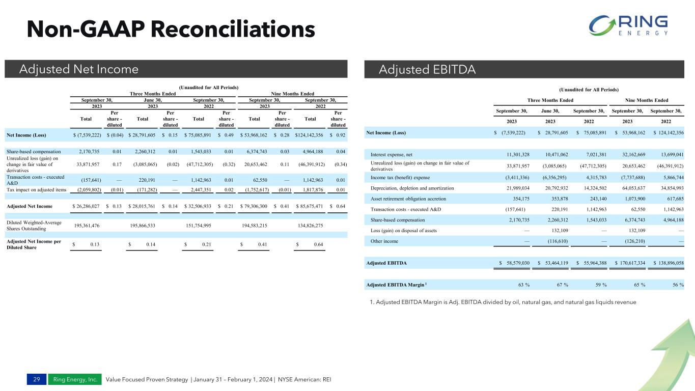 Ring Energy, Inc. Non-GAAP Reconciliations 29 Value Focused Proven Strategy | January 31 – February 1, 2024 | NYSE American: REI Adjusted Net Income Adjusted EBITDA (Unaudited for All Periods) Three Months Ended Nine Months Ended September 30, June 30, September 30, September 30, September 30, 2023 2023 2022 2023 2022 Total Per share - diluted Total Per share - diluted Total Per share - diluted Total Per share - diluted Total Per share - diluted Net Income (Loss) $ (7,539,222) $ (0.04) $ 28,791,605 $ 0.15 $ 75,085,891 $ 0.49 $ 53,968,162 $ 0.28 $124,142,356 $ 0.92 Share-based compensation 2,170,735 0.01 2,260,312 0.01 1,543,033 0.01 6,374,743 0.03 4,964,188 0.04 Unrealized loss (gain) on change in fair value of derivatives 33,871,957 0.17 (3,085,065) (0.02) (47,712,305) (0.32) 20,653,462 0.11 (46,391,912) (0.34) Transaction costs - executed A&D (157,641) — 220,191 — 1,142,963 0.01 62,550 — 1,142,963 0.01 Tax impact on adjusted items (2,059,802) (0.01) (171,282) — 2,447,351 0.02 (1,752,617) (0.01) 1,817,876 0.01 Adjusted Net Income $ 26,286,027 $ 0.13 $ 28,015,761 $ 0.14 $ 32,506,933 $ 0.21 $ 79,306,300 $ 0.41 $ 85,675,471 $ 0.64 Diluted Weighted-Average Shares Outstanding 195,361,476 195,866,533 151,754,995 194,583,215 134,826,275 Adjusted Net Income per Diluted Share $ 0.13 $ 0.14 $ 0.21 $ 0.41 $ 0.64 (Unaudited for All Periods) Three Months Ended Nine Months Ended September 30, June 30, September 30, September 30, September 30, 2023 2023 2022 2023 2022 Net Income (Loss) $ (7,539,222) $ 28,791,605 $ 75,085,891 $ 53,968,162 $ 124,142,356 Interest expense, net 11,301,328 10,471,062 7,021,381 32,162,669 13,699,041 Unrealized loss (gain) on change in fair value of derivatives 33,871,957 (3,085,065) (47,712,305) 20,653,462 (46,391,912) Income tax (benefit) expense (3,411,336) (6,356,295) 4,315,783 (7,737,688) 5,866,744 Depreciation, depletion and amortization 21,989,034 20,792,932 14,324,502 64,053,637 34,854,993 Asset retirement obligation accretion 354,175 353,878 243,140 1,073,900 617,685 Transaction costs - executed A&D (157,641) 220,191 1,142,963 62,550 1,142,963 Share-based compensation 2,170,735 2,260,312 1,543,033 6,374,743 4,964,188 Loss (gain) on disposal of assets — 132,109 — 132,109 — Other income — (116,610) — (126,210) — Adjusted EBITDA $ 58,579,030 $ 53,464,119 $ 55,964,388 $ 170,617,334 $ 138,896,058 Adjusted EBITDA Margin 1 63 % 67 % 59 % 65 % 56 % 1. Adjusted EBITDA Margin is Adj. EBITDA divided by oil, natural gas, and natural gas liquids revenue