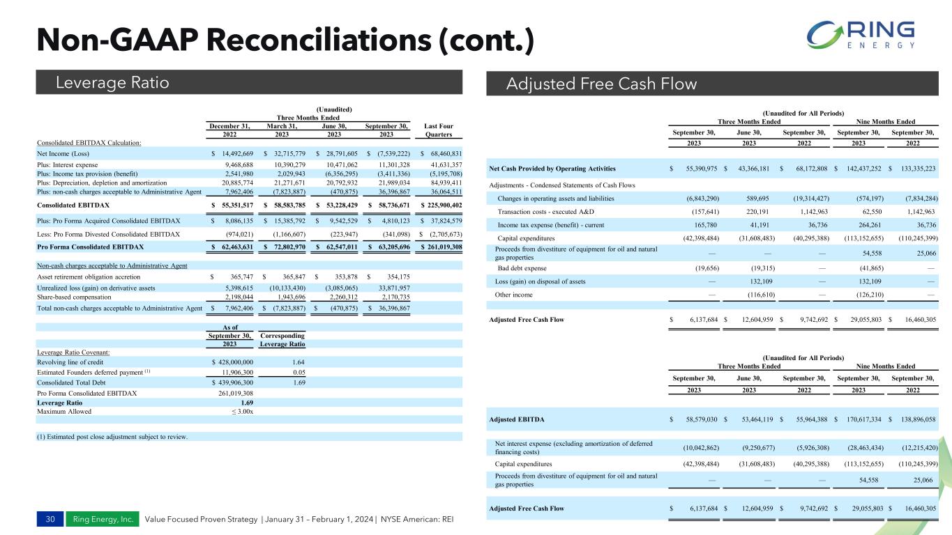 Ring Energy, Inc. The Company defines “Adjusted Cash Flow from Operations” or “ACFFO” as Net Cash Provided by Operating Activities, per the Condensed Statements of Cash Flows, less the changes in operating assets and liabilities, including accounts receivable, inventory, prepaid expenses and other assets, accounts payable, and settlement of asset retirement obligation, which are subject to variation due to the nature of the Company’s operations. Accordingly, the Company believes this non-GAAP measure is useful to investors because it is used often in its industry and allows investors to compare this metric to other companies in its peer group as well as the E&P sector. “Leverage” or the “Leverage Ratio” is calculated under our existing senior revolving credit facility and means as of any date, the ratio of (i) our consolidated total debt as of such date to (ii) our Consolidated EBITDAX for the four consecutive fiscal quarters ending on or immediately prior to such date for which financial statements are required to have been delivered under our existing senior revolving credit facility; provided that for the purposes of the definition of ‘Leverage Ratio’, (a) for the fiscal quarter ended September 30, 2022, Consolidated EBITDAX is calculated by multiplying Consolidated EBITDAX for such fiscal quarter by four, (b) for the fiscal quarter ended December 31, 2022, Consolidated EBITDAX is calculated by multiplying Consolidated EBITDAX for the two fiscal quarter period ended on December 31, 2022 by two, (c) for the fiscal quarter ended March 31, 2023, Consolidated EBITDAX is calculated by multiplying Consolidated EBITDAX for the three fiscal quarter period ended on March 31, 2023 by four-thirds, and (d) for each fiscal quarter thereafter, Consolidated EBITDAX will be calculated by adding Consolidated EBITDAX for the four consecutive fiscal quarters ending on such date. The Company defines “Consolidated EBITDAX” in accordance with our existing senior revolving credit facility and it means for any period an amount equal to the sum of (i) consolidated net income for such period plus (ii) to the extent deducted in determining consolidated net income for such period, and without duplication, (A) consolidated interest expense, (B) income tax expense determined on a consolidated basis in accordance with GAAP, (C) depreciation, depletion and amortization determined on a consolidated basis in accordance with GAAP, (D) exploration expenses determined on a consolidated basis in accordance with GAAP, and (E) all other non-cash charges acceptable to our senior revolving credit facility administrative agent determined on a consolidated basis in accordance with GAAP, in each case for such period minus (iii) all noncash income added to consolidated net income for such period; provided that, for purposes of calculating compliance with the financial covenants set forth in our senior revolving credit facility, to the extent that during such period we shall have consummated an acquisition permitted by the senior revolving credit facility or any sale, transfer or other disposition of any person, business, property or assets permitted by the senior revolving credit facility, Consolidated EBITDAX will be calculated on a pro forma basis with respect to such person, business, property or assets so acquired or disposed of. Also set forth in our existing senior revolving credit facility is the maximum permitted Leverage Ratio of 3.00. PV-10 is a financial measure not prepared in accordance with GAAP that differs from a measure under GAAP known as “standardized measure of discounted future net cash flows” in that PV-10 is calculated without including future income taxes. Management believes that the presentation of the PV-10 value of its oil and natural gas properties is relevant and useful to investors because it presents the estimated discounted future net cash flows attributable to its estimated proved reserves independent of its income tax attributes, thereby isolating the intrinsic value of the estimated future cash flows attributable to its reserves. Management believes the use of a pre-tax measure provides greater comparability of assets when evaluating companies because the timing and quantification of future income taxes is dependent on company-specific factors, many of which are difficult to determine. For these reasons, management uses and believes that the industry generally uses the PV-10 measure in evaluating and comparing acquisition candidates and assessing the potential rate of return on investments in oil and natural gas properties. PV-10 does not necessarily represent the fair market value of oil and natural gas properties. PV-10 is not a measure of financial or operational performance under GAAP, nor should it be considered in isolation or as a substitute for the standardized measure of discounted future net cash flows as defined under GAAP. The Company defines “Return on Capital Employed” or “CROCE” as Adjusted Cash Flow from Operations divided by average debt and shareholder equity for the period. Non-GAAP Disclosure 28 Value Focused Proven Strategy | January 31 – February 1, 2024 | NYSE American: REI Certain financial information included in this Presentation are not measures of financial performance recognized by accounting principles generally accepted in the United States (“GAAP”). These non-GAAP financial measures are “Adjusted Net Income,” “Adjusted EBITDA,” “Adjusted Free Cash Flow” or “AFCF,” “Adjusted Cash Flow from Operations” or “ACFFO,” “Cash Return on Capital Employed” or “CROCE,” and “Leverage Ratio.” Management uses these non-GAAP financial measures in its analysis of performance. In addition, Adjusted EBITDA is a key metric used to determine the Company’s incentive compensation awards. These disclosures may not be viewed as a substitute for results determined in accordance with GAAP and are not necessar