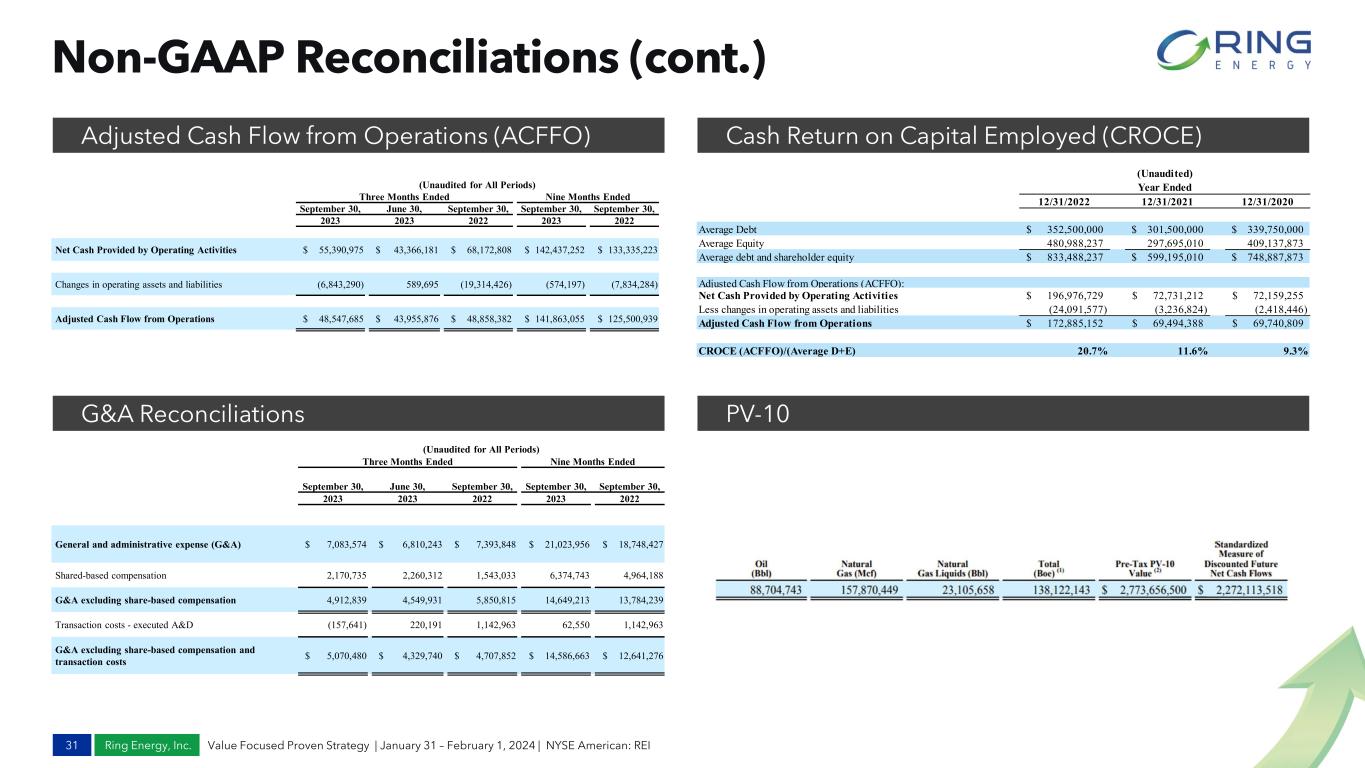 Ring Energy, Inc. Non-GAAP Reconciliations (cont.) 30 Value Focused Proven Strategy | January 31 – February 1, 2024 | NYSE American: REI Leverage Ratio Adjusted Free Cash Flow (Unaudited for All Periods) Three Months Ended Nine Months Ended September 30, June 30, September 30, September 30, September 30, 2023 2023 2022 2023 2022 Net Cash Provided by Operating Activities $ 55,390,975 $ 43,366,181 $ 68,172,808 $ 142,437,252 $ 133,335,223 Adjustments - Condensed Statements of Cash Flows Changes in operating assets and liabilities (6,843,290) 589,695 (19,314,427) (574,197) (7,834,284) Transaction costs - executed A&D (157,641) 220,191 1,142,963 62,550 1,142,963 Income tax expense (benefit) - current 165,780 41,191 36,736 264,261 36,736 Capital expenditures (42,398,484) (31,608,483) (40,295,388) (113,152,655) (110,245,399) Proceeds from divestiture of equipment for oil and natural gas properties — — — 54,558 25,066 Bad debt expense (19,656) (19,315) — (41,865) — Loss (gain) on disposal of assets — 132,109 — 132,109 — Other income — (116,610) — (126,210) — Adjusted Free Cash Flow $ 6,137,684 $ 12,604,959 $ 9,742,692 $ 29,055,803 $ 16,460,305 (Unaudited for All Periods) Three Months Ended Nine Months Ended September 30, June 30, September 30, September 30, September 30, 2023 2023 2022 2023 2022 Adjusted EBITDA $ 58,579,030 $ 53,464,119 $ 55,964,388 $ 170,617,334 $ 138,896,058 Net interest expense (excluding amortization of deferred financing costs) (10,042,862) (9,250,677) (5,926,308) (28,463,434) (12,215,420) Capital expenditures (42,398,484) (31,608,483) (40,295,388) (113,152,655) (110,245,399) Proceeds from divestiture of equipment for oil and natural gas properties — — — 54,558 25,066 Adjusted Free Cash Flow $ 6,137,684 $ 12,604,959 $ 9,742,692 $ 29,055,803 $ 16,460,305 (Unaudited) Three Months Ended December 31, March 31, June 30, September 30, Last Four Quarters2022 2023 2023 2023 Consolidated EBITDAX Calculation: Net Income (Loss) $ 14,492,669 $ 32,715,779 $ 28,791,605 $ (7,539,222) $ 68,460,831 Plus: Interest expense 9,468,688 10,390,279 10,471,062 11,301,328 41,631,357 Plus: Income tax provision (benefit) 2,541,980 2,029,943 (6,356,295) (3,411,336) (5,195,708) Plus: Depreciation, depletion and amortization 20,885,774 21,271,671 20,792,932 21,989,034 84,939,411 Plus: non-cash charges acceptable to Administrative Agent 7,962,406 (7,823,887) (470,875) 36,396,867 36,064,511 Consolidated EBITDAX $ 55,351,517 $ 58,583,785 $ 53,228,429 $ 58,736,671 $ 225,900,402 Plus: Pro Forma Acquired Consolidated EBITDAX $ 8,086,135 $ 15,385,792 $ 9,542,529 $ 4,810,123 $ 37,824,579 Less: Pro Forma Divested Consolidated EBITDAX (974,021) (1,166,607) (223,947) (341,098) $ (2,705,673) Pro Forma Consolidated EBITDAX $ 62,463,631 $ 72,802,970 $ 62,547,011 $ 63,205,696 $ 261,019,308 Non-cash charges acceptable to Administrative Agent Asset retirement obligation accretion $ 365,747 $ 365,847 $ 353,878 $ 354,175 Unrealized loss (gain) on derivative assets 5,398,615 (10,133,430) (3,085,065) 33,871,957 Share-based compensation 2,198,044 1,943,696 2,260,312 2,170,735 Total non-cash charges acceptable to Administrative Agent $ 7,962,406 $ (7,823,887) $ (470,875) $ 36,396,867 As of September 30, Corresponding 2023 Leverage Ratio Leverage Ratio Covenant: Revolving line of credit $ 428,000,000 1.64 Estimated Founders deferred payment (1) 11,906,300 0.05 Consolidated Total Debt $ 439,906,300 1.69 Pro Forma Consolidated EBITDAX 261,019,308 Leverage Ratio 1.69 Maximum Allowed ≤ 3.00x (1) Estimated post close adjustment subject to review.