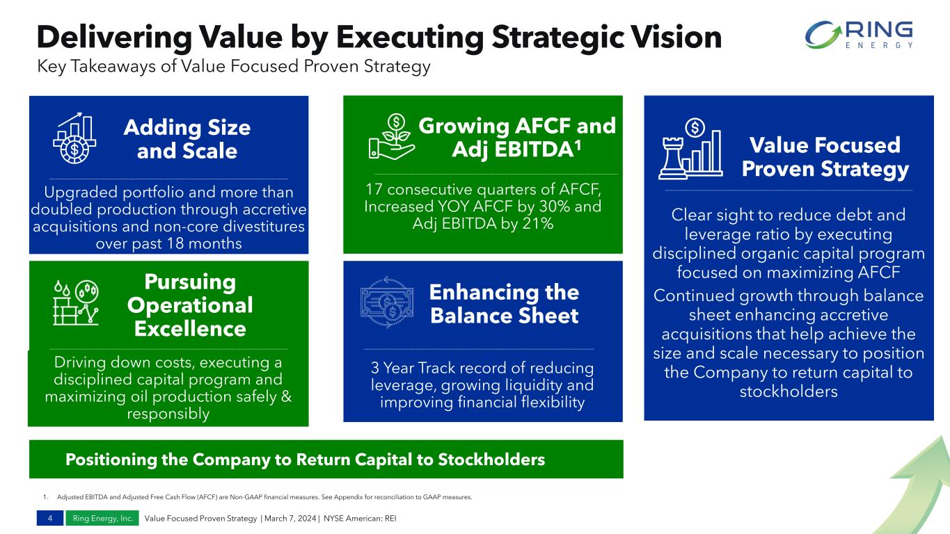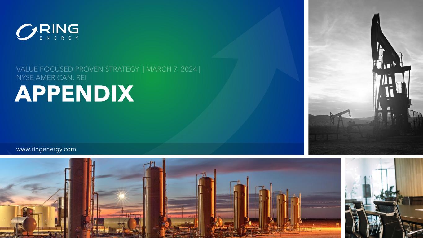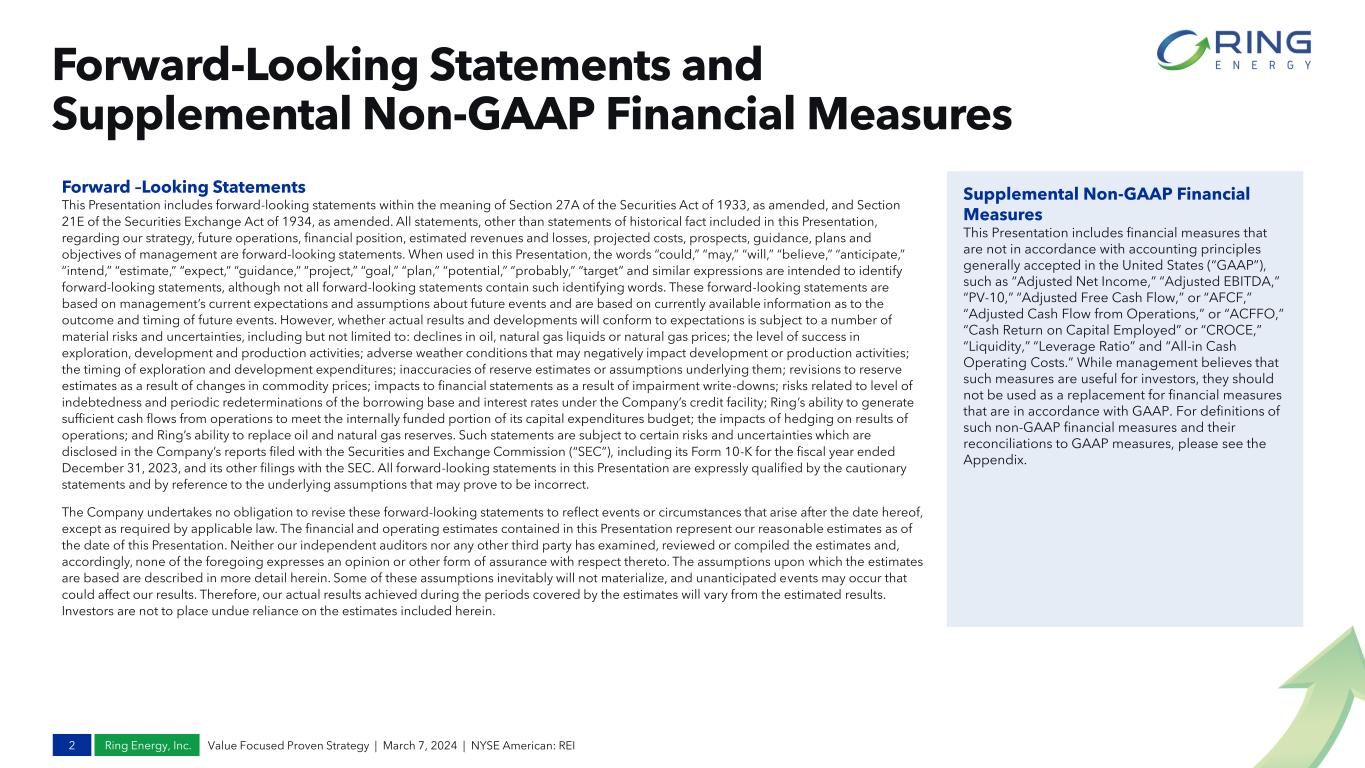 Ring Energy, Inc. Forward –Looking Statements This Presentation includes forward-looking statements within the meaning of Section 27A of the Securities Act of 1933, as amended, and Section 21E of the Securities Exchange Act of 1934, as amended. All statements, other than statements of historical fact included in this Presentation, regarding our strategy, future operations, financial position, estimated revenues and losses, projected costs, prospects, guidance, plans and objectives of management are forward-looking statements. When used in this Presentation, the words “could,” “may,” “will,” “believe,” “anticipate,” “intend,” “estimate,” “expect,” “guidance,” “project,” “goal,” “plan,” “potential,” “probably,” “target” and similar expressions are intended to identify forward-looking statements, although not all forward-looking statements contain such identifying words. These forward-looking statements are based on management’s current expectations and assumptions about future events and are based on currently available information as to the outcome and timing of future events. However, whether actual results and developments will conform to expectations is subject to a number of material risks and uncertainties, including but not limited to: declines in oil, natural gas liquids or natural gas prices; the level of success in exploration, development and production activities; adverse weather conditions that may negatively impact development or production activities; the timing of exploration and development expenditures; inaccuracies of reserve estimates or assumptions underlying them; revisions to reserve estimates as a result of changes in commodity prices; impacts to financial statements as a result of impairment write-downs; risks related to level of indebtedness and periodic redeterminations of the borrowing base and interest rates under the Company’s credit facility; Ring’s ability to generate sufficient cash flows from operations to meet the internally funded portion of its capital expenditures budget; the impacts of hedging on results of operations; and Ring’s ability to replace oil and natural gas reserves. Such statements are subject to certain risks and uncertainties which are disclosed in the Company’s reports filed with the Securities and Exchange Commission (“SEC”), including its Form 10-K for the fiscal year ended December 31, 2023, and its other filings with the SEC. All forward-looking statements in this Presentation are expressly qualified by the cautionary statements and by reference to the underlying assumptions that may prove to be incorrect. The Company undertakes no obligation to revise these forward-looking statements to reflect events or circumstances that arise after the date hereof, except as required by applicable law. The financial and operating estimates contained in this Presentation represent our reasonable estimates as of the date of this Presentation. Neither our independent auditors nor any other third party has examined, reviewed or compiled the estimates and, accordingly, none of the foregoing expresses an opinion or other form of assurance with respect thereto. The assumptions upon which the estimates are based are described in more detail herein. Some of these assumptions inevitably will not materialize, and unanticipated events may occur that could affect our results. Therefore, our actual results achieved during the periods covered by the estimates will vary from the estimated results. Investors are not to place undue reliance on the estimates included herein. Forward-Looking Statements and Supplemental Non-GAAP Financial Measures 2 Value Focused Proven Strategy | March 7, 2024 | NYSE American: REI Supplemental Non-GAAP Financial Measures This Presentation includes financial measures that are not in accordance with accounting principles generally accepted in the United States (“GAAP”), such as “Adjusted Net Income,” “Adjusted EBITDA,” “PV-10,” “Adjusted Free Cash Flow,” or “AFCF,” “Adjusted Cash Flow from Operations,” or “ACFFO,” “Cash Return on Capital Employed” or “CROCE,” “Liquidity,” “Leverage Ratio” and “All-in Cash Operating Costs.” While management believes that such measures are useful for investors, they should not be used as a replacement for financial measures that are in accordance with GAAP. For definitions of such non-GAAP financial measures and their reconciliations to GAAP measures, please see the Appendix.