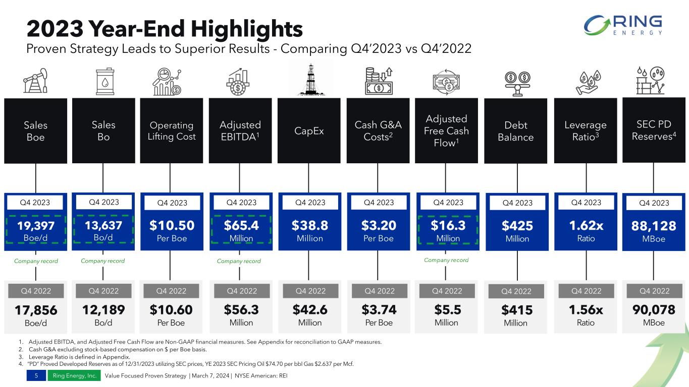 Ring Energy, Inc. Positioning the Company to Return Capital to Stockholders 4 Value Focused Proven Strategy | March 7, 2024 | NYSE American: REI 1. Adjusted EBITDA and Adjusted Free Cash Flow (AFCF) are Non-GAAP financial measures. See Appendix for reconciliation to GAAP measures. Delivering Value by Executing Strategic Vision 17 consecutive quarters of AFCF, Increased YOY AFCF by 30% and Adj EBITDA by 21% Growing AFCF and Adj EBITDA1 Adding Size and Scale Upgraded portfolio and more than doubled production through accretive acquisitions and non-core divestitures over past 18 months 3 Year Track record of reducing leverage, growing liquidity and improving financial flexibility Enhancing the Balance Sheet Driving down costs, executing a disciplined capital program and maximizing oil production safely & responsibly Pursuing Operational Excellence Key Takeaways of Value Focused Proven Strategy Value Focused Proven Strategy Clear sight to reduce debt and leverage ratio by executing disciplined organic capital program focused on maximizing AFCF Continued growth through balance sheet enhancing accretive acquisitions that help achieve the size and scale necessary to position the Company to return capital to stockholders