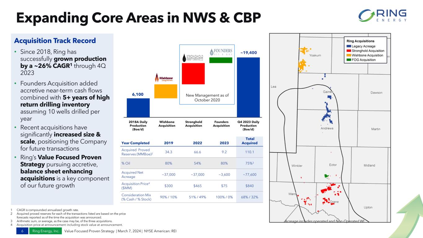 Ring Energy, Inc. 2023 Year-End Highlights 5 Proven Strategy Leads to Superior Results - Comparing Q4’2023 vs Q4’2022 Operating Lifting Cost Sales Boe Adjusted EBITDA1 CapEx Cash G&A Costs2 Adjusted Free Cash Flow1 Leverage Ratio3 19,397 Boe/d Q4 2023 $10.50 Per Boe Q4 2023 17,856 Boe/d Q4 2022 1. Adjusted EBITDA, and Adjusted Free Cash Flow are Non-GAAP financial measures. See Appendix for reconciliation to GAAP measures. 2. Cash G&A excluding stock-based compensation on $ per Boe basis. 3. Leverage Ratio is defined in Appendix. 4. “PD” Proved Developed Reserves as of 12/31/2023 utilizing SEC prices, YE 2023 SEC Pricing Oil $74.70 per bbl Gas $2.637 per Mcf. $65.4 Million Q4 2023 $38.8 Million Q4 2023 $16.3 Million Q4 2023 1.62x Ratio Q4 2023 $3.20 Per Boe Q4 2023 $10.60 Per Boe Q4 2022 $56.3 Million Q4 2022 $42.6 Million Q4 2022 $3.74 Per Boe Q4 2022 1.56x Ratio Q4 2022 $5.5 Million Q4 2022 Company record Sales Bo 13,637 Bo/d Q4 2023 12,189 Bo/d Q4 2022 Debt Balance $425 Million Q4 2023 $415 Million Q4 2022 SEC PD Reserves4 88,128 MBoe Q4 2023 90,078 MBoe Q4 2022 Company record Company record Value Focused Proven Strategy | March 7, 2024 | NYSE American: REI