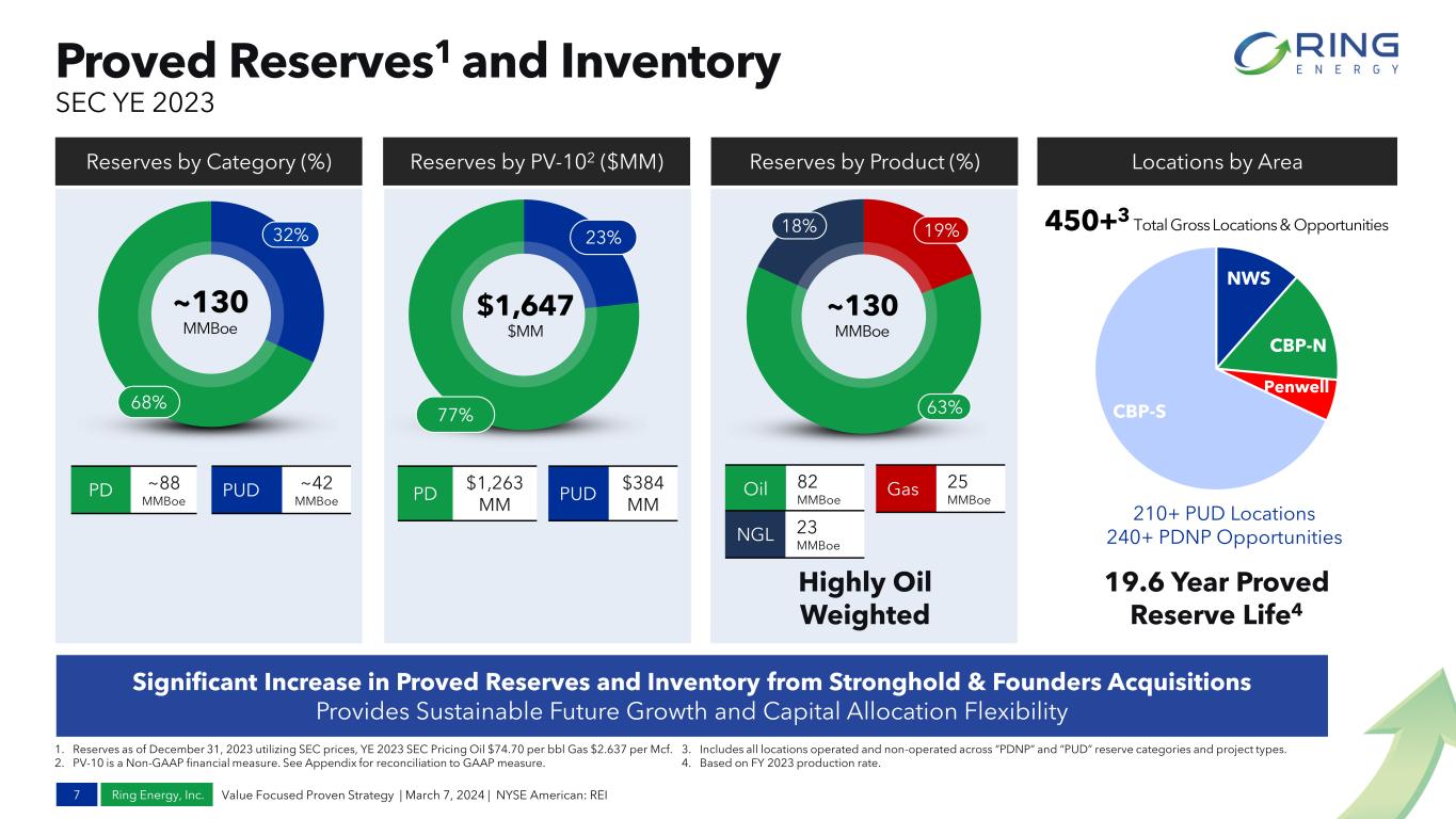Ring Energy, Inc. Expanding Core Areas in NWS & CBP 6 Value Focused Proven Strategy | March 7, 2024 | NYSE American: REI Acquisition Track Record • Since 2018, Ring has successfully grown production by a ~26% CAGR1 through 4Q 2023 • Founders Acquisition added accretive near-term cash flows combined with 5+ years of high return drilling inventory assuming 10 wells drilled per year • Recent acquisitions have significantly increased size & scale, positioning the Company for future transactions • Ring’s Value Focused Proven Strategy pursuing accretive, balance sheet enhancing acquisitions is a key component of our future growth 1 CAGR is compounded annualized growth rate. 2 Acquired proved reserves for each of the transactions listed are based on the price forecasts reported as of the time the acquisition was announced. 3 Arithmetic sum, or average, as the case may be, of the three acquisitions. 4 Acquisition price at announcement including stock value at announcement. Year Completed 2019 2022 2023 Total Acquired Acquired Proved Reserves (MMBoe)2 34.3 66.6 9.2 110.1 % Oil 80% 54% 80% 75%3 Acquired Net Acreage ~37,000 ~37,000 ~3,600 ~77,600 Acquisition Price4 ($MM) $300 $465 $75 $840 Consideration Mix (% Cash / % Stock) 90% / 10% 51% / 49% 100% / 0% 68% / 32% 2018A Daily Production (Boe/d) Wishbone Acquisition Stronghold Acquisition Founders Acquisition Q4 2023 Daily Production (Boe/d) New Management as of October 2020 6,100 ~19,400 Acreage includes operated and Non-Operated WI