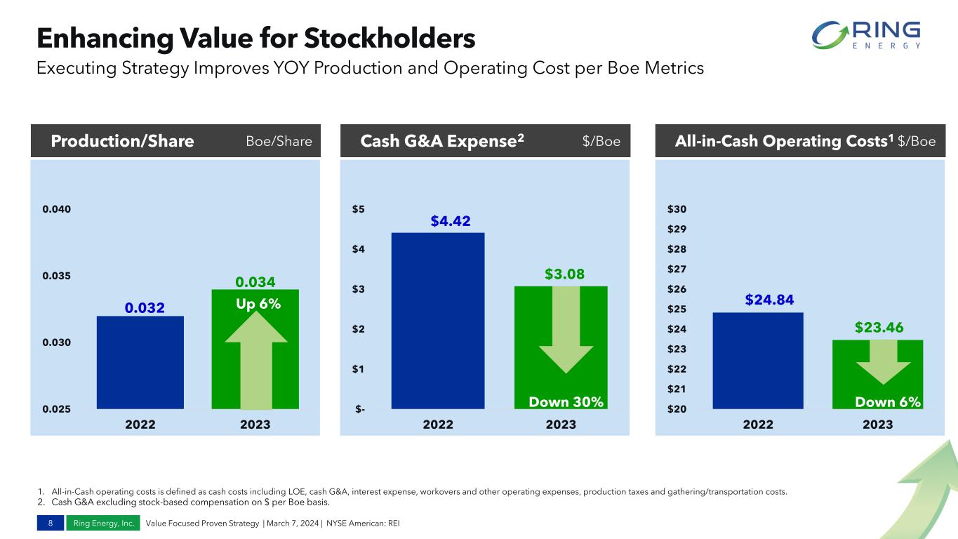 Ring Energy, Inc. NWS CBP-N Penwell CBP-S 19% 63% 18% Highly Oil Weighted Proved Reserves1 and Inventory 7 SEC YE 2023 Reserves by Category (%) Reserves by PV-102 ($MM) Reserves by Product (%) Locations by Area PD ~88 MMBoe PUD ~42 MMBoe Significant Increase in Proved Reserves and Inventory from Stronghold & Founders Acquisitions Provides Sustainable Future Growth and Capital Allocation Flexibility 32% 68% ~130 MMBoe 23% 77% 1. Reserves as of December 31, 2023 utilizing SEC prices, YE 2023 SEC Pricing Oil $74.70 per bbl Gas $2.637 per Mcf. 2. PV-10 is a Non-GAAP financial measure. See Appendix for reconciliation to GAAP measure. 3. Includes all locations operated and non-operated across “PDNP” and “PUD” reserve categories and project types. 4. Based on FY 2023 production rate. $1,647 $MM PD $1,263 MM PUD $384 MM Oil 82 MMBoe Gas 25 MMBoe NGL 23 MMBoe ~130 MMBoe 19.6 Year Proved Reserve Life4 210+ PUD Locations 240+ PDNP Opportunities 450+3 Total Gross Locations & Opportunities Value Focused Proven Strategy | March 7, 2024 | NYSE American: REI
