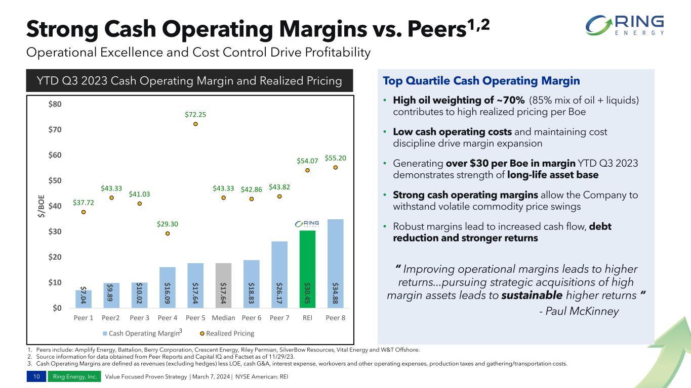 Ring Energy, Inc. 0% 2% 4% 6% 8% 10% 12% 14% 16% 18% 20% 2022 2023 Enhancing Value for Stockholders Continued… 9 Executing Strategy Improves Key YOY Cash Flow Metrics Free Cash Flow Yield2 % 10% 16% $160 $165 $170 $175 $180 $185 $190 $195 $200 2022 2023 ACFFO1 $MM $197 $173 0% 25% 50% 75% 3Q22 YTD 3Q23 YTD Adjusted EBITDA Margin1 57% 65% Up 16% % 2022 2023 Up 14% Up 58% 1. Adjusted Free Cash Flow and Adjusted EBITDA margin are Non-GAAP financial measures. See Appendix for reconciliation to GAAP measures. 2. Free Cash Flow Yield is (Adjusted Free Cash Flow divided by market cap for the period) with market cap calculated by multiplying weighted average diluted share count by year-end share price for the period. Value Focused Proven Strategy | March 7, 2024 | NYSE American: REI