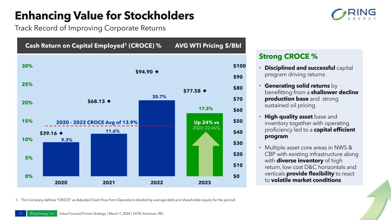 Ring Energy, Inc. $ 7 .0 4 $ 9 .8 9 $ 1 0 .0 2 $ 1 6 .0 9 $ 1 7 .6 4 $ 1 7 .6 4 $ 1 8 .8 3 $ 2 6 .1 7 $ 3 0 .4 5 $ 3 4 .8 8 $37.72 $43.33 $41.03 $29.30 $72.25 $43.33 $42.86 $43.82 $54.07 $55.20 $0 $10 $20 $30 $40 $50 $60 $70 $80 Peer 1 Peer2 Peer 3 Peer 4 Peer 5 Median Peer 6 Peer 7 REI Peer 8 $ /B O E Cash Operating Margin Realized Pricing Strong Cash Operating Margins vs. Peers1,2 10 Value Focused Proven Strategy | March 7, 2024 | NYSE American: REI Operational Excellence and Cost Control Drive Profitability YTD Q3 2023 Cash Operating Margin and Realized Pricing Top Quartile Cash Operating Margin • High oil weighting of ~70% (85% mix of oil + liquids) contributes to high realized pricing per Boe • Low cash operating costs and maintaining cost discipline drive margin expansion • Generating over $30 per Boe in margin YTD Q3 2023 demonstrates strength of long-life asset base • Strong cash operating margins allow the Company to withstand volatile commodity price swings • Robust margins lead to increased cash flow, debt reduction and stronger returns “ Improving operational margins leads to higher returns...pursuing strategic acquisitions of high margin assets leads to sustainable higher returns “ - Paul McKinney 1. Peers include: Amplify Energy, Battalion, Berry Corporation, Crescent Energy, Riley Permian, SilverBow Resources, Vital Energy and W&T Offshore. 2. Source information for data obtained from Peer Reports and Capital IQ and Factset as of 11/29/23. 3. Cash Operating Margins are defined as revenues (excluding hedges) less LOE, cash G&A, interest expense, workovers and other operating expenses, production taxes and gathering/transportation costs. 3