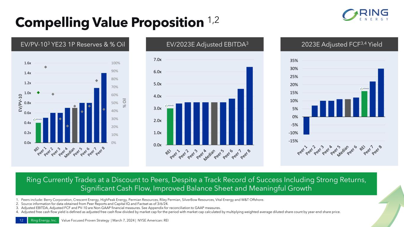 Ring Energy, Inc. Enhancing Value for Stockholders 11 Track Record of Improving Corporate Returns $39.16 $68.13 $94.90 $77.58 $0 $10 $20 $30 $40 $50 $60 $70 $80 $90 $100 0% 5% 10% 15% 20% 25% 30% 2020 2021 2022 2023 Cash Return on Capital Employed1 (CROCE) % AVG WTI Pricing $/Bbl 17.2% 20.7% Strong CROCE % • Disciplined and successful capital program driving returns • Generating solid returns by benefitting from a shallower decline production base and strong sustained oil pricing • High quality asset base and inventory together with operating proficiency led to a capital efficient program • Multiple asset core areas in NWS & CBP with existing infrastructure along with diverse inventory of high return, low cost D&C horizontals and verticals provide flexibility to react to volatile market conditions Value Focused Proven Strategy | March 7, 2024 | NYSE American: REI 1. The Company defines “CROCE” as Adjusted Cash Flow from Operations divided by average debt and shareholder equity for the period. 11.6% 9.3% 2020 – 2022 CROCE Avg of 13.9% Up 24% vs 2020-’22 AVG