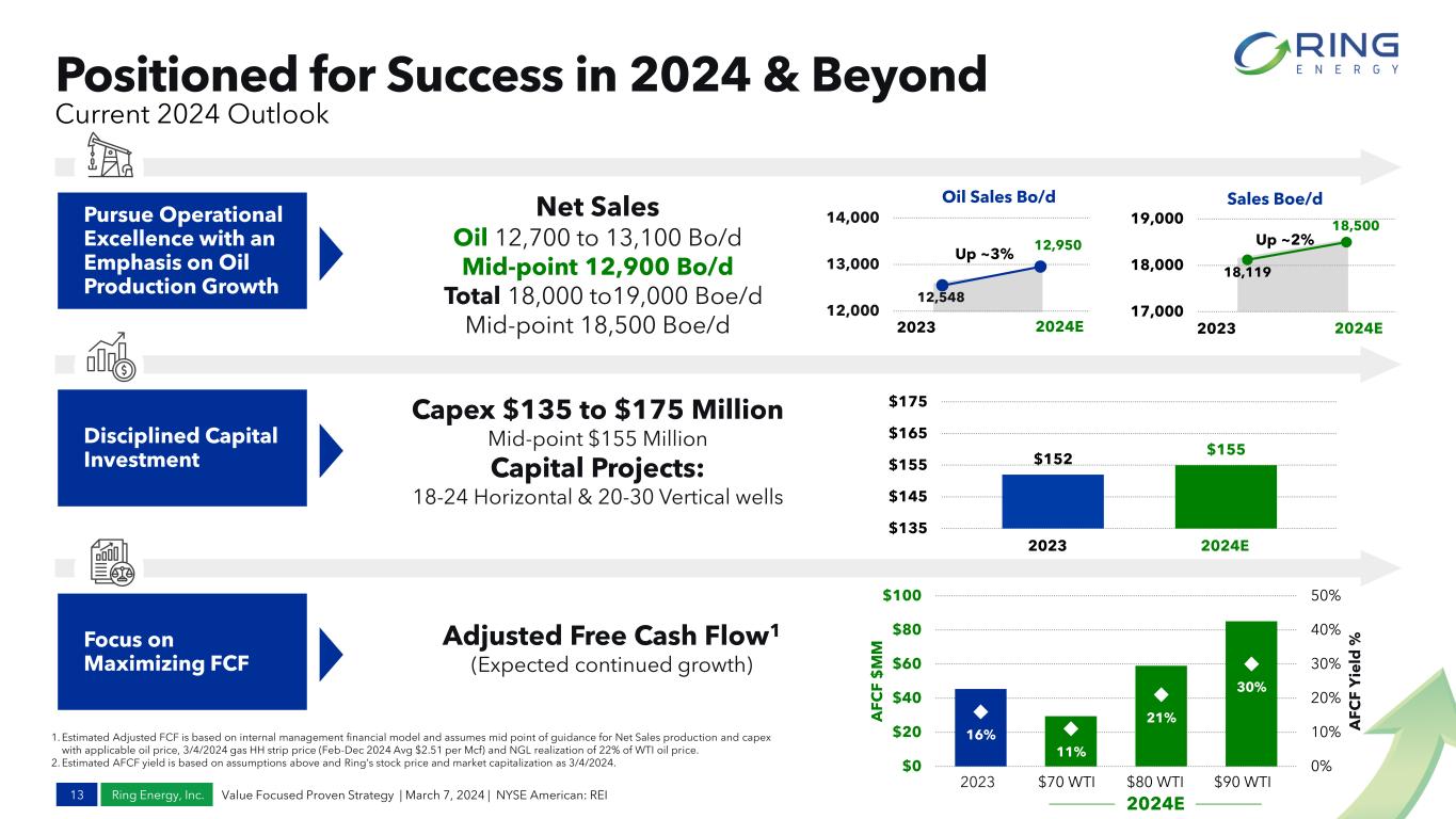 Ring Energy, Inc. Compelling Value Proposition 1,2 12 -15% -10% -5% 0% 5% 10% 15% 20% 25% 30% 35% 0.0x 1.0x 2.0x 3.0x 4.0x 5.0x 6.0x 7.0x 0% 10% 20% 30% 40% 50% 60% 70% 80% 90% 100% 0.0x 0.2x 0.4x 0.6x 0.8x 1.0x 1.2x 1.4x 1.6x % O il EV /P V -1 0 EV/2023E Adjusted EBITDA3EV/PV-103 YE23 1P Reserves & % Oil 2023E Adjusted FCF3,4 Yield Ring Currently Trades at a Discount to Peers, Despite a Track Record of Success Including Strong Returns, Significant Cash Flow, Improved Balance Sheet and Meaningful Growth 1. Peers include: Berry Corporation, Crescent Energy, HighPeak Energy, Permian Resources, Riley Permian, SilverBow Resources, Vital Energy and W&T Offshore. 2. Source information for data obtained from Peer Reports and Capital IQ and Factset as of 3/6/24. 3. Adjusted EBITDA, Adjusted FCF and PV-10 are Non-GAAP financial measures. See Appendix for reconciliation to GAAP measures. 4. Adjusted free cash flow yield is defined as adjusted free cash flow divided by market cap for the period with market cap calculated by multiplying weighted average diluted share count by year-end share price. Value Focused Proven Strategy | March 7, 2024 | NYSE American: REI