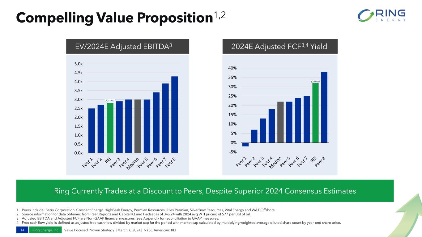 Ring Energy, Inc. 18,119 18,500 17,000 18,000 19,000 12,548 12,950 12,000 13,000 14,000 16% 11% 21% 30% 0% 10% 20% 30% 40% 50% $0 $20 $40 $60 $80 $100 A F C F Y ie ld % A F C F $ M M Positioned for Success in 2024 & Beyond 13 1. Estimated Adjusted FCF is based on internal management financial model and assumes mid point of guidance for Net Sales production and capex with applicable oil price, 3/4/2024 gas HH strip price (Feb-Dec 2024 Avg $2.51 per Mcf) and NGL realization of 22% of WTI oil price. 2. Estimated AFCF yield is based on assumptions above and Ring’s stock price and market capitalization as 3/4/2024. Pursue Operational Excellence with an Emphasis on Oil Production Growth Net Sales Oil 12,700 to 13,100 Bo/d Mid-point 12,900 Bo/d Total 18,000 to19,000 Boe/d Mid-point 18,500 Boe/d Sales Boe/dOil Sales Bo/d 2023 2024E Up ~3% Up ~2% Disciplined Capital Investment Capex $135 to $175 Million Mid-point $155 Million Capital Projects: 18-24 Horizontal & 20-30 Vertical wells Focus on Maximizing FCF Adjusted Free Cash Flow1 (Expected continued growth) $152 $155 $135 $145 $155 $165 $175 2023 2024E Value Focused Proven Strategy | March 7, 2024 | NYSE American: REI $90 WTI 2024E $80 WTI$70 WTI 2023 2024E 2023 Current 2024 Outlook