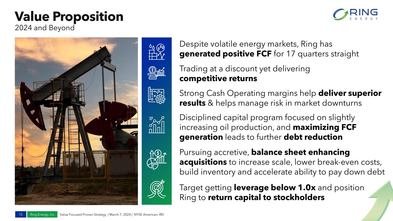 Ring Energy, Inc. Compelling Value Proposition1,2 14 -5% 0% 5% 10% 15% 20% 25% 30% 35% 40% 0.0x 0.5x 1.0x 1.5x 2.0x 2.5x 3.0x 3.5x 4.0x 4.5x 5.0x EV/2024E Adjusted EBITDA3 2024E Adjusted FCF3,4 Yield Ring Currently Trades at a Discount to Peers, Despite Superior 2024 Consensus Estimates 1. Peers include: Berry Corporation, Crescent Energy, HighPeak Energy, Permian Resources, Riley Permian, SilverBow Resources, Vital Energy and W&T Offshore. 2. Source information for data obtained from Peer Reports and Capital IQ and Factset as of 3/6/24 with 2024 avg WTI pricing of $77 per Bbl of oil. 3. Adjusted EBITDA and Adjusted FCF are Non-GAAP financial measures. See Appendix for reconciliation to GAAP measures. 4. Free cash flow yield is defined as adjusted free cash flow divided by market cap for the period with market cap calculated by multiplying weighted average diluted share count by year-end share price. Value Focused Proven Strategy | March 7, 2024 | NYSE American: REI