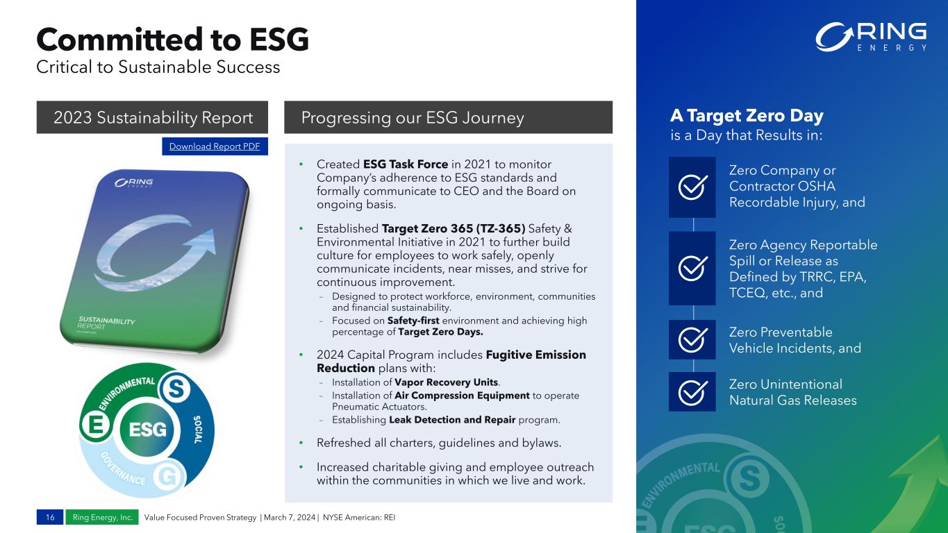 Ring Energy, Inc. Value Proposition 15 Value Focused Proven Strategy | March 7, 2024 | NYSE American: REI 2024 and Beyond Trading at a discount yet delivering competitive returns Target getting leverage below 1.0x and position Ring to return capital to stockholders Despite volatile energy markets, Ring has generated positive FCF for 17 quarters straight Strong Cash Operating margins help deliver superior results & helps manage risk in market downturns Disciplined capital program focused on slightly increasing oil production, and maximizing FCF generation leads to further debt reduction Pursuing accretive, balance sheet enhancing acquisitions to increase scale, lower break-even costs, build inventory and accelerate ability to pay down debt