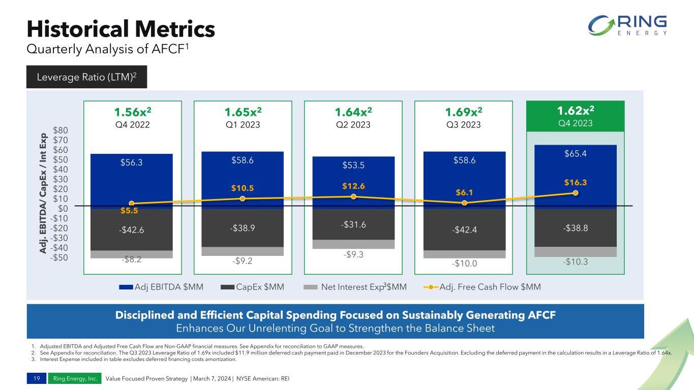 Ring Energy, Inc. Q1 & FY 2024 Guidance 18 Value Focused Proven Strategy | March 7, 2024 | NYSE American: REI Grow Oil Production, Generate FCF, Pay Down Debt FY 2024 CAPEX Allocation D,C&E Recomp/Cap Workovers Land/Non-op/Other $155 million Mid Point 73% 24% 3% Sales Volumes Q1 2024 FY 2024 Total (Bo/d) 12,420 – 12,765 12,600 – 13,300 Mid Point (Bo/d) 12,593 12,950 Total (Boe/d) 18,000 – 18,500 18,000 – 19,000 - Oil (%) 69% 70% - NGLs (%) 15% 15% - Gas (%) 16% 15% Capital Program Capital spending1 (millions) $37 – $42 $135 – $175 Mid Point (millions) $39.5 $155 - New Hz wells drilled 4 – 5 18 – 24 - New Vertical wells drilled 4 – 6 20 – 30 - Wells completed and online 8 – 10 38 – 54 Operating Expenses LOE (per Boe) $10.75 – $11.25 $10.50 – $11.50 1. In addition to Company-directed drilling and completion activities, the capital spending outlook includes funds for targeted well recompletions, capital workovers, and infrastructure upgrades. Also included is anticipated spending for leasing acreage, and non-operated drilling, completion, and capital workovers.
