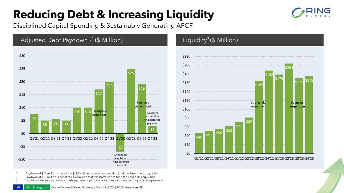 Ring Energy, Inc. 1.56x2 Q4 2022 1.65x2 Q1 2023 1.64x2 Q2 2023 1.69x2 Q3 2023 Historical Metrics 19 Value Focused Proven Strategy | March 7, 2024 | NYSE American: REI Quarterly Analysis of AFCF1 Leverage Ratio (LTM)2 Disciplined and Efficient Capital Spending Focused on Sustainably Generating AFCF Enhances Our Unrelenting Goal to Strengthen the Balance Sheet 1. Adjusted EBITDA and Adjusted Free Cash Flow are Non-GAAP financial measures. See Appendix for reconciliation to GAAP measures. 2. See Appendix for reconciliation. The Q3 2023 Leverage Ratio of 1.69x included $11.9 million deferred cash payment paid in December 2023 for the Founders Acquisition. Excluding the deferred payment in the calculation results in a Leverage Ratio of 1.64x. 3. Interest Expense included in table excludes deferred financing costs amortization. $56.3 $58.6 $53.5 $58.6 $65.4 -$42.6 -$38.9 -$31.6 -$42.4 -$38.8 -$8.2 -$9.2 -$9.3 -$10.0 -$10.3 $5.5 $10.5 $12.6 $6.1 $16.3 -$50 -$40 -$30 -$20 -$10 $0 $10 $20 $30 $40 $50 $60 $70 $80 A d j. E B IT D A / C a p E x / In t E x p Adj EBITDA $MM CapEx $MM Net Interest Exp $MM Adj. Free Cash Flow $MM 1.62x2 Q4 2023 3