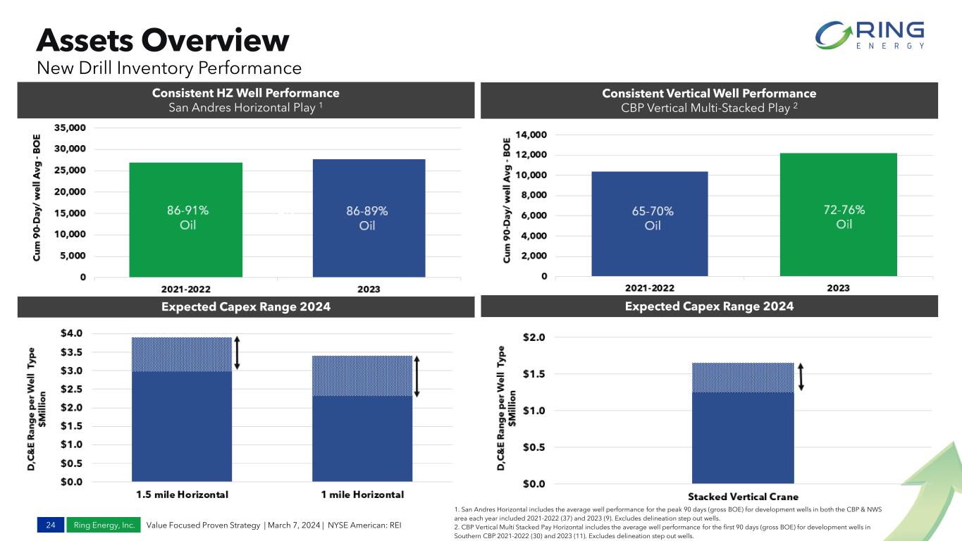 Ring Energy, Inc. Assets Overview 23 Value Focused Proven Strategy | March 7, 2024 | NYSE American: REI Historical Quarterly Net Sales Production1 1. Source is factset quarterly financials. Q3 Stronghold AQ – moved to 3 stream 6,779 7,719 7,166 7,774 7,514 8,016 10,139 12,189 12,660 11,861 12,028 1,181 991 1,078 1,380 1,356 1,325 1,726 3,044 2,966 2,853 2,839 1,414 2,623 2,667 2,557 2,643 0 2,000 4,000 6,000 8,000 10,000 12,000 14,000 16,000 18,000 20,000 Q1 '21 Q2 '21 Q3 '21 Q4 '21 Q1 '22 Q2 '22 Q3 '22 Q4 '22 Q1 '23 Q2 '23 Q3 '23 Q4 '23 N e t O il S a le s B o p d + G a s S a le s B o e p d + N G L S a le s B o e p d Company Oil Bopd Company Gas Boepd Company NGL Boepd 2021 “phased drilling” Total 13 Hz 2022 “continuous drilling” Total 27 Hz & 7 Vert. Company Record Production 19,397 DLWR Sale & pullback in capex spend in anticipation of Founders AQ Founders AQ Closed 8/15 & New Mexico Sale 1H 2023 “phased drilling” 8 Hz & 5 Vert. 2H 2023 “continuous drilling” 12 Hz & 6 Vert. 2,837 13,637 2,922 Capital allocation and drilling programs designed to maximize free cashflow generation Gaines Co Sale Oil Bopd Gas Boepd NGL Boepd