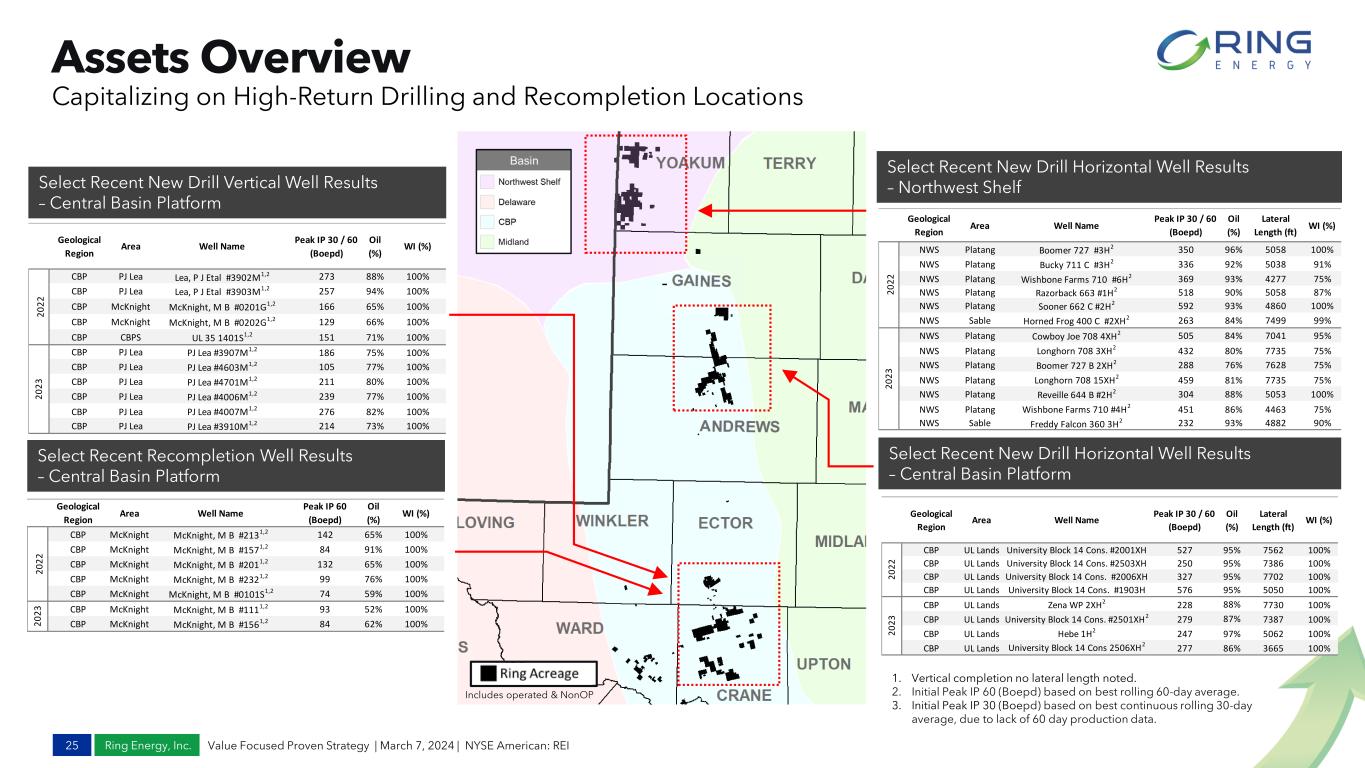 Ring Energy, Inc. Assets Overview 24 Value Focused Proven Strategy | March 7, 2024 | NYSE American: REI New Drill Inventory Performance Consistent HZ Well Performance San Andres Horizontal Play 1 Consistent Vertical Well Performance CBP Vertical Multi-Stacked Play 2 Expected Capex Range 2024 73% Oil 86-91% Oil 65-70% Oil 72-76% Oil Expected Capex Range 2024 1. San Andres Horizontal includes the average well performance for the peak 90 days (gross BOE) for development wells in both the CBP & NWS area each year included 2021-2022 (37) and 2023 (9). Excludes delineation step out wells. 2. CBP Vertical Multi Stacked Pay Horizontal includes the average well performance for the first 90 days (gross BOE) for development wells in Southern CBP 2021-2022 (30) and 2023 (11). Excludes delineation step out wells.