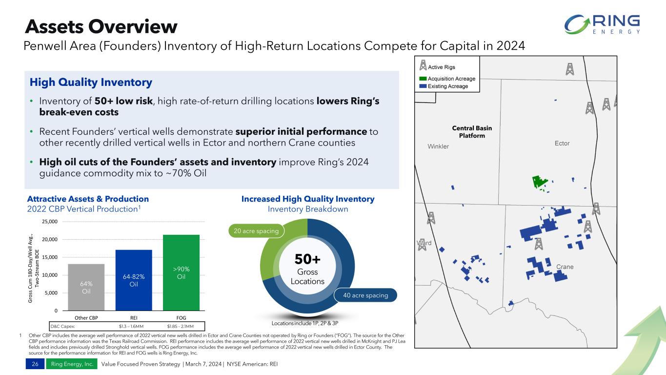 Ring Energy, Inc. Assets Overview 25 Value Focused Proven Strategy | March 7, 2024 | NYSE American: REI Capitalizing on High-Return Drilling and Recompletion Locations Select Recent New Drill Vertical Well Results – Central Basin Platform 1. Vertical completion no lateral length noted. 2. Initial Peak IP 60 (Boepd) based on best rolling 60-day average. 3. Initial Peak IP 30 (Boepd) based on best continuous rolling 30-day average, due to lack of 60 day production data. Select Recent Recompletion Well Results – Central Basin Platform Select Recent New Drill Horizontal Well Results – Northwest Shelf Select Recent New Drill Horizontal Well Results – Central Basin Platform Includes operated & NonOP Geological Region Area Well Name Peak IP 30 / 60 (Boepd) Oil (%) WI (%) CBP PJ Lea Lea, P J Etal #3902M1,2 273 88% 100% CBP PJ Lea Lea, P J Etal #3903M1,2 257 94% 100% CBP McKnight McKnight, M B #0201G1,2 166 65% 100% CBP McKnight McKnight, M B #0202G1,2 129 66% 100% CBP CBPS UL 35 1401S1,2 151 71% 100% CBP PJ Lea PJ Lea #3907M1,2 186 75% 100% CBP PJ Lea PJ Lea #4603M1,2 105 77% 100% CBP PJ Lea PJ Lea #4701M1,2 211 80% 100% CBP PJ Lea PJ Lea #4006M1,2 239 77% 100% CBP PJ Lea PJ Lea #4007M1,2 276 82% 100% CBP PJ Lea PJ Lea #3910M1,2 214 73% 100% 2 0 2 2 2 0 2 3 Geological Region Area Well Name Peak IP 60 (Boepd) Oil (%) WI (%) CBP McKnight McKnight, M B #2131,2 142 65% 100% CBP McKnight McKnight, M B #1571,2 84 91% 100% CBP McKnight McKnight, M B #2011,2 132 65% 100% CBP McKnight McKnight, M B #2321,2 99 76% 100% CBP McKnight McKnight, M B #0101S1,2 74 59% 100% CBP McKnight McKnight, M B #1111,2 93 52% 100% CBP McKnight McKnight, M B #1561,2 84 62% 100% 2 0 2 2 2 0 2 3 Geological Region Area Well Name Peak IP 30 / 60 (Boepd) Oil (%) Lateral Length (ft) WI (%) NWS Platang Boomer 727 #3H2 350 96% 5058 100% NWS Platang Bucky 711 C #3H2 336 92% 5038 91% NWS Platang Wishbone Farms 710 #6H2 369 93% 4277 75% NWS Platang Razorback 663 #1H2 518 90% 5058 87% NWS Platang Sooner 662 C #2H2 592 93% 4860 100% NWS Sable Horned Frog 400 C #2XH2 263 84% 7499 99% NWS Platang Cowboy Joe 708 4XH2 505 84% 7041 95% NWS Platang Longhorn 708 3XH2 432 80% 7735 75% NWS Platang Boomer 727 B 2XH2 288 76% 7628 75% NWS Platang Longhorn 708 15XH2 459 81% 7735 75% NWS Platang Reveille 644 B #2H2 304 88% 5053 100% NWS Platang Wishbone Farms 710 #4H2 451 86% 4463 75% NWS Sable Freddy Falcon 360 3H2 232 93% 4882 90% 2 0 2 3 2 0 2 2 Geological Region Area Well Name Peak IP 30 / 60 (Boepd) Oil (%) Lateral Length (ft) WI (%) CBP UL Lands University Block 14 Cons. #2001XH 527 95% 7562 100% CBP UL Lands University Block 14 Cons. #2503XH 250 95% 7386 100% CBP UL Lands University Block 14 Cons. #2006XH 327 95% 7702 100% CBP UL Lands University Block 14 Cons. #1903H 576 95% 5050 100% CBP UL Lands Zena WP 2XH2 228 88% 7730 100% CBP UL Lands University Block 14 Cons. #2501XH2 279 87% 7387 100% CBP UL Lands Hebe 1H2 247 97% 5062 100% CBP UL Lands University Block 14 Cons 2506XH2 277 86% 3665 100% 2 0 2 3 2 0 2 2