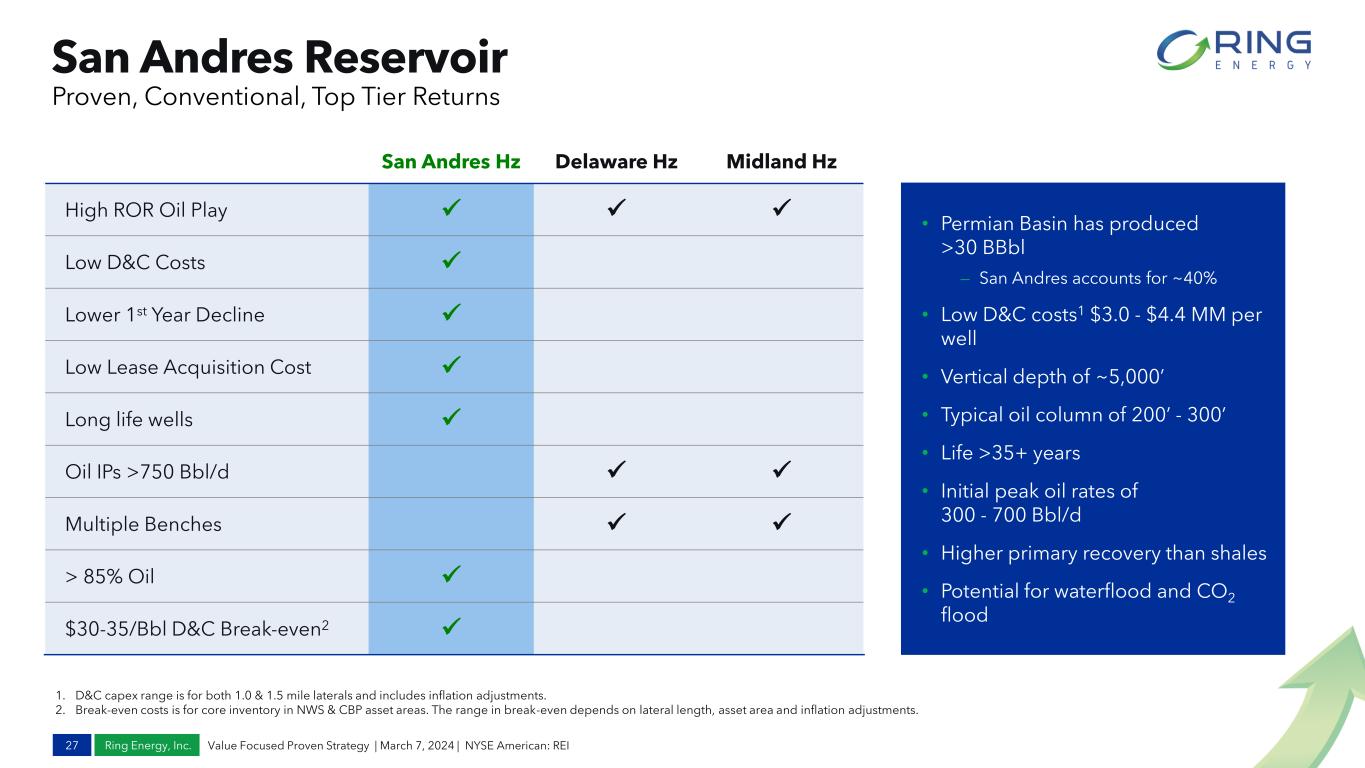 Ring Energy, Inc. Assets Overview 26 Value Focused Proven Strategy | March 7, 2024 | NYSE American: REI Central Basin Platform 1 Other CBP includes the average well performance of 2022 vertical new wells drilled in Ector and Crane Counties not operated by Ring or Founders (“FOG”). The source for the Other CBP performance information was the Texas Railroad Commission. REI performance includes the average well performance of 2022 vertical new wells drilled in McKnight and PJ Lea fields and includes previously drilled Stronghold vertical wells. FOG performance includes the average well performance of 2022 vertical new wells drilled in Ector County. The source for the performance information for REI and FOG wells is Ring Energy, Inc. High Quality Inventory • Inventory of 50+ low risk, high rate-of-return drilling locations lowers Ring’s break-even costs • Recent Founders’ vertical wells demonstrate superior initial performance to other recently drilled vertical wells in Ector and northern Crane counties • High oil cuts of the Founders’ assets and inventory improve Ring’s 2024 guidance commodity mix to ~70% Oil 40 acre spacing 20 acre spacing 50+ Gross Locations Increased High Quality Inventory Inventory Breakdown Attractive Assets & Production 2022 CBP Vertical Production1 64% Oil 64-82% Oil >90% Oil 0 5,000 10,000 15,000 20,000 25,000 Other CBP REI FOG G ro ss C u m 1 8 0 -D ay /W el l A vg ., Tw o -S tr ea m B O E D&C Capex: $1.3 – 1.6MM $1.85 - 2.1MM Locations include 1P, 2P & 3P Penwell Area (Founders) Inventory of High-Return Locations Compete for Capital in 2024