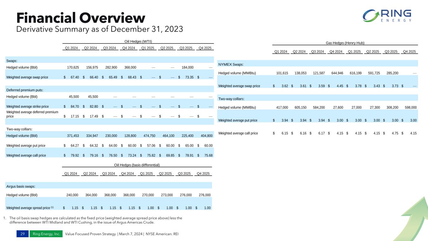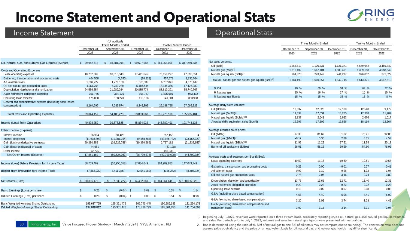 Ring Energy, Inc. Financial Overview 29 Value Focused Proven Strategy | March 7, 2024 | NYSE American: REI Derivative Summary as of December 31, 2023 1. The oil basis swap hedges are calculated as the fixed price (weighted average spread price above) less the difference between WTI Midland and WTI Cushing, in the issue of Argus Americas Crude. Gas Hedges (Henry Hub) Q1 2024 Q2 2024 Q3 2024 Q4 2024 Q1 2025 Q2 2025 Q3 2025 Q4 2025 NYMEX Swaps: Hedged volume (MMBtu) 101,615 138,053 121,587 644,946 616,199 591,725 285,200 — Weighted average swap price $ 3.62 $ 3.61 $ 3.59 $ 4.45 $ 3.78 $ 3.43 $ 3.73 $ — Two-way collars: Hedged volume (MMBtu) 417,000 605,150 584,200 27,600 27,000 27,300 308,200 598,000 Weighted average put price $ 3.94 $ 3.94 $ 3.94 $ 3.00 $ 3.00 $ 3.00 $ 3.00 $ 3.00 Weighted average call price $ 6.15 $ 6.16 $ 6.17 $ 4.15 $ 4.15 $ 4.15 $ 4.75 $ 4.15 Oil Hedges (WTI) Q1 2024 Q2 2024 Q3 2024 Q4 2024 Q1 2025 Q2 2025 Q3 2025 Q4 2025 Swaps: Hedged volume (Bbl) 170,625 156,975 282,900 368,000 — — 184,000 — Weighted average swap price $ 67.40 $ 66.40 $ 65.49 $ 68.43 $ — $ — $ 73.35 $ — Deferred premium puts: Hedged volume (Bbl) 45,500 45,500 — — — — — — Weighted average strike price $ 84.70 $ 82.80 $ — $ — $ — $ — $ — $ — Weighted average deferred premium price $ 17.15 $ 17.49 $ — $ — $ — $ — $ — $ — Two-way collars: Hedged volume (Bbl) 371,453 334,947 230,000 128,800 474,750 464,100 225,400 404,800 Weighted average put price $ 64.27 $ 64.32 $ 64.00 $ 60.00 $ 57.06 $ 60.00 $ 65.00 $ 60.00 Weighted average call price $ 79.92 $ 79.16 $ 76.50 $ 73.24 $ 75.82 $ 69.85 $ 78.91 $ 75.68 Oil Hedges (basis differential) Q1 2024 Q2 2024 Q3 2024 Q4 2024 Q1 2025 Q2 2025 Q3 2025 Q4 2025 Argus basis swaps: Hedged volume (Bbl) 240,000 364,000 368,000 368,000 270,000 273,000 276,000 276,000 Weighted average spread price (1) $ 1.15 $ 1.15 $ 1.15 $ 1.15 $ 1.00 $ 1.00 $ 1.00 $ 1.00