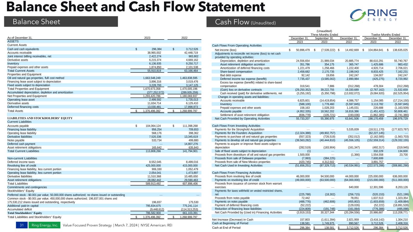 Ring Energy, Inc. Balance Sheet and Cash Flow Statement 31 Value Focused Proven Strategy | March 7, 2024 | NYSE American: REI Balance Sheet Cash Flow (Unaudited) (Unaudited) Three Months Ended Twelve Months Ended December 31, September 30, December 31, December 31, December 31, 2023 2023 2022 2023 2022 Cash Flows From Operating Activities Net income (loss) $ 50,896,479 $ (7,539,222) $ 14,492,669 $ 104,864,641 $ 138,635,025 Adjustments to reconcile net income (loss) to net cash provided by operating activities: Depreciation, depletion and amortization 24,556,654 21,989,034 20,885,774 88,610,291 55,740,767 Asset retirement obligation accretion 351,786 354,175 365,747 1,425,686 983,432 Amortization of deferred financing costs 1,221,479 1,258,466 1,222,400 4,920,714 2,706,021 Share-based compensation 2,458,682 2,170,735 2,198,043 8,833,425 7,162,231 Bad debt expense 92,142 19,656 242,247 134,007 242,247 Deferred income tax expense (benefit) 7,735,437 (3,585,002) 2,890,984 (425,275) 8,720,992 Excess tax expense (benefit) related to share-based compensation 319,541 7,886 (312,268) 478,304 (312,268) (Gain) loss on derivative contracts (29,250,352) 39,222,755 19,330,689 (2,767,162) 21,532,659 Cash received (paid) for derivative settlements, net (3,255,192) (5,350,798) (13,932,072) (9,084,920) (62,525,954) Changes in operating assets and liabilities: Accounts receivable 6,825,601 (14,419,854) 4,086,757 1,154,085 (17,214,150) Inventory (588,100) 1,778,460 (5,597,845) 3,113,782 (5,597,845) Prepaid expenses and other assets 158,163 1,028,203 1,145,031 226,688 (1,163,509) Accounts payable (4,952,335) 18,562,202 16,816,386 (1,451,422) 50,808,461 Settlement of asset retirement obligation (836,778) (105,721) (193,036) (1,862,385) (2,741,380) Net Cash Provided by Operating Activities 55,733,207 55,390,975 63,641,506 198,170,459 196,976,729 Cash Flows From Investing Activities Payments for the Stronghold Acquisition — — 5,535,839 (18,511,170) (177,823,787) Payments for the Founders Acquisition (12,324,388) (49,902,757) — (62,227,145) — Payments to purchase oil and natural gas properties (557,323) (726,519) (352,012) (2,162,585) (1,563,703) Payments to develop oil and natural gas properties (39,563,282) (40,444,810) (45,556,105) (152,559,314) (129,332,155) Payments to acquire or improve fixed assets subject to depreciation (282,519) (183,904) (161,347) (492,317) (319,945) Sale of fixed assets subject to depreciation (1) — — 332,229 134,600 Proceeds from divestiture of oil and natural gas properties 1,500,000 — (1,366) 1,554,558 23,700 Proceeds from sale of Delaware properties (7,993) (384,225) — 7,600,699 — Proceeds from sale of New Mexico properties (420,745) 4,312,502 — 3,891,757 — Net Cash Used in Investing Activities (51,656,251) (87,329,713) (40,534,991) (222,573,288) (308,881,290) Cash Flows From Financing Activities Proceeds from revolving line of credit 46,000,000 94,500,000 44,000,000 225,000,000 636,000,000 Payments on revolving line of credit (49,000,000) (63,500,000) (64,000,000) (215,000,000) (511,000,000) Proceeds from issuance of common stock from warrant exercises — — 640,000 12,301,596 8,203,126 Payments for taxes withheld on vested restricted shares, net (225,788) (18,302) (256,715) (520,153) (521,199) Proceeds from notes payable 72,442 — 78,051 1,637,513 1,323,354 Payments on notes payable (488,776) (462,606) (455,802) (1,603,659) (1,409,884) Payment of deferred financing costs (52,222) — (129,026) (52,222) (18,891,528) Reduction of financing lease liabilities (224,809) (191,748) (161,064) (776,388) (495,098) Net Cash Provided by (Used in) Financing Activities (3,919,153) 30,327,344 (20,284,556) 20,986,687 113,208,771 Net Increase (Decrease) in Cash 157,803 (1,611,394) 2,821,959 (3,416,142) 1,304,210 Cash at Beginning of Period 138,581 1,749,975 890,567 3,712,526 2,408,316 Cash at End of Period $ 296,384 $ 138,581 $ 3,712,526 $ 296,384 $ 3,712,526 As of December 31, 2023 2022 ASSETS Current Assets Cash and cash equivalents $ 296,384 $ 3,712,526 Accounts receivable 38,965,002 42,448,719 Joint interest billing receivables, net 2,422,274 983,802 Derivative assets 6,215,374 4,669,162 Inventory 6,136,935 9,250,717 Prepaid expenses and other assets 1,874,850 2,101,538 Total Current Assets 55,910,819 63,166,464 Properties and Equipment Oil and natural gas properties, full cost method 1,663,548,249 1,463,838,595 Financing lease asset subject to depreciation 3,896,316 3,019,476 Fixed assets subject to depreciation 3,228,793 3,147,125 Total Properties and Equipment 1,670,673,358 1,470,005,196 Accumulated depreciation, depletion and amortization (377,252,572) (289,935,259) Net Properties and Equipment 1,293,420,786 1,180,069,937 Operating lease asset 2,499,592 1,735,013 Derivative assets 11,634,714 6,129,410 Deferred financing costs 13,030,481 17,898,973 Total Assets $ 1,376,496,392 $ 1,268,999,797 LIABILITIES AND STOCKHOLDERS’ EQUITY Current Liabilities Accounts payable $ 104,064,124 $ 111,398,268 Financing lease liability 956,254 709,653 Operating lease liability 568,176 398,362 Derivative liabilities 7,520,336 13,345,619 Notes payable 533,734 499,880 Deferred cash payment — 14,807,276 Asset retirement obligations 165,642 635,843 Total Current Liabilities 113,808,266 141,794,901 Non-current Liabilities Deferred income taxes 8,552,045 8,499,016 Revolving line of credit 425,000,000 415,000,000 Financing lease liability, less current portion 906,330 1,052,479 Operating lease liability, less current portion 2,054,041 1,473,897 Derivative liabilities 11,510,368 10,485,650 Asset retirement obligations 28,082,442 29,590,463 Total Liabilities 589,913,492 607,896,406 Commitments and contingencies Stockholders' Equity Preferred stock - $0.001 par value; 50,000,000 shares authorized; no shares issued or outstanding — — Common stock - $0.001 par value; 450,000,000 shares authorized; 196,837,001 shares and 175,530,212 shares issued and outstanding, respectively 196,837 17