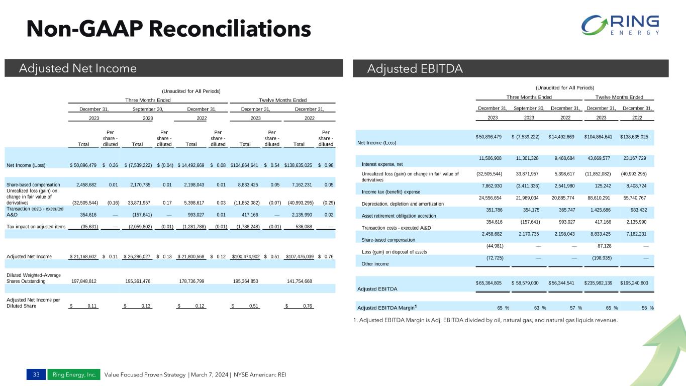 Ring Energy, Inc. The Company defines “Adjusted Cash Flow from Operations” or “ACFFO” as Net Cash Provided by Operating Activities, per the Statements of Cash Flows, less the changes in operating assets and liabilities, including accounts receivable, inventory, prepaid expenses and other assets, accounts payable, and settlement of asset retirement obligation, which are subject to variation due to the nature of the Company’s operations. Accordingly, the Company believes this non-GAAP measure is useful to investors because it is used often in its industry and allows investors to compare this metric to other companies in its peer group as well as the E&P sector. “Leverage” or the “Leverage Ratio” is calculated under our existing senior revolving credit facility and means as of any date, the ratio of (i) our consolidated total debt as of such date to (ii) our Consolidated EBITDAX for the four consecutive fiscal quarters ending on or immediately prior to such date for which financial statements are required to have been delivered under our existing senior revolving credit facility; provided that for the purposes of the definition of ‘Leverage Ratio’, (a) for the fiscal quarter ended September 30, 2022, Consolidated EBITDAX is calculated by multiplying Consolidated EBITDAX for such fiscal quarter by four, (b) for the fiscal quarter ended December 31, 2022, Consolidated EBITDAX is calculated by multiplying Consolidated EBITDAX for the two fiscal quarter period ended on December 31, 2022 by two, (c) for the fiscal quarter ended March 31, 2023, Consolidated EBITDAX is calculated by multiplying Consolidated EBITDAX for the three fiscal quarter period ended on March 31, 2023 by four-thirds, and (d) for each fiscal quarter thereafter, Consolidated EBITDAX will be calculated by adding Consolidated EBITDAX for the four consecutive fiscal quarters ending on such date. The Company defines “Consolidated EBITDAX” in accordance with our existing senior revolving credit facility and it means for any period an amount equal to the sum of (i) consolidated net income for such period plus (ii) to the extent deducted in determining consolidated net income for such period, and without duplication, (A) consolidated interest expense, (B) income tax expense determined on a consolidated basis in accordance with GAAP, (C) depreciation, depletion and amortization determined on a consolidated basis in accordance with GAAP, (D) exploration expenses determined on a consolidated basis in accordance with GAAP, and (E) all other non-cash charges acceptable to our senior revolving credit facility administrative agent determined on a consolidated basis in accordance with GAAP, in each case for such period minus (iii) all noncash income added to consolidated net income for such period; provided that, for purposes of calculating compliance with the financial covenants set forth in our senior revolving credit facility, to the extent that during such period we shall have consummated an acquisition permitted by the senior revolving credit facility or any sale, transfer or other disposition of any person, business, property or assets permitted by the senior revolving credit facility, Consolidated EBITDAX will be calculated on a pro forma basis with respect to such person, business, property or assets so acquired or disposed of. Also set forth in our existing senior revolving credit facility is the maximum permitted Leverage Ratio of 3.00. PV-10 is a financial measure not prepared in accordance with GAAP that differs from a measure under GAAP known as “standardized measure of discounted future net cash flows” in that PV-10 is calculated without including future income taxes. Management believes that the presentation of the PV-10 value of the Company’s oil and natural gas properties is relevant and useful to investors because it presents the estimated discounted future net cash flows attributable to its estimated proved reserves independent of its income tax attributes, thereby isolating the intrinsic value of the estimated future cash flows attributable to its reserves. Management believes the use of a pre-tax measure provides greater comparability of assets when evaluating companies because the timing and quantification of future income taxes is dependent on company-specific factors, many of which are difficult to determine. For these reasons, management uses and believes that the industry generally uses the PV-10 measure in evaluating and comparing acquisition candidates and assessing the potential rate of return on investments in oil and natural gas properties. PV-10 does not necessarily represent the fair market value of oil and natural gas properties. PV-10 is not a measure of financial or operational performance under GAAP, nor should it be considered in isolation or as a substitute for the standardized measure of discounted future net cash flows as defined under GAAP. The Company defines “Return on Capital Employed” or “CROCE” as Adjusted Cash Flow from Operations divided by average debt and shareholder equity for the period. The Company defines All-In Cash Operating Costs, a non-GAAP financial measure, as “all in cash” costs including lease operating expenses, G&A costs excluding share-based compensation (“cash G&A”), interest expense, workovers and other operating expenses, production taxes, ad valorem taxes, and gathering/transportation costs. Management believes that this metric provides useful additional information to investors to assess the Company’s operating costs in comparison to its peers, which may vary from company to company. Non-GAAP Disclosure 32 Value Focused Proven Strategy | March 7, 2024 | NYSE American: REI Certain financial information included in this Presentation are not measures of financial performance recognized by accounting principles generally accepted in the United States (“GAAP”). These non-GAAP financial measures are “Adjusted Net Income,