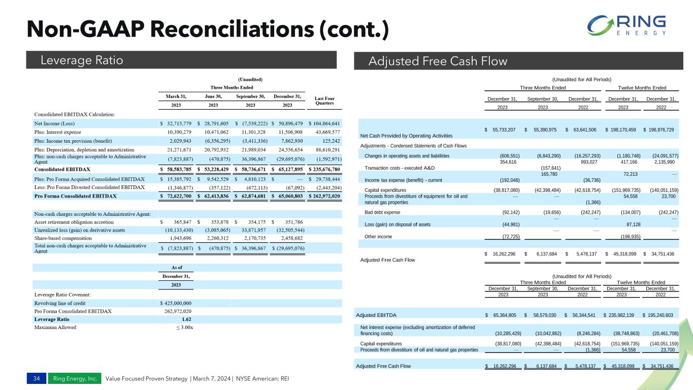 Ring Energy, Inc. Non-GAAP Reconciliations 33 Value Focused Proven Strategy | March 7, 2024 | NYSE American: REI Adjusted Net Income Adjusted EBITDA 1. Adjusted EBITDA Margin is Adj. EBITDA divided by oil, natural gas, and natural gas liquids revenue. (Unaudited for All Periods) Three Months Ended Twelve Months Ended December 31, September 30, December 31, December 31, December 31, 2023 2023 2022 2023 2022 Total Per share - diluted Total Per share - diluted Total Per share - diluted Total Per share - diluted Total Per share - diluted Net Income (Loss) $ 50,896,479 $ 0.26 $ (7,539,222) $ (0.04) $ 14,492,669 $ 0.08 $104,864,641 $ 0.54 $138,635,025 $ 0.98 Share-based compensation 2,458,682 0.01 2,170,735 0.01 2,198,043 0.01 8,833,425 0.05 7,162,231 0.05 Unrealized loss (gain) on change in fair value of derivatives (32,505,544) (0.16) 33,871,957 0.17 5,398,617 0.03 (11,852,082) (0.07) (40,993,295) (0.29) Transaction costs - executed A&D 354,616 — (157,641) — 993,027 0.01 417,166 — 2,135,990 0.02 Tax impact on adjusted items (35,631) — (2,059,802) (0.01) (1,281,788) (0.01) (1,788,248) (0.01) 536,088 — Adjusted Net Income $ 21,168,602 $ 0.11 $ 26,286,027 $ 0.13 $ 21,800,568 $ 0.12 $100,474,902 $ 0.51 $107,476,039 $ 0.76 Diluted Weighted-Average Shares Outstanding 197,848,812 195,361,476 178,736,799 195,364,850 141,754,668 Adjusted Net Income per Diluted Share $ 0.11 $ 0.13 $ 0.12 $ 0.51 $ 0.76 (Unaudited for All Periods) Three Months Ended Twelve Months Ended December 31, September 30, December 31, December 31, December 31, 2023 2023 2022 2023 2022 Net Income (Loss) $ 50,896,479 $ (7,539,222) $ 14,492,669 $104,864,641 $138,635,025 Interest expense, net 11,506,908 11,301,328 9,468,684 43,669,577 23,167,729 Unrealized loss (gain) on change in fair value of derivatives (32,505,544) 33,871,957 5,398,617 (11,852,082) (40,993,295) Income tax (benefit) expense 7,862,930 (3,411,336) 2,541,980 125,242 8,408,724 Depreciation, depletion and amortization 24,556,654 21,989,034 20,885,774 88,610,291 55,740,767 Asset retirement obligation accretion 351,786 354,175 365,747 1,425,686 983,432 Transaction costs - executed A&D 354,616 (157,641) 993,027 417,166 2,135,990 Share-based compensation 2,458,682 2,170,735 2,198,043 8,833,425 7,162,231 Loss (gain) on disposal of assets (44,981) — — 87,128 — Other income (72,725) — — (198,935) — Adjusted EBITDA $ 65,364,805 $ 58,579,030 $ 56,344,541 $235,982,139 $195,240,603 Adjusted EBITDA Margin 65 % 63 % 57 % 65 % 56 %1