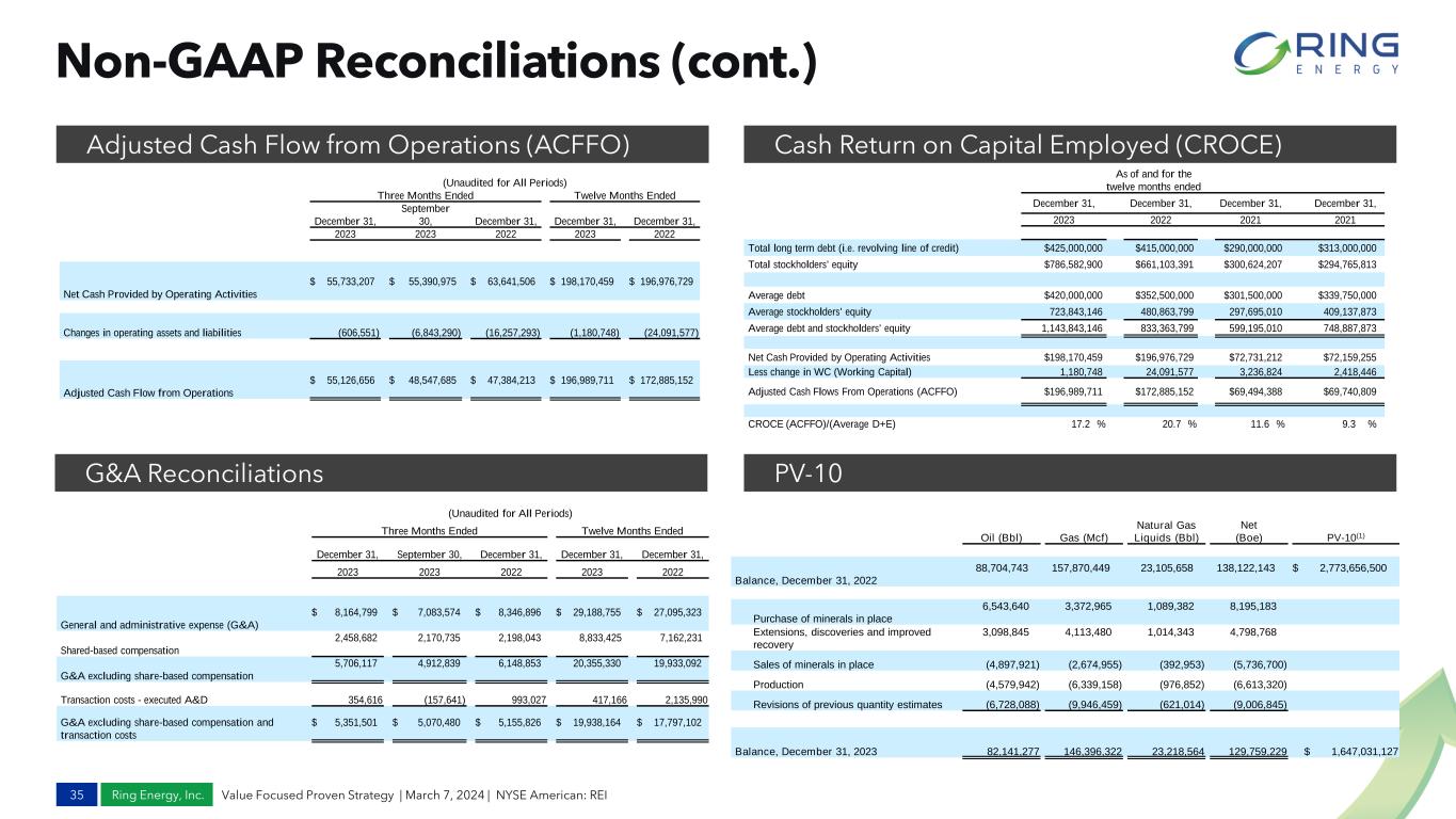 Ring Energy, Inc. Non-GAAP Reconciliations (cont.) 34 Value Focused Proven Strategy | March 7, 2024 | NYSE American: REI Leverage Ratio Adjusted Free Cash Flow (Unaudited for All Periods) Three Months Ended Twelve Months Ended December 31, September 30, December 31, December 31, December 31, 2023 2023 2022 2023 2022 Net Cash Provided by Operating Activities $ 55,733,207 $ 55,390,975 $ 63,641,506 $ 198,170,459 $ 196,976,729 Adjustments - Condensed Statements of Cash Flows Changes in operating assets and liabilities (606,551) (6,843,290) (16,257,293) (1,180,748) (24,091,577) Transaction costs - executed A&D 354,616 (157,641) 993,027 417,166 2,135,990 Income tax expense (benefit) - current (192,048) 165,780 (36,736) 72,213 — Capital expenditures (38,817,080) (42,398,484) (42,618,754) (151,969,735) (140,051,159) Proceeds from divestiture of equipment for oil and natural gas properties — — (1,366) 54,558 23,700 Bad debt expense (92,142) (19,656) (242,247) (134,007) (242,247) Loss (gain) on disposal of assets (44,981) — — 87,128 — Other income (72,725) — — (198,935) — Adjusted Free Cash Flow $ 16,262,296 $ 6,137,684 $ 5,478,137 $ 45,318,099 $ 34,751,436 (Unaudited for All Periods) Three Months Ended Twelve Months Ended December 31, September 30, December 31, December 31, December 31, 2023 2023 2022 2023 2022 Adjusted EBITDA $ 65,364,805 $ 58,579,030 $ 56,344,541 $ 235,982,139 $ 195,240,603 Net interest expense (excluding amortization of deferred financing costs) (10,285,429) (10,042,862) (8,246,284) (38,748,863) (20,461,708) Capital expenditures (38,817,080) (42,398,484) (42,618,754) (151,969,735) (140,051,159) Proceeds from divestiture of oil and natural gas properties — — (1,366) 54,558 23,700 Adjusted Free Cash Flow $ 16,262,296 $ 6,137,684 $ 5,478,137 $ 45,318,099 $ 34,751,436