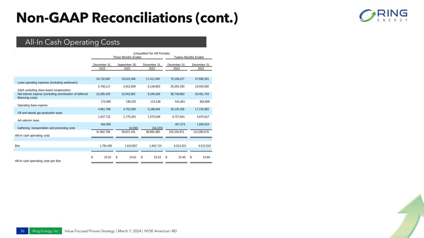 Ring Energy, Inc. Non-GAAP Reconciliations (cont.) 35 Value Focused Proven Strategy | March 7, 2024 | NYSE American: REI Adjusted Cash Flow from Operations (ACFFO) Cash Return on Capital Employed (CROCE) G&A Reconciliations PV-10 (Unaudited for All Periods) Three Months Ended Twelve Months Ended December 31, September 30, December 31, December 31, December 31, 2023 2023 2022 2023 2022 Net Cash Provided by Operating Activities $ 55,733,207 $ 55,390,975 $ 63,641,506 $ 198,170,459 $ 196,976,729 Changes in operating assets and liabilities (606,551) (6,843,290) (16,257,293) (1,180,748) (24,091,577) Adjusted Cash Flow from Operations $ 55,126,656 $ 48,547,685 $ 47,384,213 $ 196,989,711 $ 172,885,152 (Unaudited for All Periods) Three Months Ended Twelve Months Ended December 31, September 30, December 31, December 31, December 31, 2023 2023 2022 2023 2022 General and administrative expense (G&A) $ 8,164,799 $ 7,083,574 $ 8,346,896 $ 29,188,755 $ 27,095,323 Shared-based compensation 2,458,682 2,170,735 2,198,043 8,833,425 7,162,231 G&A excluding share-based compensation 5,706,117 4,912,839 6,148,853 20,355,330 19,933,092 Transaction costs - executed A&D 354,616 (157,641) 993,027 417,166 2,135,990 G&A excluding share-based compensation and transaction costs $ 5,351,501 $ 5,070,480 $ 5,155,826 $ 19,938,164 $ 17,797,102 Oil (Bbl) Gas (Mcf) Natural Gas Liquids (Bbl) Net (Boe) PV-10(1) Balance, December 31, 2022 88,704,743 157,870,449 23,105,658 138,122,143 $ 2,773,656,500 Purchase of minerals in place 6,543,640 3,372,965 1,089,382 8,195,183 Extensions, discoveries and improved recovery 3,098,845 4,113,480 1,014,343 4,798,768 Sales of minerals in place (4,897,921) (2,674,955) (392,953) (5,736,700) Production (4,579,942) (6,339,158) (976,852) (6,613,320) Revisions of previous quantity estimates (6,728,088) (9,946,459) (621,014) (9,006,845) Balance, December 31, 2023 82,141,277 146,396,322 23,218,564 129,759,229 $ 1,647,031,127 As of and for the twelve months ended December 31, December 31, December 31, December 31, 2023 2022 2021 2021 Total long term debt (i.e. revolving line of credit) $425,000,000 $415,000,000 $290,000,000 $313,000,000 Total stockholders' equity $786,582,900 $661,103,391 $300,624,207 $294,765,813 Average debt $420,000,000 $352,500,000 $301,500,000 $339,750,000 Average stockholders' equity 723,843,146 480,863,799 297,695,010 409,137,873 Average debt and stockholders' equity 1,143,843,146 833,363,799 599,195,010 748,887,873 Net Cash Provided by Operating Activities $198,170,459 $196,976,729 $72,731,212 $72,159,255 Less change in WC (Working Capital) 1,180,748 24,091,577 3,236,824 2,418,446 Adjusted Cash Flows From Operations (ACFFO) $196,989,711 $172,885,152 $69,494,388 $69,740,809 CROCE (ACFFO)/(Average D+E) 17.2 % 20.7 % 11.6 % 9.3 %