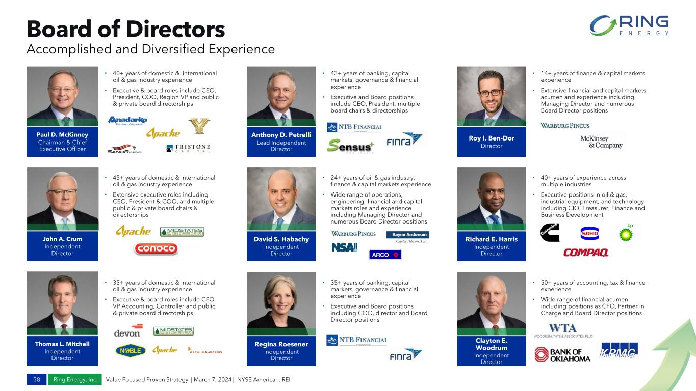 Ring Energy, Inc. Experienced Management Team 37 Value Focused Proven Strategy | March 7, 2024 | NYSE American: REI Shared Vision with a Track Record of Success • 40+ years of domestic & international oil & gas industry experience • Executive & board roles include CEO, President, COO, Region VP and public & private board directorships Paul D. McKinney Chairman & Chief Executive Officer Marinos Baghdati EVP of Operations Stephen D. Brooks EVP of Land, Legal, HR & Marketing Alexander Dyes EVP of Engineering & Corporate Strategy Travis Thomas EVP & Chief Financial Officer Hollie Lamb VP of NonOP Reservoir Engineering / O&G Marketing • 19+ years of oil & gas industry experience • Operational experience in drilling, completions and production including VP Operations, Operations manager, multiple engineering roles • 45+ years of oil & gas industry experience • Extensive career as landman including VP Land & Legal, VP HR VP Land and Land Manager • 17+ years of oil & gas industry experience • Multi-disciplined experience including VP A&D, VP Engineering, Director Strategy, multiple engineering & operational roles • 18+ years of oil & gas industry experience & accounting experience • High level financial experience including CAO, VP Finance, Controller, Treasurer • 20+ years of oil & gas industry experience • Previously Partner of HeLMS Oil & Gas, VP Engineering, Reservoir & Geologic Engineer