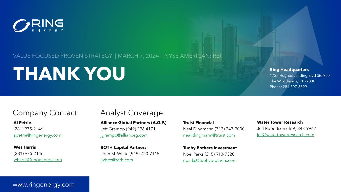 www.ringenergy.com THANK YOU Company Contact Al Petrie (281) 975-2146 apetrie@ringenergy.com Wes Harris (281) 975-2146 wharris@ringenergy.com Analyst Coverage Alliance Global Partners (A.G.P.) Jeff Grampp (949) 296 4171 jgrampp@allianceg.com ROTH Capital Partners John M. White (949) 720-7115 jwhite@roth.com Truist Financial Neal Dingmann (713) 247-9000 neal.dingmann@truist.com Tuohy Bothers Investment Noel Parks (215) 913-7320 nparks@tuohybrothers.com Water Tower Research Jeff Robertson (469) 343-9962 jeff@watertowerresearch.com Ring Headquarters 1725 Hughes Landing Blvd Ste 900 The Woodlands, TX 77830 Phone: 281-397-3699