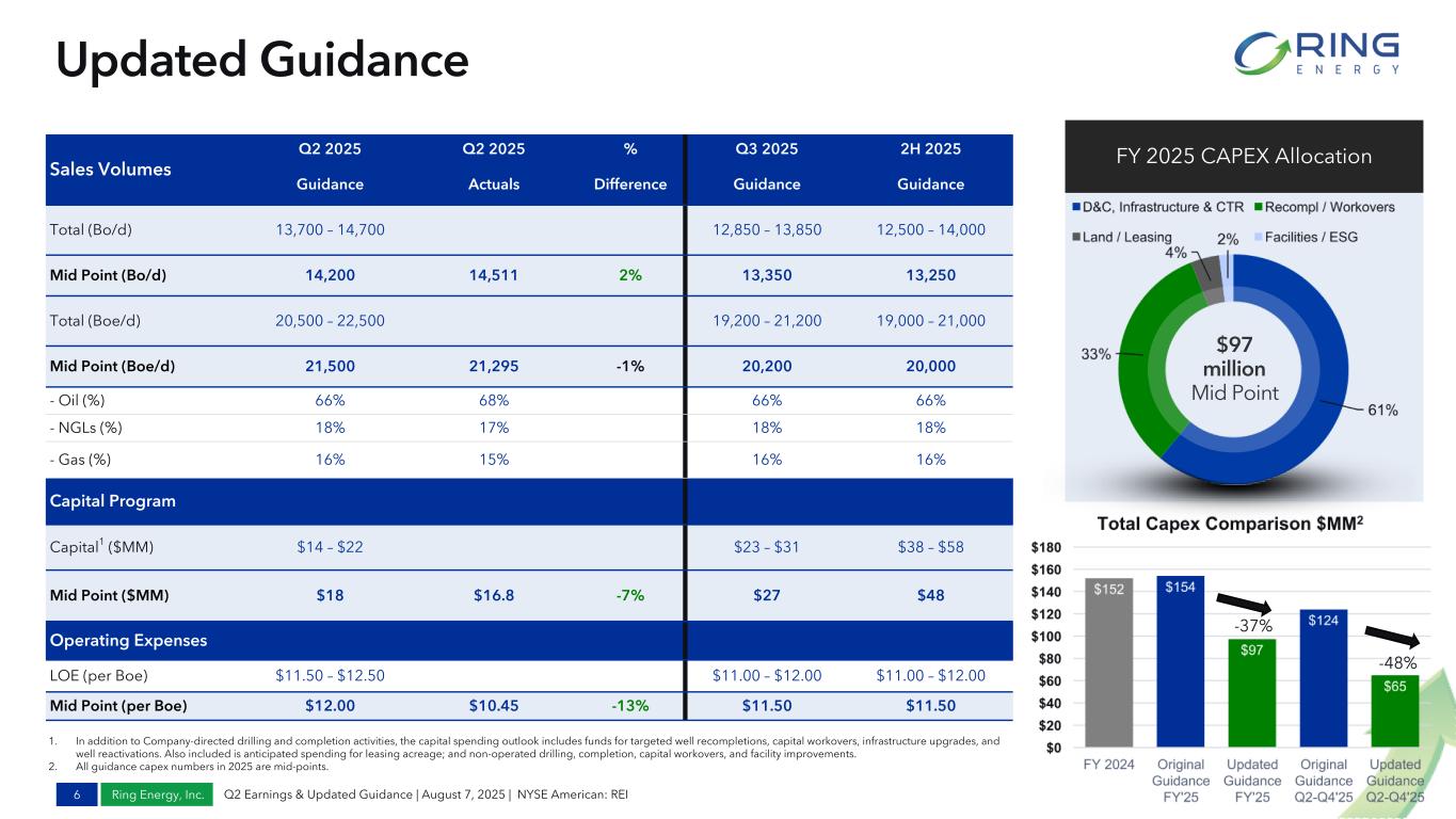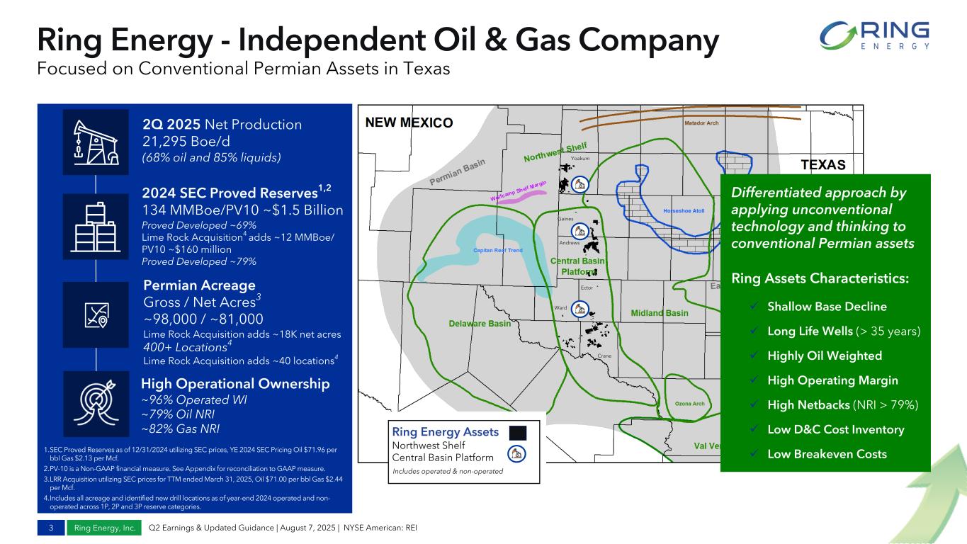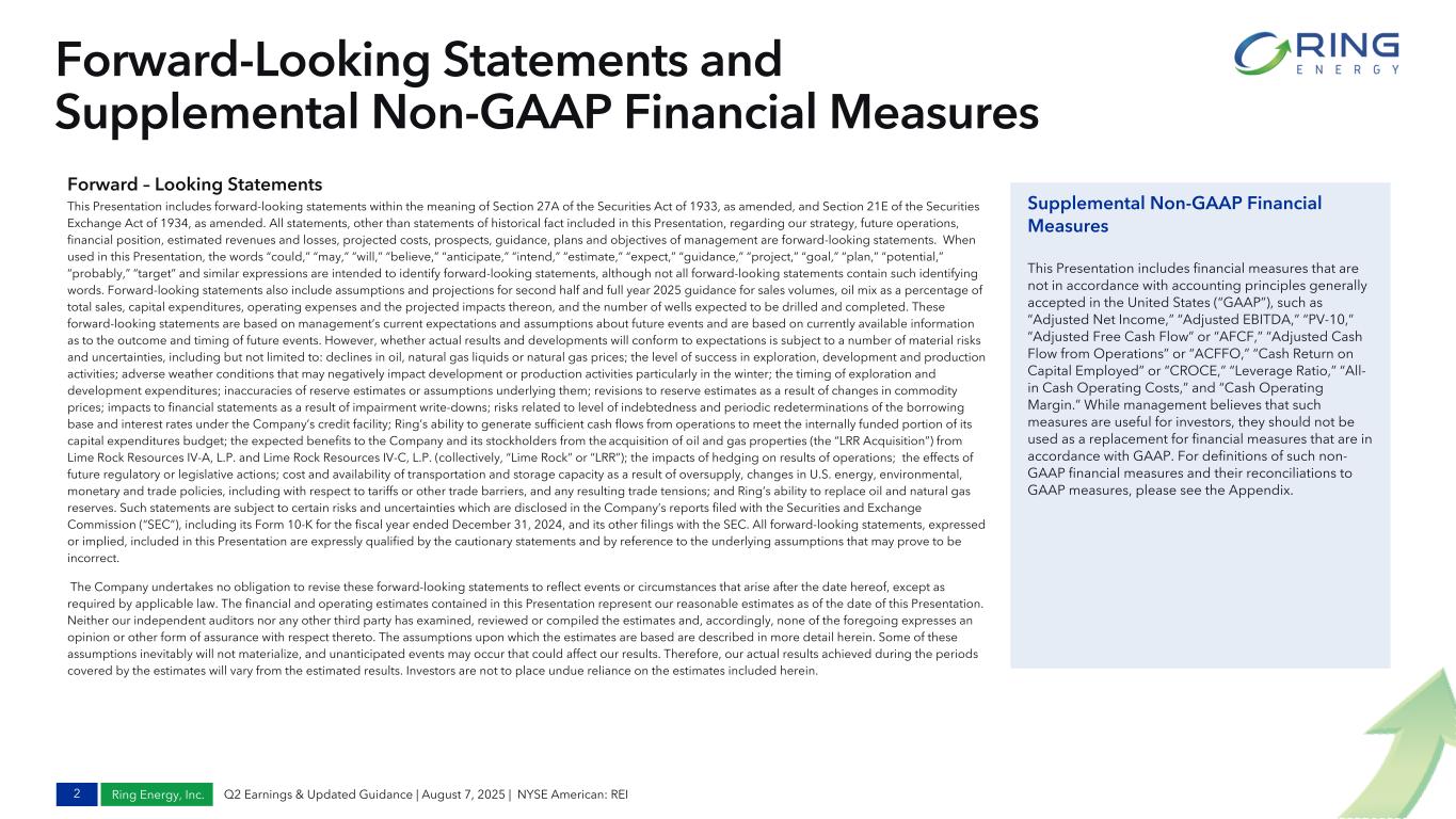 Ring Energy, Inc. Q2 Earnings & Updated Guidance | August 7, 2025 | NYSE American: REI Forward – Looking Statements This Presentation includes forward-looking statements within the meaning of Section 27A of the Securities Act of 1933, as amended, and Section 21E of the Securities Exchange Act of 1934, as amended. All statements, other than statements of historical fact included in this Presentation, regarding our strategy, future operations, financial position, estimated revenues and losses, projected costs, prospects, guidance, plans and objectives of management are forward-looking statements. When used in this Presentation, the words “could,” “may,” “will,” “believe,” “anticipate,” “intend,” “estimate,” “expect,” “guidance,” “project,” “goal,” “plan,” “potential,” “probably,” “target” and similar expressions are intended to identify forward-looking statements, although not all forward-looking statements contain such identifying words. Forward-looking statements also include assumptions and projections for second half and full year 2025 guidance for sales volumes, oil mix as a percentage of total sales, capital expenditures, operating expenses and the projected impacts thereon, and the number of wells expected to be drilled and completed. These forward-looking statements are based on management’s current expectations and assumptions about future events and are based on currently available information as to the outcome and timing of future events. However, whether actual results and developments will conform to expectations is subject to a number of material risks and uncertainties, including but not limited to: declines in oil, natural gas liquids or natural gas prices; the level of success in exploration, development and production activities; adverse weather conditions that may negatively impact development or production activities particularly in the winter; the timing of exploration and development expenditures; inaccuracies of reserve estimates or assumptions underlying them; revisions to reserve estimates as a result of changes in commodity prices; impacts to financial statements as a result of impairment write-downs; risks related to level of indebtedness and periodic redeterminations of the borrowing base and interest rates under the Company’s credit facility; Ring’s ability to generate sufficient cash flows from operations to meet the internally funded portion of its capital expenditures budget; the expected benefits to the Company and its stockholders from the acquisition of oil and gas properties (the “LRR Acquisition”) from Lime Rock Resources IV-A, L.P. and Lime Rock Resources IV-C, L.P. (collectively, “Lime Rock” or “LRR”); the impacts of hedging on results of operations; the effects of future regulatory or legislative actions; cost and availability of transportation and storage capacity as a result of oversupply, changes in U.S. energy, environmental, monetary and trade policies, including with respect to tariffs or other trade barriers, and any resulting trade tensions; and Ring’s ability to replace oil and natural gas reserves. Such statements are subject to certain risks and uncertainties which are disclosed in the Company’s reports filed with the Securities and Exchange Commission (“SEC”), including its Form 10-K for the fiscal year ended December 31, 2024, and its other filings with the SEC. All forward-looking statements, expressed or implied, included in this Presentation are expressly qualified by the cautionary statements and by reference to the underlying assumptions that may prove to be incorrect. The Company undertakes no obligation to revise these forward-looking statements to reflect events or circumstances that arise after the date hereof, except as required by applicable law. The financial and operating estimates contained in this Presentation represent our reasonable estimates as of the date of this Presentation. Neither our independent auditors nor any other third party has examined, reviewed or compiled the estimates and, accordingly, none of the foregoing expresses an opinion or other form of assurance with respect thereto. The assumptions upon which the estimates are based are described in more detail herein. Some of these assumptions inevitably will not materialize, and unanticipated events may occur that could affect our results. Therefore, our actual results achieved during the periods covered by the estimates will vary from the estimated results. Investors are not to place undue reliance on the estimates included herein. 2 Supplemental Non-GAAP Financial Measures This Presentation includes financial measures that are not in accordance with accounting principles generally accepted in the United States (“GAAP”), such as “Adjusted Net Income,” “Adjusted EBITDA,” “PV-10,” “Adjusted Free Cash Flow” or “AFCF,” “Adjusted Cash Flow from Operations” or “ACFFO,” “Cash Return on Capital Employed” or “CROCE,” “Leverage Ratio,” “All- in Cash Operating Costs,” and “Cash Operating Margin.” While management believes that such measures are useful for investors, they should not be used as a replacement for financial measures that are in accordance with GAAP. For definitions of such non- GAAP financial measures and their reconciliations to GAAP measures, please see the Appendix. Forward-Looking Statements and Supplemental Non-GAAP Financial Measures