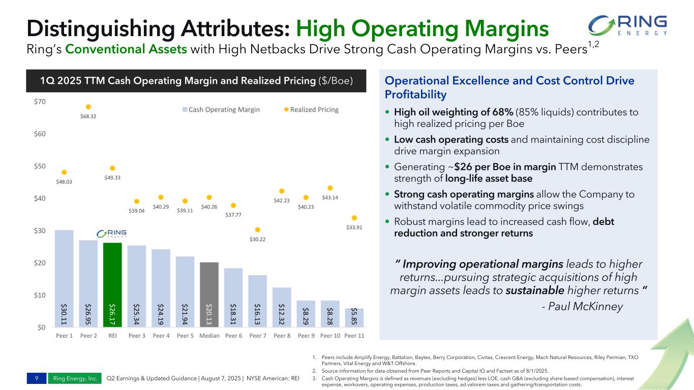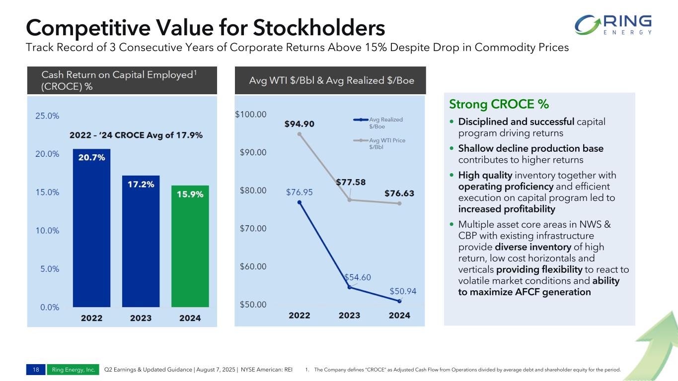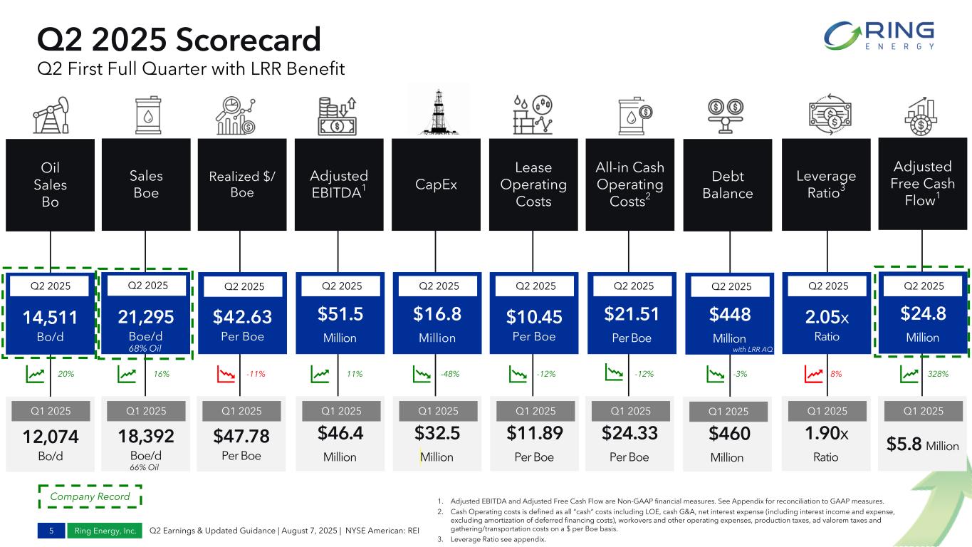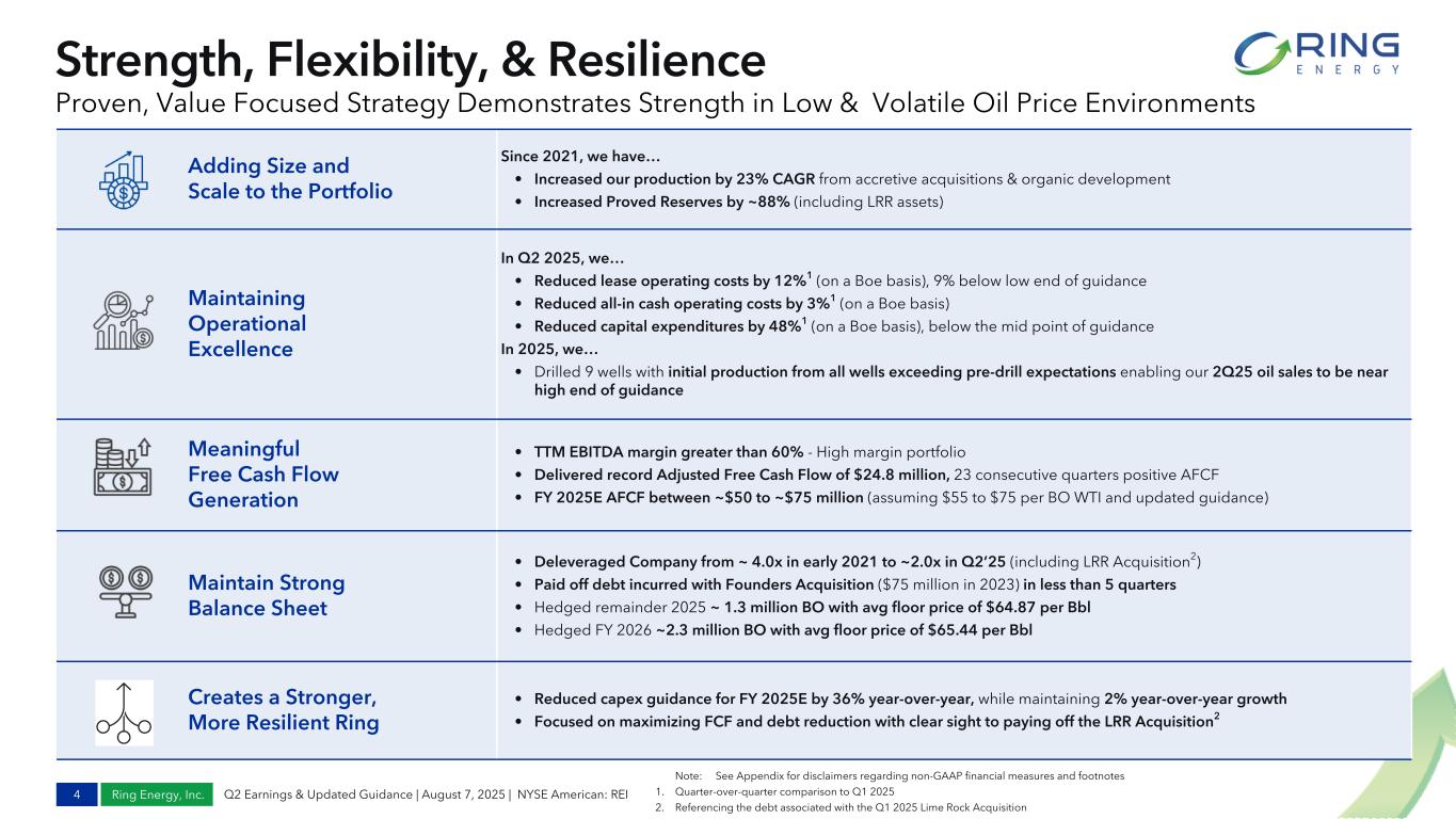 Ring Energy, Inc. Q2 Earnings & Updated Guidance | August 7, 2025 | NYSE American: REI Forward – Looking Statements This Presentation includes forward-looking statements within the meaning of Section 27A of the Securities Act of 1933, as amended, and Section 21E of the Securities Exchange Act of 1934, as amended. All statements, other than statements of historical fact included in this Presentation, regarding our strategy, future operations, financial position, estimated revenues and losses, projected costs, prospects, guidance, plans and objectives of management are forward-looking statements. When used in this Presentation, the words “could,” “may,” “will,” “believe,” “anticipate,” “intend,” “estimate,” “expect,” “guidance,” “project,” “goal,” “plan,” “potential,” “probably,” “target” and similar expressions are intended to identify forward-looking statements, although not all forward-looking statements contain such identifying words. Forward-looking statements also include assumptions and projections for second half and full year 2025 guidance for sales volumes, oil mix as a percentage of total sales, capital expenditures, operating expenses and the projected impacts thereon, and the number of wells expected to be drilled and completed. These forward-looking statements are based on management’s current expectations and assumptions about future events and are based on currently available information as to the outcome and timing of future events. However, whether actual results and developments will conform to expectations is subject to a number of material risks and uncertainties, including but not limited to: declines in oil, natural gas liquids or natural gas prices; the level of success in exploration, development and production activities; adverse weather conditions that may negatively impact development or production activities particularly in the winter; the timing of exploration and development expenditures; inaccuracies of reserve estimates or assumptions underlying them; revisions to reserve estimates as a result of changes in commodity prices; impacts to financial statements as a result of impairment write-downs; risks related to level of indebtedness and periodic redeterminations of the borrowing base and interest rates under the Company’s credit facility; Ring’s ability to generate sufficient cash flows from operations to meet the internally funded portion of its capital expenditures budget; the expected benefits to the Company and its stockholders from the acquisition of oil and gas properties (the “LRR Acquisition”) from Lime Rock Resources IV-A, L.P. and Lime Rock Resources IV-C, L.P. (collectively, “Lime Rock” or “LRR”); the impacts of hedging on results of operations; the effects of future regulatory or legislative actions; cost and availability of transportation and storage capacity as a result of oversupply, changes in U.S. energy, environmental, monetary and trade policies, including with respect to tariffs or other trade barriers, and any resulting trade tensions; and Ring’s ability to replace oil and natural gas reserves. Such statements are subject to certain risks and uncertainties which are disclosed in the Company’s reports filed with the Securities and Exchange Commission (“SEC”), including its Form 10-K for the fiscal year ended December 31, 2024, and its other filings with the SEC. All forward-looking statements, expressed or implied, included in this Presentation are expressly qualified by the cautionary statements and by reference to the underlying assumptions that may prove to be incorrect. The Company undertakes no obligation to revise these forward-looking statements to reflect events or circumstances that arise after the date hereof, except as required by applicable law. The financial and operating estimates contained in this Presentation represent our reasonable estimates as of the date of this Presentation. Neither our independent auditors nor any other third party has examined, reviewed or compiled the estimates and, accordingly, none of the foregoing expresses an opinion or other form of assurance with respect thereto. The assumptions upon which the estimates are based are described in more detail herein. Some of these assumptions inevitably will not materialize, and unanticipated events may occur that could affect our results. Therefore, our actual results achieved during the periods covered by the estimates will vary from the estimated results. Investors are not to place undue reliance on the estimates included herein. 2 Supplemental Non-GAAP Financial Measures This Presentation includes financial measures that are not in accordance with accounting principles generally accepted in the United States (“GAAP”), such as “Adjusted Net Income,” “Adjusted EBITDA,” “PV-10,” “Adjusted Free Cash Flow” or “AFCF,” “Adjusted Cash Flow from Operations” or “ACFFO,” “Cash Return on Capital Employed” or “CROCE,” “Leverage Ratio,” “All- in Cash Operating Costs,” and “Cash Operating Margin.” While management believes that such measures are useful for investors, they should not be used as a replacement for financial measures that are in accordance with GAAP. For definitions of such non- GAAP financial measures and their reconciliations to GAAP measures, please see the Appendix. Forward-Looking Statements and Supplemental Non-GAAP Financial Measures