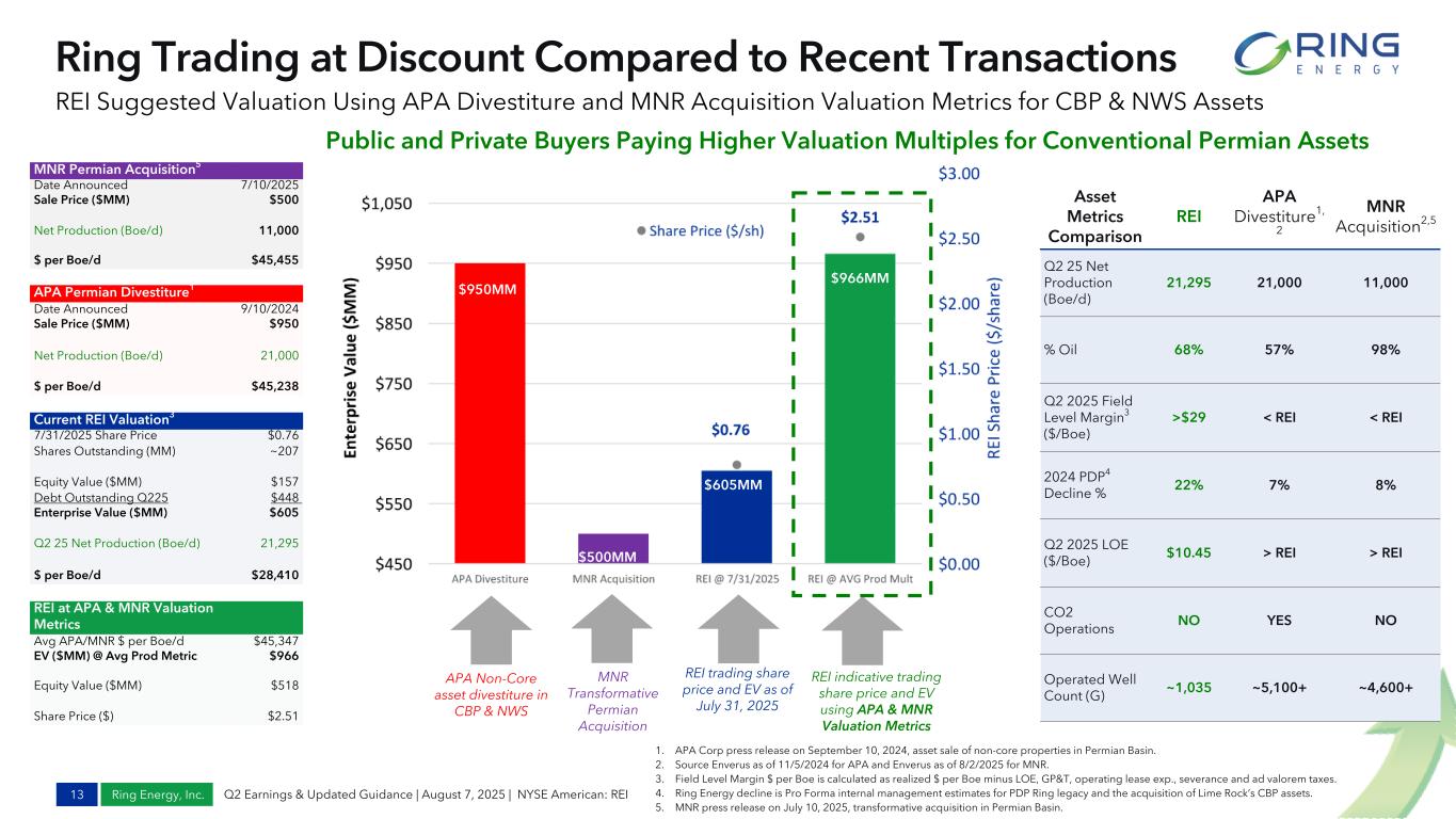 Ring Energy, Inc. Q2 Earnings & Updated Guidance | August 7, 2025 | NYSE American: REI Permian Basin – Conventional Opportunities 12 Focused on Consolidating Conventional Assets in the Central Basin Platform & Northwest Shelf Source: Enverus, Companies include Basin O&G, Blackbeard Operating, Boyd & McWilliams, Burk Royalty, ConocoPhillips, Crescent Energy, Diversified, Elevation Resources, Formentera Partners, Hilcorp, Kinder Morgan, OXY, Riley Petroleum, Ring Energy, Diversified Energy, Mach Natural Resources, Texland Petroleum, Diamondback Energy and Two P Partners G ro ss P ro d uc ti o n (2 -S tr ea m M b o e/ d ) Delaware Basin CBP NWS Eastern Shelf Midland Basin Publics Privates REI CBP/NWS Publics CBP/NWS Privates The Prize in CBP & NWS (Texas Only) is… ~ 396,000 Boepd (G) 82% Oil (April. 2025) % Oil 80% 68% 78% 80% 78% 85% 86% 60% 91% 91% 64% 82% 77% 71% 50% 88% 92% 92% 67% 80% Ranking Two P Partners Acquire accretive, balance sheet enhancing CBP & NWS assets ü CBP & NWS remain the “shale era” underexplored opportunity in the Permian Basin ü Conventional opportunities are the focus of Ring Energy’s deep bench of technical talent ü Ring has a proven track record of generating superior returns by applying new drilling and completion technologies to overlooked conventional zones ü M&A wave of conventional targets continues with divestitures from majors and large independents ü Lower cost, shallower decline, and less public E&P competition sets the stage for accretive acquisitions ü We view CBP & NWS assets as targets for growth Boyd & McWilliams