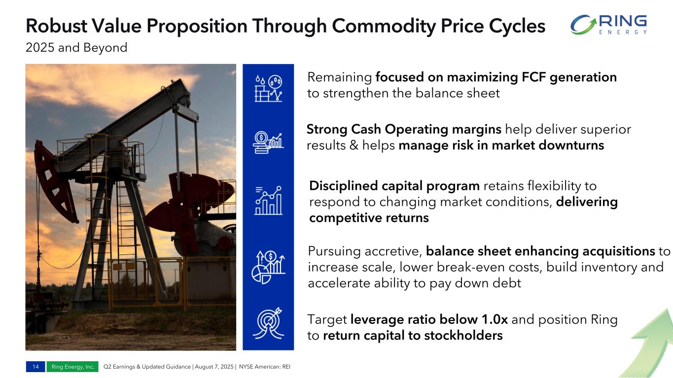 Ring Energy, Inc. Q2 Earnings & Updated Guidance | August 7, 2025 | NYSE American: REI Robust Value Proposition Through Commodity Price Cycles 14 2025 and Beyond Target leverage ratio below 1.0x and position Ring to return capital to stockholders Remaining focused on maximizing FCF generation to strengthen the balance sheet Strong Cash Operating margins help deliver superior results & helps manage risk in market downturns Disciplined capital program retains flexibility to respond to changing market conditions, delivering competitive returns Pursuing accretive, balance sheet enhancing acquisitions to increase scale, lower break-even costs, build inventory and accelerate ability to pay down debt