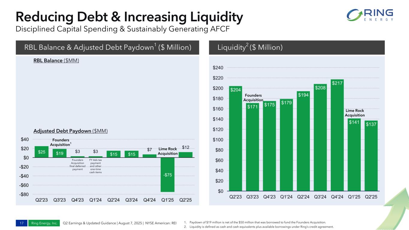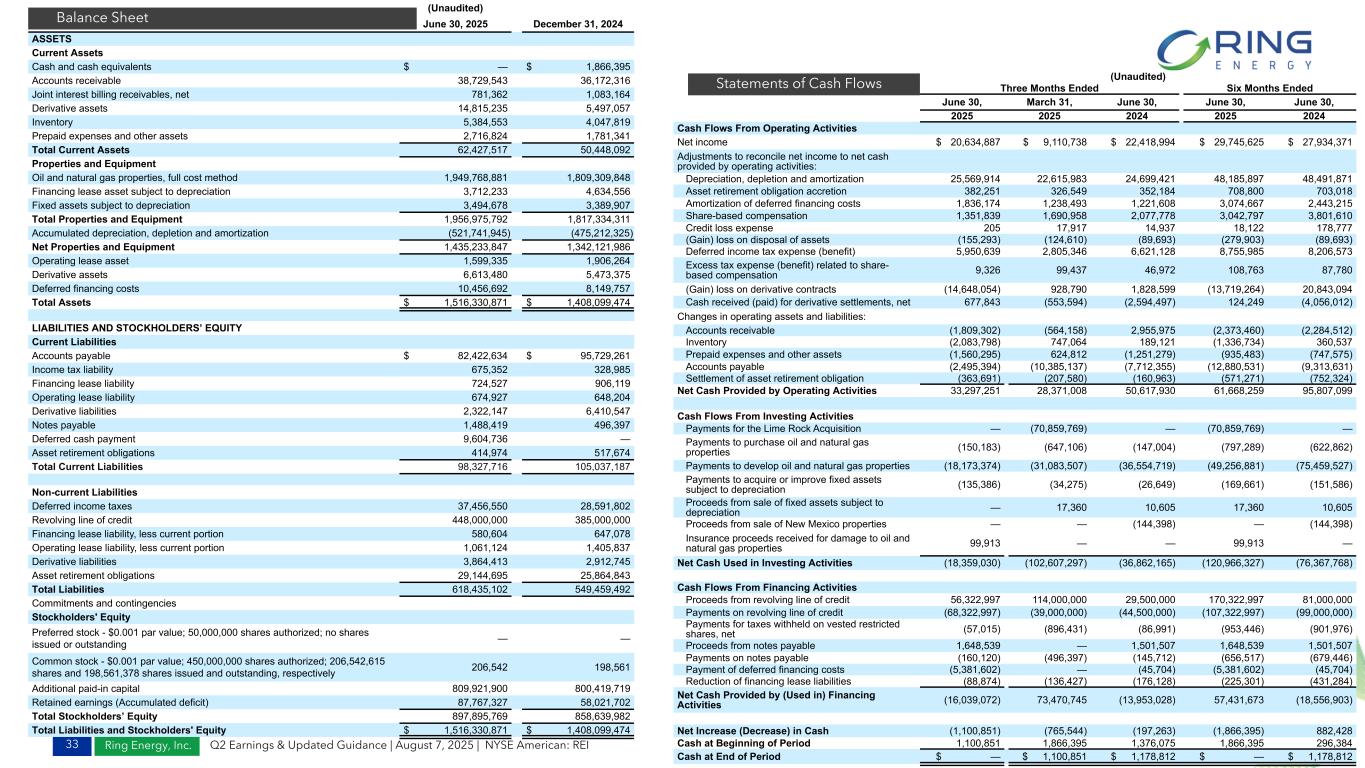Ring Energy, Inc. Q2 Earnings & Updated Guidance | August 7, 2025 | NYSE American: REI33 Statements of Cash Flows Balance Sheet (Unaudited) June 30, 2025 December 31, 2024 ASSETS Current Assets Cash and cash equivalents $ — $ 1,866,395 Accounts receivable 38,729,543 36,172,316 Joint interest billing receivables, net 781,362 1,083,164 Derivative assets 14,815,235 5,497,057 Inventory 5,384,553 4,047,819 Prepaid expenses and other assets 2,716,824 1,781,341 Total Current Assets 62,427,517 50,448,092 Properties and Equipment Oil and natural gas properties, full cost method 1,949,768,881 1,809,309,848 Financing lease asset subject to depreciation 3,712,233 4,634,556 Fixed assets subject to depreciation 3,494,678 3,389,907 Total Properties and Equipment 1,956,975,792 1,817,334,311 Accumulated depreciation, depletion and amortization (521,741,945) (475,212,325) Net Properties and Equipment 1,435,233,847 1,342,121,986 Operating lease asset 1,599,335 1,906,264 Derivative assets 6,613,480 5,473,375 Deferred financing costs 10,456,692 8,149,757 Total Assets $ 1,516,330,871 $ 1,408,099,474 LIABILITIES AND STOCKHOLDERS’ EQUITY Current Liabilities Accounts payable $ 82,422,634 $ 95,729,261 Income tax liability 675,352 328,985 Financing lease liability 724,527 906,119 Operating lease liability 674,927 648,204 Derivative liabilities 2,322,147 6,410,547 Notes payable 1,488,419 496,397 Deferred cash payment 9,604,736 — Asset retirement obligations 414,974 517,674 Total Current Liabilities 98,327,716 105,037,187 Non-current Liabilities Deferred income taxes 37,456,550 28,591,802 Revolving line of credit 448,000,000 385,000,000 Financing lease liability, less current portion 580,604 647,078 Operating lease liability, less current portion 1,061,124 1,405,837 Derivative liabilities 3,864,413 2,912,745 Asset retirement obligations 29,144,695 25,864,843 Total Liabilities 618,435,102 549,459,492 Commitments and contingencies Stockholders' Equity Preferred stock - $0.001 par value; 50,000,000 shares authorized; no shares issued or outstanding — — Common stock - $0.001 par value; 450,000,000 shares authorized; 206,542,615 shares and 198,561,378 shares issued and outstanding, respectively 206,542 198,561 Additional paid-in capital 809,921,900 800,419,719 Retained earnings (Accumulated deficit) 87,767,327 58,021,702 Total Stockholders’ Equity 897,895,769 858,639,982 Total Liabilities and Stockholders' Equity $ 1,516,330,871 $ 1,408,099,474 (Unaudited) Three Months Ended Six Months Ended June 30, March 31, June 30, June 30, June 30, 2025 2025 2024 2025 2024 Cash Flows From Operating Activities Net income $ 20,634,887 $ 9,110,738 $ 22,418,994 $ 29,745,625 $ 27,934,371 Adjustments to reconcile net income to net cash provided by operating activities: Depreciation, depletion and amortization 25,569,914 22,615,983 24,699,421 48,185,897 48,491,871 Asset retirement obligation accretion 382,251 326,549 352,184 708,800 703,018 Amortization of deferred financing costs 1,836,174 1,238,493 1,221,608 3,074,667 2,443,215 Share-based compensation 1,351,839 1,690,958 2,077,778 3,042,797 3,801,610 Credit loss expense 205 17,917 14,937 18,122 178,777 (Gain) loss on disposal of assets (155,293) (124,610) (89,693) (279,903) (89,693) Deferred income tax expense (benefit) 5,950,639 2,805,346 6,621,128 8,755,985 8,206,573 Excess tax expense (benefit) related to share- based compensation 9,326 99,437 46,972 108,763 87,780 (Gain) loss on derivative contracts (14,648,054) 928,790 1,828,599 (13,719,264) 20,843,094 Cash received (paid) for derivative settlements, net 677,843 (553,594) (2,594,497) 124,249 (4,056,012) Changes in operating assets and liabilities: Accounts receivable (1,809,302) (564,158) 2,955,975 (2,373,460) (2,284,512) Inventory (2,083,798) 747,064 189,121 (1,336,734) 360,537 Prepaid expenses and other assets (1,560,295) 624,812 (1,251,279) (935,483) (747,575) Accounts payable (2,495,394) (10,385,137) (7,712,355) (12,880,531) (9,313,631) Settlement of asset retirement obligation (363,691) (207,580) (160,963) (571,271) (752,324) Net Cash Provided by Operating Activities 33,297,251 28,371,008 50,617,930 61,668,259 95,807,099 Cash Flows From Investing Activities Payments for the Lime Rock Acquisition — (70,859,769) — (70,859,769) — Payments to purchase oil and natural gas properties (150,183) (647,106) (147,004) (797,289) (622,862) Payments to develop oil and natural gas properties (18,173,374) (31,083,507) (36,554,719) (49,256,881) (75,459,527) Payments to acquire or improve fixed assets subject to depreciation (135,386) (34,275) (26,649) (169,661) (151,586) Proceeds from sale of fixed assets subject to depreciation — 17,360 10,605 17,360 10,605 Proceeds from sale of New Mexico properties — — (144,398) — (144,398) Insurance proceeds received for damage to oil and natural gas properties 99,913 — — 99,913 — Net Cash Used in Investing Activities (18,359,030) (102,607,297) (36,862,165) (120,966,327) (76,367,768) Cash Flows From Financing Activities Proceeds from revolving line of credit 56,322,997 114,000,000 29,500,000 170,322,997 81,000,000 Payments on revolving line of credit (68,322,997) (39,000,000) (44,500,000) (107,322,997) (99,000,000) Payments for taxes withheld on vested restricted shares, net (57,015) (896,431) (86,991) (953,446) (901,976) Proceeds from notes payable 1,648,539 — 1,501,507 1,648,539 1,501,507 Payments on notes payable (160,120) (496,397) (145,712) (656,517) (679,446) Payment of deferred financing costs (5,381,602) — (45,704) (5,381,602) (45,704) Reduction of financing lease liabilities (88,874) (136,427) (176,128) (225,301) (431,284) Net Cash Provided by (Used in) Financing Activities (16,039,072) 73,470,745 (13,953,028) 57,431,673 (18,556,903) Net Increase (Decrease) in Cash (1,100,851) (765,544) (197,263) (1,866,395) 882,428 Cash at Beginning of Period 1,100,851 1,866,395 1,376,075 1,866,395 296,384 Cash at End of Period $ — $ 1,100,851 $ 1,178,812 $ — $ 1,178,812