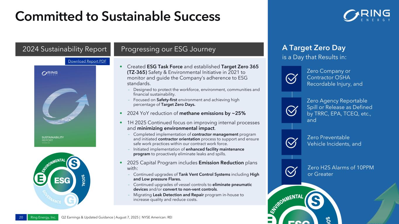 Ring Energy, Inc. Q2 Earnings & Updated Guidance | August 7, 2025 | NYSE American: REI Committed to Sustainable Success 20 2024 Sustainability Report Progressing our ESG Journey A Target Zero Day is a Day that Results in: Zero Company or Contractor OSHA Recordable Injury, and Zero Agency Reportable Spill or Release as Defined by TRRC, EPA, TCEQ, etc., and Zero Preventable Vehicle Incidents, and Zero H2S Alarms of 10PPM or Greater • Created ESG Task Force and established Target Zero 365 (TZ-365) Safety & Environmental Initiative in 2021 to monitor and guide the Company’s adherence to ESG standards. – Designed to protect the workforce, environment, communities and financial sustainability. – Focused on Safety-first environment and achieving high percentage of Target Zero Days. • 2024 YoY reduction of methane emissions by ~25% • 1H 2025 Continued focus on improving internal processes and minimizing environmental impact. – Completed implementation of contractor management program and initiated contractor orientation process to support and ensure safe work practices within our contract work force. – Initiated implementation of enhanced facility maintenance program to proactively eliminate leaks and spills. • 2025 Capital Program includes Emission Reduction plans with: – Continued upgrades of Tank Vent Control Systems including High and Low pressure Flares. – Continued upgrades of vessel controls to eliminate pneumatic devices and/or convert to non-vent controls. – Migrating Leak Detection and Repair program in-house to increase quality and reduce costs. Download Report PDF