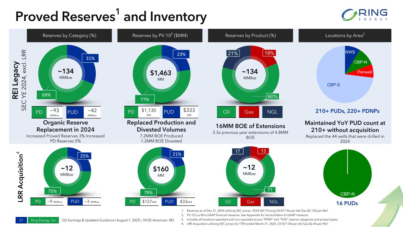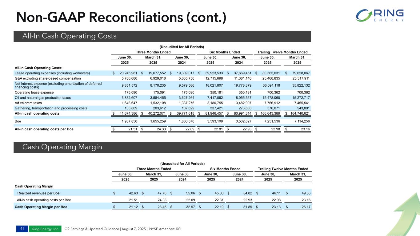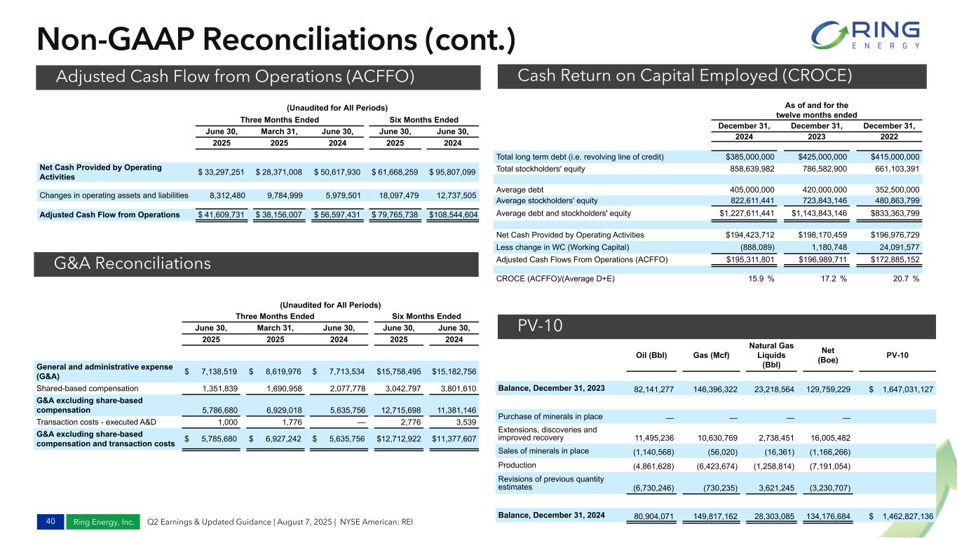 Ring Energy, Inc. Q2 Earnings & Updated Guidance | August 7, 2025 | NYSE American: REI Non-GAAP Reconciliations (cont.) 40 Adjusted Cash Flow from Operations (ACFFO) Cash Return on Capital Employed (CROCE) G&A Reconciliations PV-10 As of and for the twelve months ended December 31, December 31, December 31, 2024 2023 2022 Total long term debt (i.e. revolving line of credit) $385,000,000 $425,000,000 $415,000,000 Total stockholders' equity 858,639,982 786,582,900 661,103,391 Average debt 405,000,000 420,000,000 352,500,000 Average stockholders' equity 822,611,441 723,843,146 480,863,799 Average debt and stockholders' equity $1,227,611,441 $1,143,843,146 $833,363,799 Net Cash Provided by Operating Activities $194,423,712 $198,170,459 $196,976,729 Less change in WC (Working Capital) (888,089) 1,180,748 24,091,577 Adjusted Cash Flows From Operations (ACFFO) $195,311,801 $196,989,711 $172,885,152 CROCE (ACFFO)/(Average D+E) 15.9 % 17.2 % 20.7 % Oil (Bbl) Gas (Mcf) Natural Gas Liquids (Bbl) Net (Boe) PV-10 Balance, December 31, 2023 82,141,277 146,396,322 23,218,564 129,759,229 $ 1,647,031,127 Purchase of minerals in place — — — — Extensions, discoveries and improved recovery 11,495,236 10,630,769 2,738,451 16,005,482 Sales of minerals in place (1,140,568) (56,020) (16,361) (1,166,266) Production (4,861,628) (6,423,674) (1,258,814) (7,191,054) Revisions of previous quantity estimates (6,730,246) (730,235) 3,621,245 (3,230,707) Balance, December 31, 2024 80,904,071 149,817,162 28,303,085 134,176,684 $ 1,462,827,136 (Unaudited for All Periods) Three Months Ended Six Months Ended June 30, March 31, June 30, June 30, June 30, 2025 2025 2024 2025 2024 Net Cash Provided by Operating Activities $ 33,297,251 $ 28,371,008 $ 50,617,930 $ 61,668,259 $ 95,807,099 Changes in operating assets and liabilities 8,312,480 9,784,999 5,979,501 18,097,479 12,737,505 Adjusted Cash Flow from Operations $ 41,609,731 $ 38,156,007 $ 56,597,431 $ 79,765,738 $ 108,544,604 (Unaudited for All Periods) Three Months Ended Six Months Ended June 30, March 31, June 30, June 30, June 30, 2025 2025 2024 2025 2024 General and administrative expense (G&A) $ 7,138,519 $ 8,619,976 $ 7,713,534 $ 15,758,495 $ 15,182,756 Shared-based compensation 1,351,839 1,690,958 2,077,778 3,042,797 3,801,610 G&A excluding share-based compensation 5,786,680 6,929,018 5,635,756 12,715,698 11,381,146 Transaction costs - executed A&D 1,000 1,776 — 2,776 3,539 G&A excluding share-based compensation and transaction costs $ 5,785,680 $ 6,927,242 $ 5,635,756 $ 12,712,922 $ 11,377,607