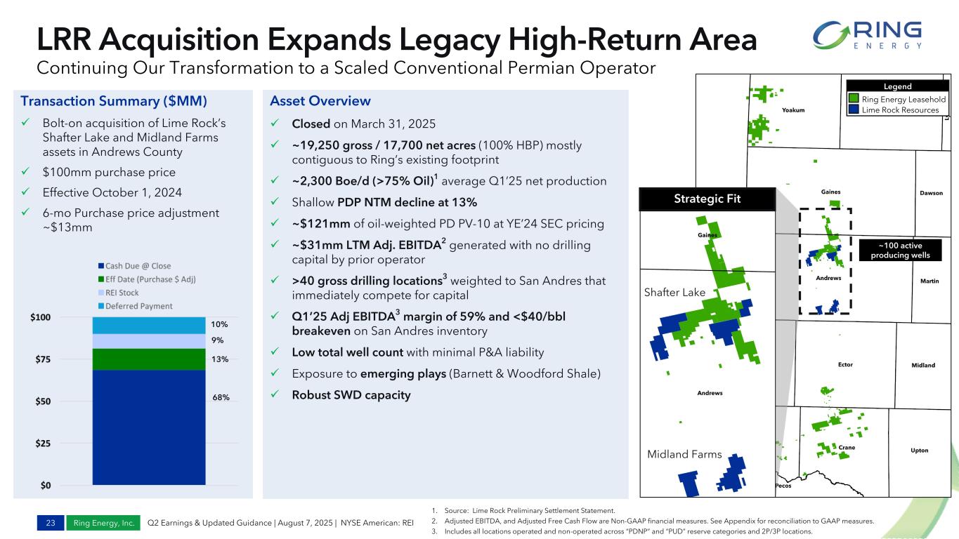Ring Energy, Inc. Q2 Earnings & Updated Guidance | August 7, 2025 | NYSE American: REI LRR Acquisition Expands Legacy High-Return Area 23 Continuing Our Transformation to a Scaled Conventional Permian Operator 1. Source: Lime Rock Preliminary Settlement Statement. 2. Adjusted EBITDA, and Adjusted Free Cash Flow are Non-GAAP financial measures. See Appendix for reconciliation to GAAP measures. 3. Includes all locations operated and non-operated across “PDNP” and “PUD” reserve categories and 2P/3P locations. Asset Overview ü Closed on March 31, 2025 ü ~19,250 gross / 17,700 net acres (100% HBP) mostly contiguous to Ring’s existing footprint ü ~2,300 Boe/d (>75% Oil)1 average Q1’25 net production ü Shallow PDP NTM decline at 13% ü ~$121mm of oil-weighted PD PV-10 at YE’24 SEC pricing ü ~$31mm LTM Adj. EBITDA2 generated with no drilling capital by prior operator ü >40 gross drilling locations3 weighted to San Andres that immediately compete for capital ü Q1’25 Adj EBITDA3 margin of 59% and <$40/bbl breakeven on San Andres inventory ü Low total well count with minimal P&A liability ü Exposure to emerging plays (Barnett & Woodford Shale) ü Robust SWD capacity Transaction Summary ($MM) ü Bolt-on acquisition of Lime Rock’s Shafter Lake and Midland Farms assets in Andrews County ü $100mm purchase price ü Effective October 1, 2024 ü 6-mo Purchase price adjustment ~$13mm Legend Ring Energy Leasehold Lime Rock Resources Strategic Fit Midland Farms Shafter Lake ~100 active producing wells 68% 13% 9% 10%