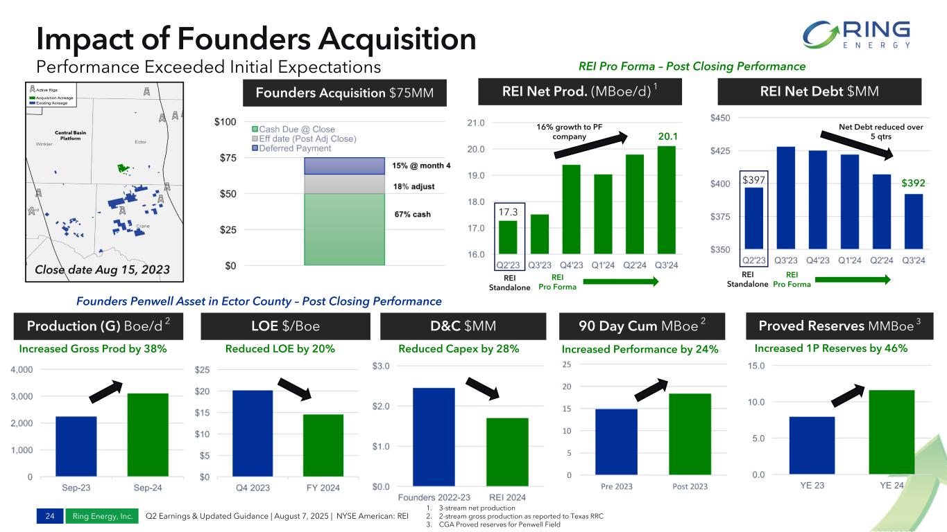 Ring Energy, Inc. Q2 Earnings & Updated Guidance | August 7, 2025 | NYSE American: REI Impact of Founders Acquisition 24 Performance Exceeded Initial Expectations 1. 3-stream net production 2. 2-stream gross production as reported to Texas RRC 3. CGA Proved reserves for Penwell Field Reduced Capex by 28% Founders Acquisition $75MM REI Net Prod. (MBoe/d) 1 REI Net Debt $MM Production (G) Boe/d 2 LOE $/Boe D&C $MM 90 Day Cum MBoe 2 Proved Reserves MMBoe 3 Close date Aug 15, 2023 17.3 REI Standalone REI Pro Forma 20.1 16% growth to PF company REI Standalone $397 $392 Net Debt reduced over 5 qtrs Reduced LOE by 20% Founders Penwell Asset in Ector County – Post Closing Performance REI Pro Forma – Post Closing Performance Increased Gross Prod by 38% Increased 1P Reserves by 46%Increased Performance by 24% REI Pro Forma