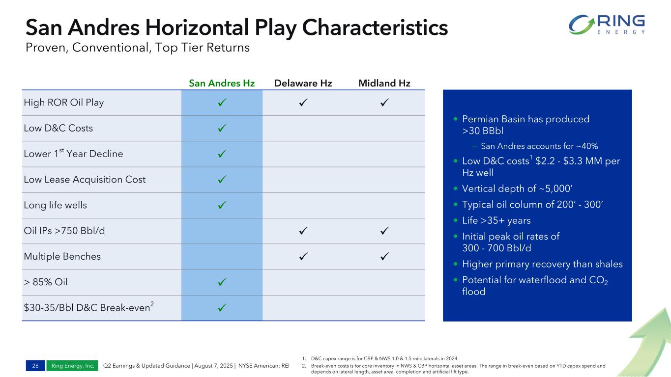Ring Energy, Inc. Q2 Earnings & Updated Guidance | August 7, 2025 | NYSE American: REI Assets Overview 25 New Drill Inventory Performance 2023 vs 2024 (2025 not enough wells drilled YTD for statistical comparison) 1. PJ Lea new drills are 6 frac stages and Penwell new drills are 7 frac stages. Consistent HZ Well Performance San Andres Horizontal Play EUR (MBoe) per 1000’ Lateral Feet Enhanced Vertical Well Performance CBP Vertical Multi-Stacked Play D&C Capex $ per Effective Lateral Foot Vertical D&C Capex1 $ per Frac Stage ($M) 87-91% Oil - l Reduced by 11% Reduced by 3% ~70% Oil ~81% Oil