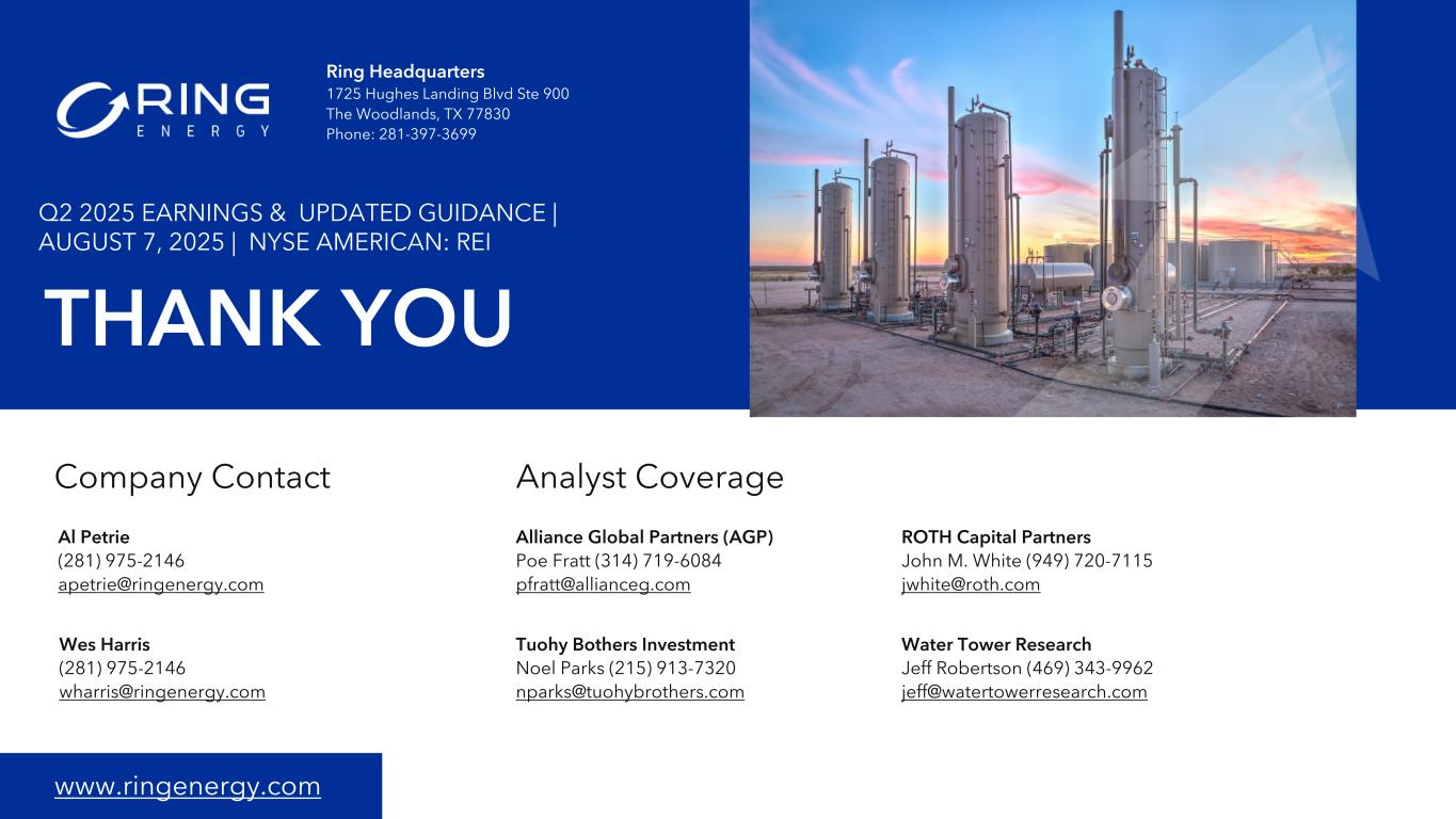 www.ringenergy.com THANK YOU Company Contact Al Petrie (281) 975-2146 apetrie@ringenergy.com Wes Harris (281) 975-2146 wharris@ringenergy.com Analyst Coverage ROTH Capital Partners John M. White (949) 720-7115 jwhite@roth.com Tuohy Bothers Investment Noel Parks (215) 913-7320 nparks@tuohybrothers.com Water Tower Research Jeff Robertson (469) 343-9962 jeff@watertowerresearch.com Ring Headquarters 1725 Hughes Landing Blvd Ste 900 The Woodlands, TX 77830 Phone: 281-397-3699 Alliance Global Partners (AGP) Poe Fratt (314) 719-6084 pfratt@allianceg.com Q2 2025 EARNINGS & UPDATED GUIDANCE | AUGUST 7, 2025 | NYSE AMERICAN: REI