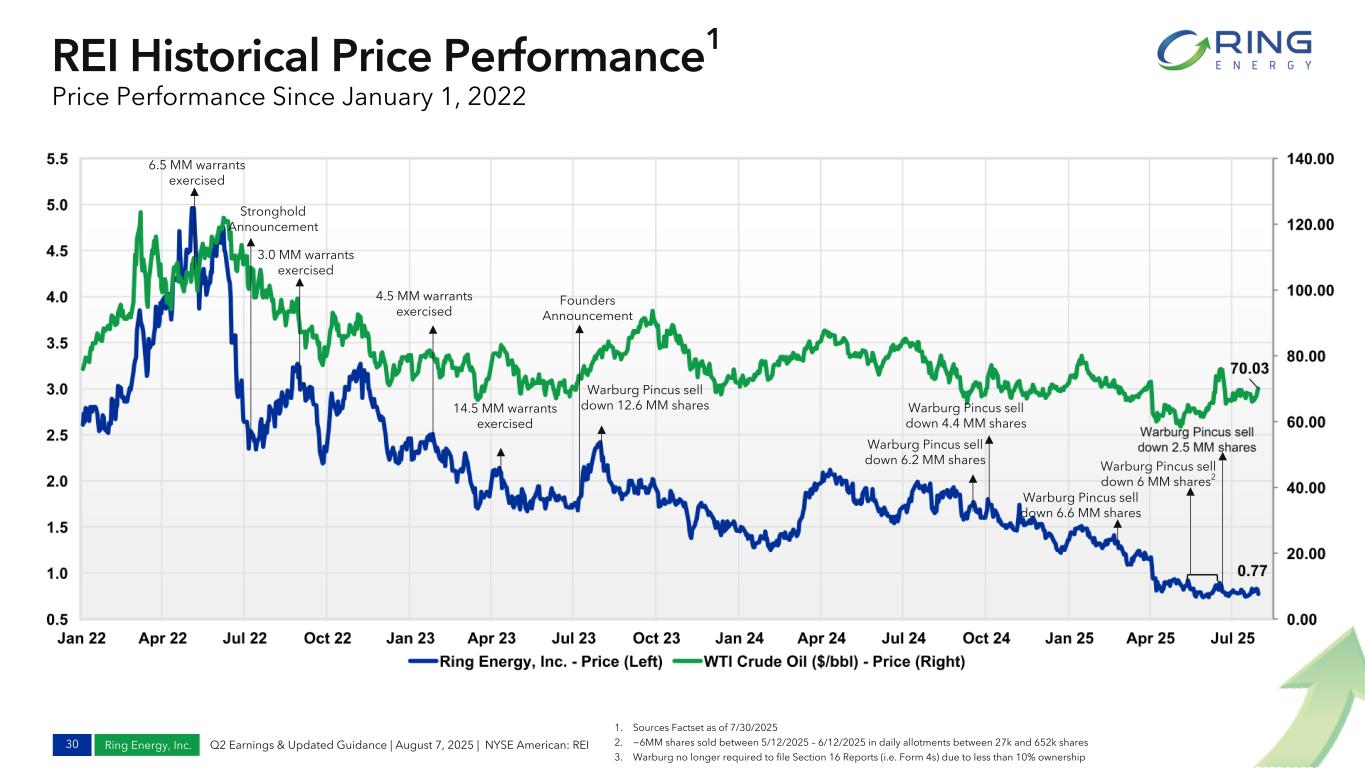 Ring Energy, Inc. Q2 Earnings & Updated Guidance | August 7, 2025 | NYSE American: REI REI Historical Price Performance1 Price Performance Since January 1, 2022 1. Sources Factset as of 7/30/2025 2. ~6MM shares sold between 5/12/2025 – 6/12/2025 in daily allotments between 27k and 652k shares 3. Warburg no longer required to file Section 16 Reports (i.e. Form 4s) due to less than 10% ownership 30 Stronghold Announcement Founders Announcement 6.5 MM warrants exercised 3.0 MM warrants exercised 4.5 MM warrants exercised 14.5 MM warrants exercised Warburg Pincus sell down 12.6 MM shares Warburg Pincus sell down 4.4 MM shares Warburg Pincus sell down 6.2 MM shares Warburg Pincus sell down 6.6 MM shares Warburg Pincus sell down 6 MM shares2