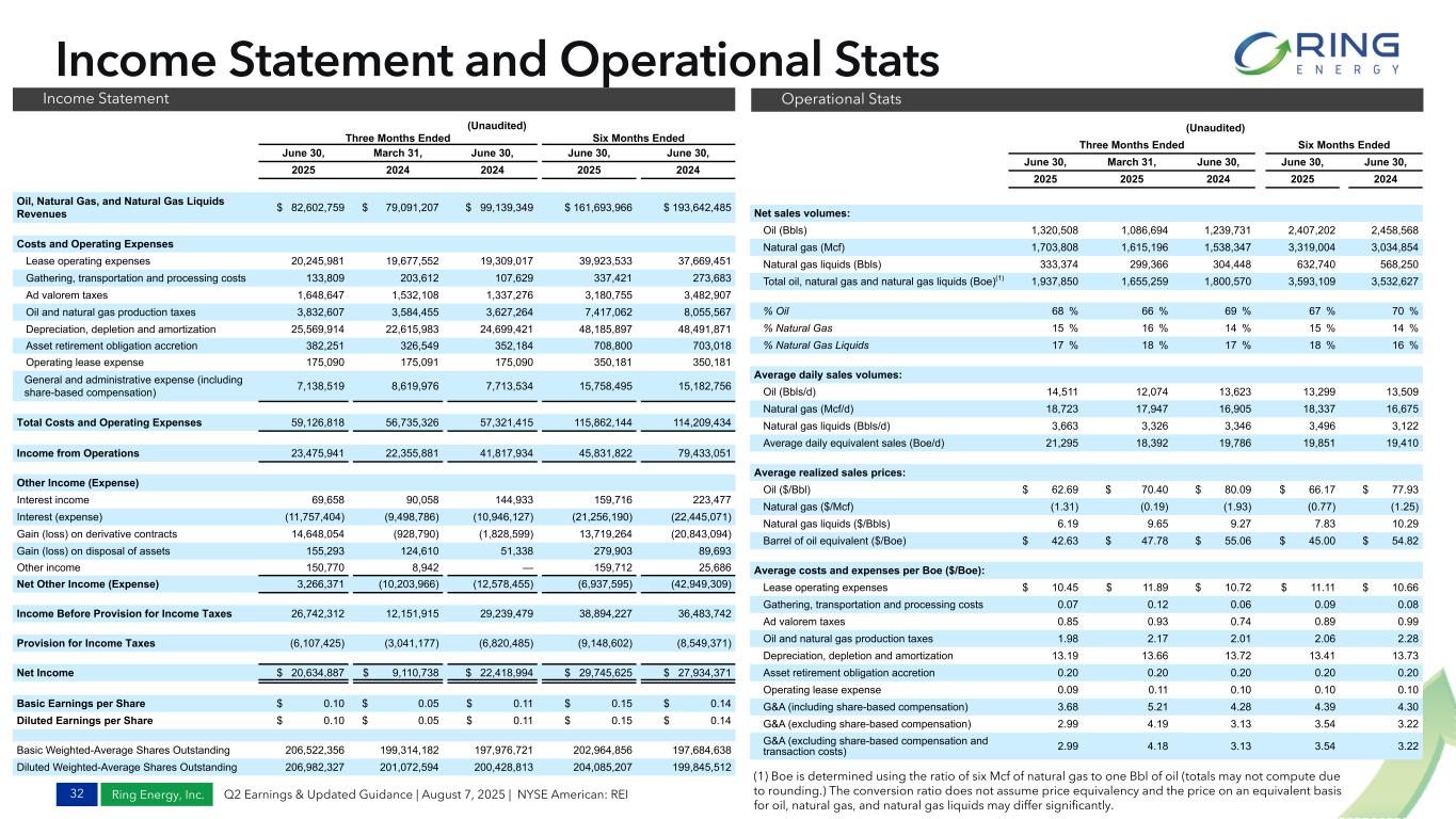 Ring Energy, Inc. Q2 Earnings & Updated Guidance | August 7, 2025 | NYSE American: REI32 Income Statement Operational Stats (1) Boe is determined using the ratio of six Mcf of natural gas to one Bbl of oil (totals may not compute due to rounding.) The conversion ratio does not assume price equivalency and the price on an equivalent basis for oil, natural gas, and natural gas liquids may differ significantly. Income Statement and Operational Stats (Unaudited) Three Months Ended Six Months Ended June 30, March 31, June 30, June 30, June 30, 2025 2024 2024 2025 2024 Oil, Natural Gas, and Natural Gas Liquids Revenues $ 82,602,759 $ 79,091,207 $ 99,139,349 $ 161,693,966 $ 193,642,485 Costs and Operating Expenses Lease operating expenses 20,245,981 19,677,552 19,309,017 39,923,533 37,669,451 Gathering, transportation and processing costs 133,809 203,612 107,629 337,421 273,683 Ad valorem taxes 1,648,647 1,532,108 1,337,276 3,180,755 3,482,907 Oil and natural gas production taxes 3,832,607 3,584,455 3,627,264 7,417,062 8,055,567 Depreciation, depletion and amortization 25,569,914 22,615,983 24,699,421 48,185,897 48,491,871 Asset retirement obligation accretion 382,251 326,549 352,184 708,800 703,018 Operating lease expense 175,090 175,091 175,090 350,181 350,181 General and administrative expense (including share-based compensation) 7,138,519 8,619,976 7,713,534 15,758,495 15,182,756 Total Costs and Operating Expenses 59,126,818 56,735,326 57,321,415 115,862,144 114,209,434 Income from Operations 23,475,941 22,355,881 41,817,934 45,831,822 79,433,051 Other Income (Expense) Interest income 69,658 90,058 144,933 159,716 223,477 Interest (expense) (11,757,404) (9,498,786) (10,946,127) (21,256,190) (22,445,071) Gain (loss) on derivative contracts 14,648,054 (928,790) (1,828,599) 13,719,264 (20,843,094) Gain (loss) on disposal of assets 155,293 124,610 51,338 279,903 89,693 Other income 150,770 8,942 — 159,712 25,686 Net Other Income (Expense) 3,266,371 (10,203,966) (12,578,455) (6,937,595) (42,949,309) Income Before Provision for Income Taxes 26,742,312 12,151,915 29,239,479 38,894,227 36,483,742 Provision for Income Taxes (6,107,425) (3,041,177) (6,820,485) (9,148,602) (8,549,371) Net Income $ 20,634,887 $ 9,110,738 $ 22,418,994 $ 29,745,625 $ 27,934,371 Basic Earnings per Share $ 0.10 $ 0.05 $ 0.11 $ 0.15 $ 0.14 Diluted Earnings per Share $ 0.10 $ 0.05 $ 0.11 $ 0.15 $ 0.14 Basic Weighted-Average Shares Outstanding 206,522,356 199,314,182 197,976,721 202,964,856 197,684,638 Diluted Weighted-Average Shares Outstanding 206,982,327 201,072,594 200,428,813 204,085,207 199,845,512 (Unaudited) Three Months Ended Six Months Ended June 30, March 31, June 30, June 30, June 30, 2025 2025 2024 2025 2024 Net sales volumes: Oil (Bbls) 1,320,508 1,086,694 1,239,731 2,407,202 2,458,568 Natural gas (Mcf) 1,703,808 1,615,196 1,538,347 3,319,004 3,034,854 Natural gas liquids (Bbls) 333,374 299,366 304,448 632,740 568,250 Total oil, natural gas and natural gas liquids (Boe)(1) 1,937,850 1,655,259 1,800,570 3,593,109 3,532,627 % Oil 68 % 66 % 69 % 67 % 70 % % Natural Gas 15 % 16 % 14 % 15 % 14 % % Natural Gas Liquids 17 % 18 % 17 % 18 % 16 % Average daily sales volumes: Oil (Bbls/d) 14,511 12,074 13,623 13,299 13,509 Natural gas (Mcf/d) 18,723 17,947 16,905 18,337 16,675 Natural gas liquids (Bbls/d) 3,663 3,326 3,346 3,496 3,122 Average daily equivalent sales (Boe/d) 21,295 18,392 19,786 19,851 19,410 Average realized sales prices: Oil ($/Bbl) $ 62.69 $ 70.40 $ 80.09 $ 66.17 $ 77.93 Natural gas ($/Mcf) (1.31) (0.19) (1.93) (0.77) (1.25) Natural gas liquids ($/Bbls) 6.19 9.65 9.27 7.83 10.29 Barrel of oil equivalent ($/Boe) $ 42.63 $ 47.78 $ 55.06 $ 45.00 $ 54.82 Average costs and expenses per Boe ($/Boe): Lease operating expenses $ 10.45 $ 11.89 $ 10.72 $ 11.11 $ 10.66 Gathering, transportation and processing costs 0.07 0.12 0.06 0.09 0.08 Ad valorem taxes 0.85 0.93 0.74 0.89 0.99 Oil and natural gas production taxes 1.98 2.17 2.01 2.06 2.28 Depreciation, depletion and amortization 13.19 13.66 13.72 13.41 13.73 Asset retirement obligation accretion 0.20 0.20 0.20 0.20 0.20 Operating lease expense 0.09 0.11 0.10 0.10 0.10 G&A (including share-based compensation) 3.68 5.21 4.28 4.39 4.30 G&A (excluding share-based compensation) 2.99 4.19 3.13 3.54 3.22 G&A (excluding share-based compensation and transaction costs) 2.99 4.18 3.13 3.54 3.22