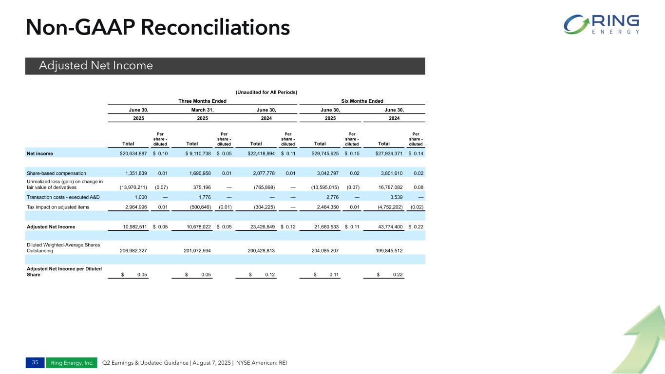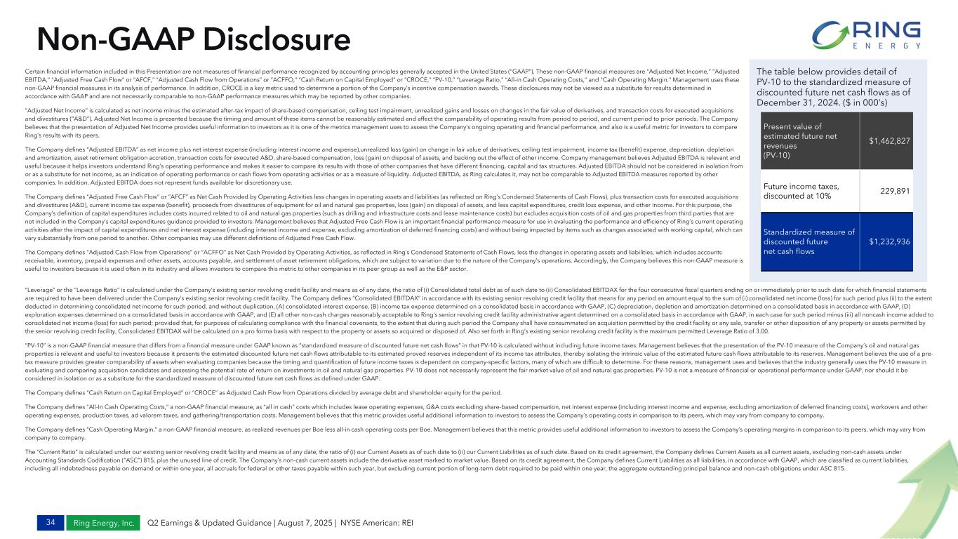 Ring Energy, Inc. Q2 Earnings & Updated Guidance | August 7, 2025 | NYSE American: REI Non-GAAP Disclosure 34 Certain financial information included in this Presentation are not measures of financial performance recognized by accounting principles generally accepted in the United States (“GAAP”). These non-GAAP financial measures are “Adjusted Net Income,” “Adjusted EBITDA,” “Adjusted Free Cash Flow” or “AFCF,” “Adjusted Cash Flow from Operations” or “ACFFO,” “Cash Return on Capital Employed” or “CROCE,” “PV-10,” “Leverage Ratio,” “All-in Cash Operating Costs,” and "Cash Operating Margin." Management uses these non-GAAP financial measures in its analysis of performance. In addition, CROCE is a key metric used to determine a portion of the Company’s incentive compensation awards. These disclosures may not be viewed as a substitute for results determined in accordance with GAAP and are not necessarily comparable to non-GAAP performance measures which may be reported by other companies. “Adjusted Net Income” is calculated as net income minus the estimated after-tax impact of share-based compensation, ceiling test impairment, unrealized gains and losses on changes in the fair value of derivatives, and transaction costs for executed acquisitions and divestitures (“A&D”). Adjusted Net Income is presented because the timing and amount of these items cannot be reasonably estimated and affect the comparability of operating results from period to period, and current period to prior periods. The Company believes that the presentation of Adjusted Net Income provides useful information to investors as it is one of the metrics management uses to assess the Company’s ongoing operating and financial performance, and also is a useful metric for investors to compare Ring’s results with its peers. The Company defines “Adjusted EBITDA” as net income plus net interest expense (including interest income and expense),unrealized loss (gain) on change in fair value of derivatives, ceiling test impairment, income tax (benefit) expense, depreciation, depletion and amortization, asset retirement obligation accretion, transaction costs for executed A&D, share-based compensation, loss (gain) on disposal of assets, and backing out the effect of other income. Company management believes Adjusted EBITDA is relevant and useful because it helps investors understand Ring’s operating performance and makes it easier to compare its results with those of other companies that have different financing, capital and tax structures. Adjusted EBITDA should not be considered in isolation from or as a substitute for net income, as an indication of operating performance or cash flows from operating activities or as a measure of liquidity. Adjusted EBITDA, as Ring calculates it, may not be comparable to Adjusted EBITDA measures reported by other companies. In addition, Adjusted EBITDA does not represent funds available for discretionary use. The Company defines “Adjusted Free Cash Flow” or “AFCF” as Net Cash Provided by Operating Activities less changes in operating assets and liabilities (as reflected on Ring’s Condensed Statements of Cash Flows), plus transaction costs for executed acquisitions and divestitures (A&D), current income tax expense (benefit), proceeds from divestitures of equipment for oil and natural gas properties, loss (gain) on disposal of assets, and less capital expenditures, credit loss expense, and other income. For this purpose, the Company’s definition of capital expenditures includes costs incurred related to oil and natural gas properties (such as drilling and infrastructure costs and lease maintenance costs) but excludes acquisition costs of oil and gas properties from third parties that are not included in the Company’s capital expenditures guidance provided to investors. Management believes that Adjusted Free Cash Flow is an important financial performance measure for use in evaluating the performance and efficiency of Ring’s current operating activities after the impact of capital expenditures and net interest expense (including interest income and expense, excluding amortization of deferred financing costs) and without being impacted by items such as changes associated with working capital, which can vary substantially from one period to another. Other companies may use different definitions of Adjusted Free Cash Flow. The Company defines “Adjusted Cash Flow from Operations” or “ACFFO” as Net Cash Provided by Operating Activities, as reflected in Ring’s Condensed Statements of Cash Flows, less the changes in operating assets and liabilities, which includes accounts receivable, inventory, prepaid expenses and other assets, accounts payable, and settlement of asset retirement obligations, which are subject to variation due to the nature of the Company’s operations. Accordingly, the Company believes this non-GAAP measure is useful to investors because it is used often in its industry and allows investors to compare this metric to other companies in its peer group as well as the E&P sector. The table below provides detail of PV-10 to the standardized measure of discounted future net cash flows as of December 31, 2024. ($ in 000’s) Present value of estimated future net revenues (PV-10) $1,462,827 Future income taxes, discounted at 10% 229,891 Standardized measure of discounted future net cash flows $1,232,936 “Leverage” or the “Leverage Ratio” is calculated under the Company’s existing senior revolving credit facility and means as of any date, the ratio of (i) Consolidated total debt as of such date to (ii) Consolidated EBITDAX for the four consecutive fiscal quarters ending on or immediately prior to such date for which financial statements are required to have been delivered under the Company’s existing senior revolving credit facility. The Company defines “Consolidated EBITDAX” in accordance wit