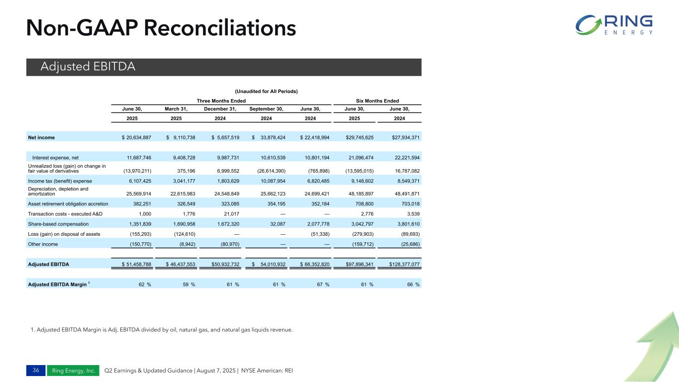 Ring Energy, Inc. Q2 Earnings & Updated Guidance | August 7, 2025 | NYSE American: REI Non-GAAP Reconciliations 35 Adjusted Net Income (Unaudited for All Periods) Three Months Ended Six Months Ended June 30, March 31, June 30, June 30, June 30, 2025 2025 2024 2025 2024 Total Per share - diluted Total Per share - diluted Total Per share - diluted Total Per share - diluted Total Per share - diluted Net income $ 20,634,887 $ 0.10 $ 9,110,738 $ 0.05 $ 22,418,994 $ 0.11 $ 29,745,625 $ 0.15 $ 27,934,371 $ 0.14 Share-based compensation 1,351,839 0.01 1,690,958 0.01 2,077,778 0.01 3,042,797 0.02 3,801,610 0.02 Unrealized loss (gain) on change in fair value of derivatives (13,970,211) (0.07) 375,196 — (765,898) — (13,595,015) (0.07) 16,787,082 0.08 Transaction costs - executed A&D 1,000 — 1,776 — — — 2,776 — 3,539 — Tax impact on adjusted items 2,964,996 0.01 (500,646) (0.01) (304,225) — 2,464,350 0.01 (4,752,202) (0.02) Adjusted Net Income 10,982,511 $ 0.05 10,678,022 $ 0.05 23,426,649 $ 0.12 21,660,533 $ 0.11 43,774,400 $ 0.22 Diluted Weighted-Average Shares Outstanding 206,982,327 201,072,594 200,428,813 204,085,207 199,845,512 Adjusted Net Income per Diluted Share $ 0.05 $ 0.05 $ 0.12 $ 0.11 $ 0.22