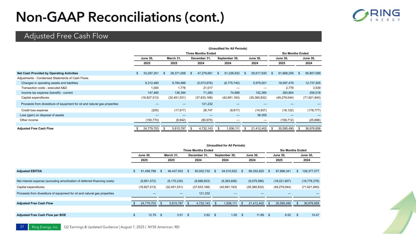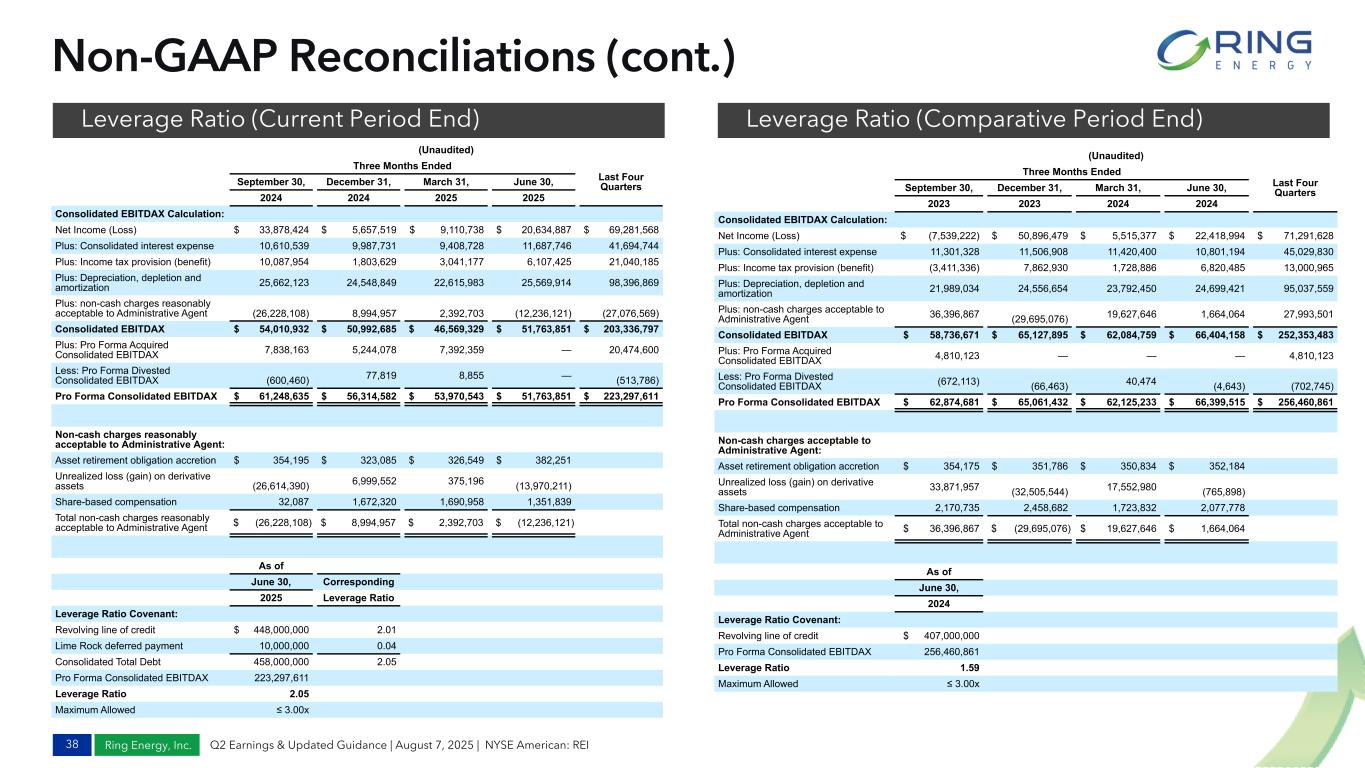 Ring Energy, Inc. Q2 Earnings & Updated Guidance | August 7, 2025 | NYSE American: REI Non-GAAP Reconciliations (cont.) 37 Adjusted Free Cash Flow (Unaudited for All Periods) Three Months Ended Six Months Ended June 30, March 31, December 31, September 30, June 30, June 30, June 30, 2025 2025 2024 2024 2024 2025 2024 Net Cash Provided by Operating Activities $ 33,297,251 $ 28,371,008 $ 47,279,681 $ 51,336,932 $ 50,617,930 $ 61,668,259 $ 95,807,099 Adjustments - Condensed Statements of Cash Flows Changes in operating assets and liabilities 8,312,480 9,784,999 (5,073,676) (6,775,740) 5,979,501 18,097,479 12,737,505 Transaction costs - executed A&D 1,000 1,776 21,017 — — 2,776 3,539 Income tax expense (benefit) - current 147,460 136,394 71,280 74,899 152,385 283,854 255,018 Capital expenditures (16,827,513) (32,451,531) (37,633,168) (42,691,163) (35,360,832) (49,279,044) (71,621,840) Proceeds from divestiture of equipment for oil and natural gas properties — — 121,232 — — — — Credit loss expense (205) (17,917) 26,747 (8,817) (14,937) (18,122) (178,777) Loss (gain) on disposal of assets — — — — 38,355 — — Other income (150,770) (8,942) (80,970) — — (159,712) (25,686) Adjusted Free Cash Flow $ 24,779,703 $ 5,815,787 $ 4,732,143 $ 1,936,111 $ 21,412,402 $ 30,595,490 $ 36,976,858 (Unaudited for All Periods) Three Months Ended Six Months Ended June 30, March 31, December 31, September 30, June 30, June 30, June 30, 2025 2025 2024 2024 2024 2025 2024 Adjusted EBITDA $ 51,458,788 $ 46,437,553 $ 50,932,732 $ 54,010,932 $ 66,352,820 $ 97,896,341 $ 128,377,077 Net interest expense (excluding amortization of deferred financing costs) (9,851,572) (8,170,235) (8,688,653) (9,383,658) (9,579,586) (18,021,807) (19,778,379) Capital expenditures (16,827,513) (32,451,531) (37,633,168) (42,691,163) (35,360,832) (49,279,044) (71,621,840) Proceeds from divestiture of equipment for oil and natural gas properties — — 121,232 — — — — Adjusted Free Cash Flow $ 24,779,703 $ 5,815,787 $ 4,732,143 $ 1,936,111 $ 21,412,402 $ 30,595,490 $ 36,976,858 Adjusted Free Cash Flow per BOE $ 12.79 $ 3.51 $ 2.62 $ 1.05 $ 11.89 $ 8.52 $ 10.47